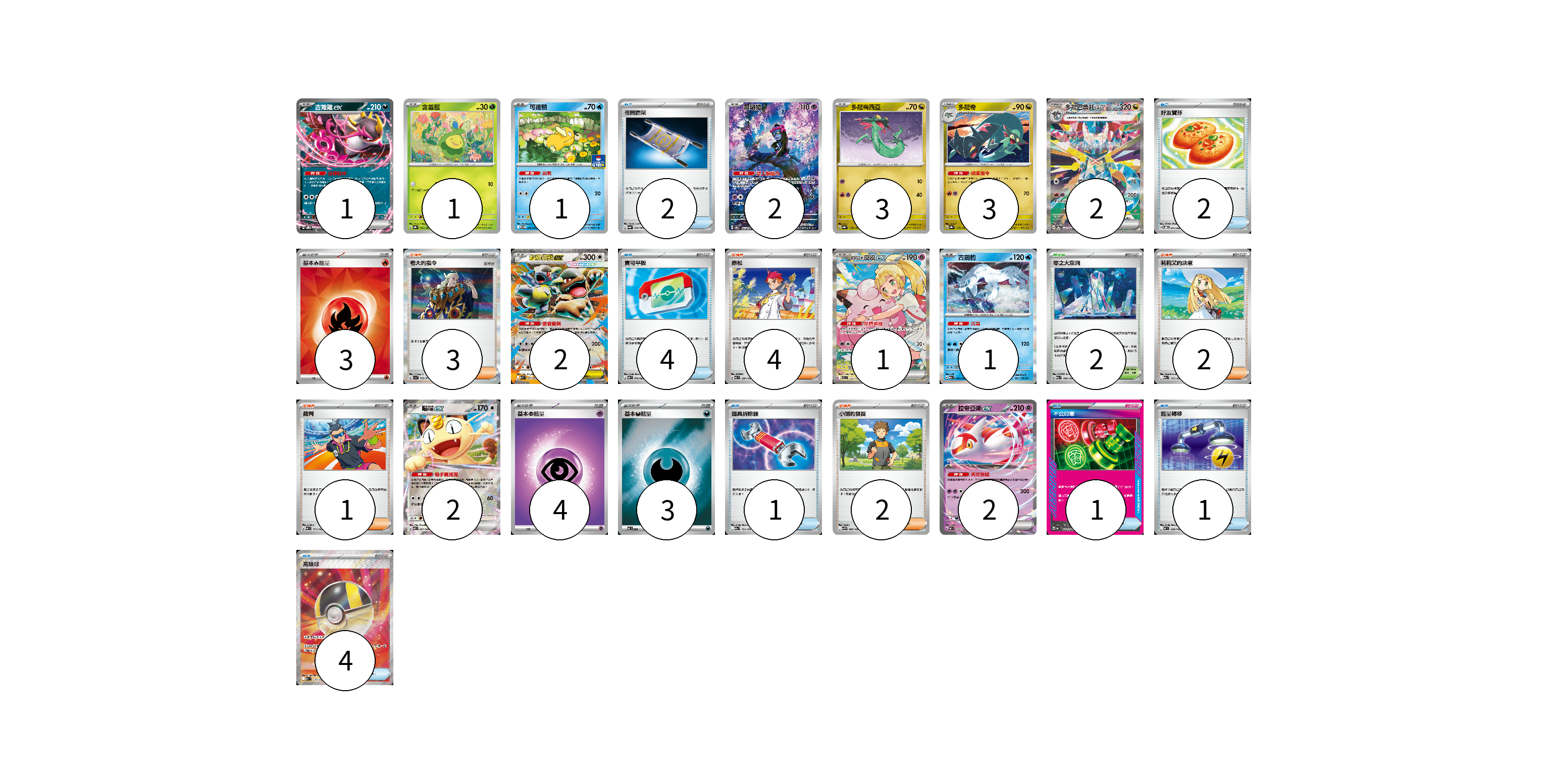 牌組構築方案 以此牌組為基礎新構築牌組 顯示卡面 顯示列表 寶可夢卡(21) 1 1 1 2 3 3 2 2 1 1 2 2 物品卡(15) 2 2 4 1 1 1 4 支援者卡(12) 3 4 2 1 2 競技場卡(2) 2 能量卡(10) 3 4 3 寶可夢卡(21) 卡牌名稱 張數 卡牌名稱 張數 吉雉雞ex SVOD 004/020 01 含羞苞 SV8a 001/187 01 可達鴨 SV-P 220/SV-P 01 願增猿 SV6 107/101 02 多龍梅西亞 SV8a 118/187 03 多龍奇 SV8a 119/187 03 多龍巴魯托ex SV8a 221/187 02 超級袋獸ex M1S 051/063 02 莉莉艾的皮皮ex MC 765/742 01 古劍豹 M2a 043/193 01 喵喵ex M3 061/080 02 拉帝亞斯ex MC 312/742 02 物品卡(15) 卡牌名稱 張數 卡牌名稱 張數 夜間擔架 SV6a 056/064 02 好友寶芬 SVOD 011/020 02 寶可平板 M3 070/080 04 道具拆除器 M2a 151/193 01 不公印章 MC 633/742 01 能量轉移 MC 638/742 01 高級球 M2a 216/193 04 支援者卡(12) 卡牌名稱 張數 卡牌名稱 張數 老大的指令 SV1a 069/073 03 赤松 MC 696/742 04 莉莉艾的決意 M2a 175/193 02 裁判 MC 711/742 01 小剛的發掘 SV9 096/100 02 競技場卡(2) 卡牌名稱 張數 卡牌名稱 張數 零之大空洞 M2a 184/193 02 能量卡(10) 卡牌名稱 張數 卡牌名稱 張數 基本【火】能量 SVM FIR 03 基本【超】能量 MC PSY 04 基本【惡】能量 MC DAR 03 以此牌組為基礎新構築牌組 牌組編碼 dWAPBM-sebUPx-amLOwT copy 列印牌組單 牌組編碼已複製 分享至SNS