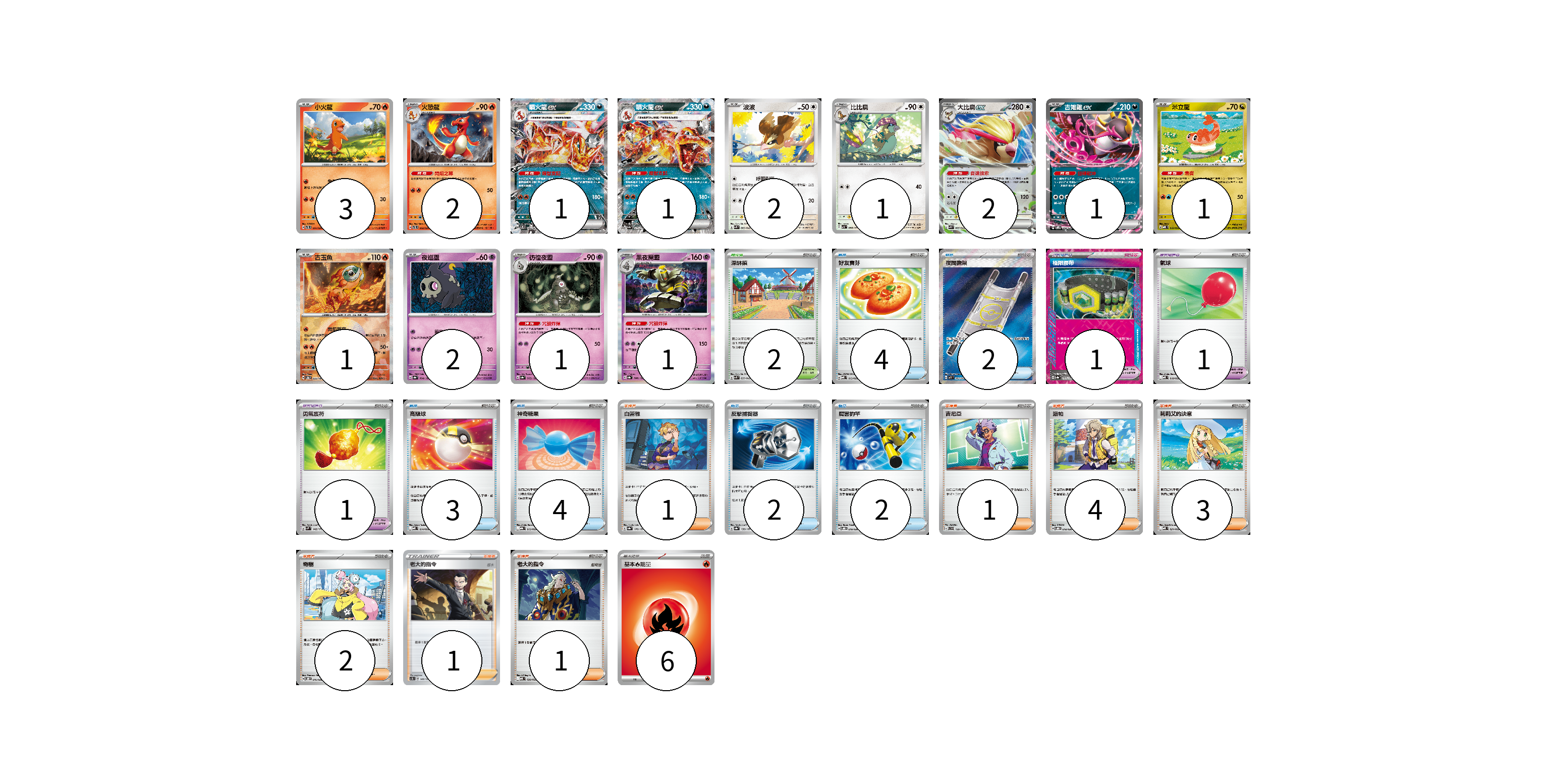 牌組構築方案 以此牌組為基礎新構築牌組 顯示卡面 顯示列表 寶可夢卡(19) 3 2 1 1 2 1 2 1 1 1 2 1 1 寶可夢道具(3) 1 1 1 物品卡(17) 4 2 3 4 2 2 支援者卡(13) 1 1 4 3 2 1 1 競技場卡(2) 2 能量卡(6) 6 寶可夢卡(19) 卡牌名稱 張數 卡牌名稱 張數 小火龍 SVTL 001/021 03 火恐龍 SVTL 002/021 02 噴火龍ex SVTL 006/021 01 噴火龍ex SV4a 115/190 01 波波 SVK 003/042 02 比比鳥 SV3 088/108 01 大比鳥ex SVK 005/042 02 吉雉雞ex SVOM 009/021 01 米立龍 MBD 010/022 01 古玉魚 SV8a 025/187 01 夜巡靈 SV8a 064/187 02 彷徨夜靈 SV8a 065/187 01 黑夜魔靈 SV8a 066/187 01 寶可夢道具(3) 卡牌名稱 張數 卡牌名稱 張數 極限腰帶 SV8a 159/187 01 氣球 MBD 018/022 01 勇氣護符 SVM 142/175 01 物品卡(17) 卡牌名稱 張數 卡牌名稱 張數 好友寶芬 MBD 013/022 04 夜間擔架 M1L 083/063 02 高級球 MBD 014/022 03 神奇糖果 MBG 013/022 04 反擊捕捉器 SV8a 139/187 02 厲害釣竿 SVOD 010/020 02 支援者卡(13) 卡牌名稱 張數 卡牌名稱 張數 白蕾雅 SV8a 176/187 01 吉尼亞 SVD 129/139 01 派帕 SVOD 018/020 04 莉莉艾的決意 MBD 021/022 03 奇樹 SVOD 016/020 02 老大的指令(坂木) SC1b 148/153 01 老大的指令 MBD 020/022 01 競技場卡(2) 卡牌名稱 張數 卡牌名稱 張數 深缽鎮 SVK 039/042 02 能量卡(6) 卡牌名稱 張數 卡牌名稱 張數 基本【火】能量 SVTL FIR 06 以此牌組為基礎新構築牌組 牌組編碼 dWiQRg-wYqWTH-eTmYhO copy 列印牌組單 牌組編碼已複製 分享至SNS