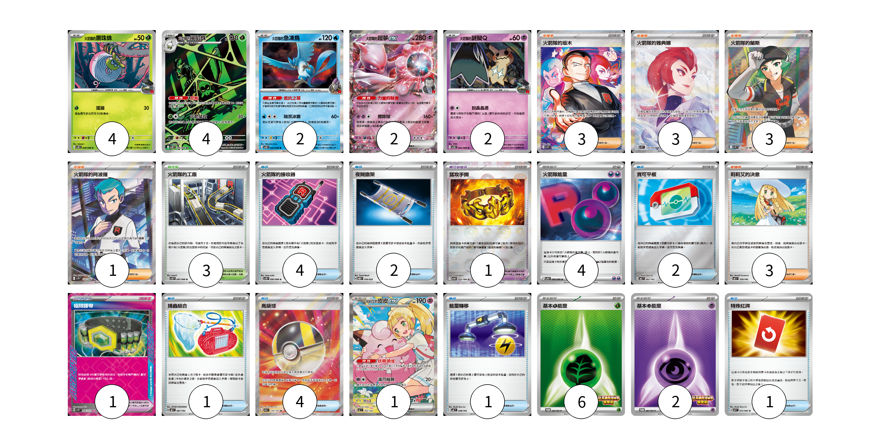 牌組構築方案 以此牌組為基礎新構築牌組 顯示卡面 顯示列表 寶可夢卡(15) 4 4 2 2 2 1 寶可夢道具(2) 1 1 物品卡(15) 4 2 2 1 4 1 1 支援者卡(13) 3 3 3 1 3 競技場卡(3) 3 能量卡(12) 4 6 2 寶可夢卡(15) 卡牌名稱 張數 卡牌名稱 張數 <火箭隊的>團珠蛛 SV10 008/098 04 <火箭隊的>操陷蛛 SV10 099/098 04 <火箭隊的>急凍鳥 SV10 022/098 02 <火箭隊的>超夢ex SV10 039/098 02 <火箭隊的>謎擬Q SV10 042/098 02 莉莉艾的皮皮ex MC 765/742 01 寶可夢道具(2) 卡牌名稱 張數 卡牌名稱 張數 猛攻手鐲 SV11W 082/086 01 極限腰帶 SV5K 066/071 01 物品卡(15) 卡牌名稱 張數 卡牌名稱 張數 火箭隊的接收器 SV10 090/098 04 夜間擔架 MBD 016/022 02 寶可平板 MC 662/742 02 捕蟲組合 MC 667/742 01 高級球 M2a 216/193 04 能量轉移 MC 638/742 01 特殊紅牌 M4 072/083 01 支援者卡(13) 卡牌名稱 張數 卡牌名稱 張數 火箭隊的坂木 SV10 129/098 03 火箭隊的雅典娜 SV10 128/098 03 火箭隊的蘭斯 SV10 123/098 03 火箭隊的阿波羅 SV10 120/098 01 莉莉艾的決意 MC 729/742 03 競技場卡(3) 卡牌名稱 張數 卡牌名稱 張數 火箭隊的工廠 SV10 097/098 03 能量卡(12) 卡牌名稱 張數 卡牌名稱 張數 火箭隊能量 SV10 098/098 04 基本【草】能量 SV-P 257/SV-P 06 基本【超】能量 SV-P 261/SV-P 02 以此牌組為基礎新構築牌組 牌組編碼 dcgcCV-hFQSpf-sYNzyz copy 列印牌組單 牌組編碼已複製 分享至SNS