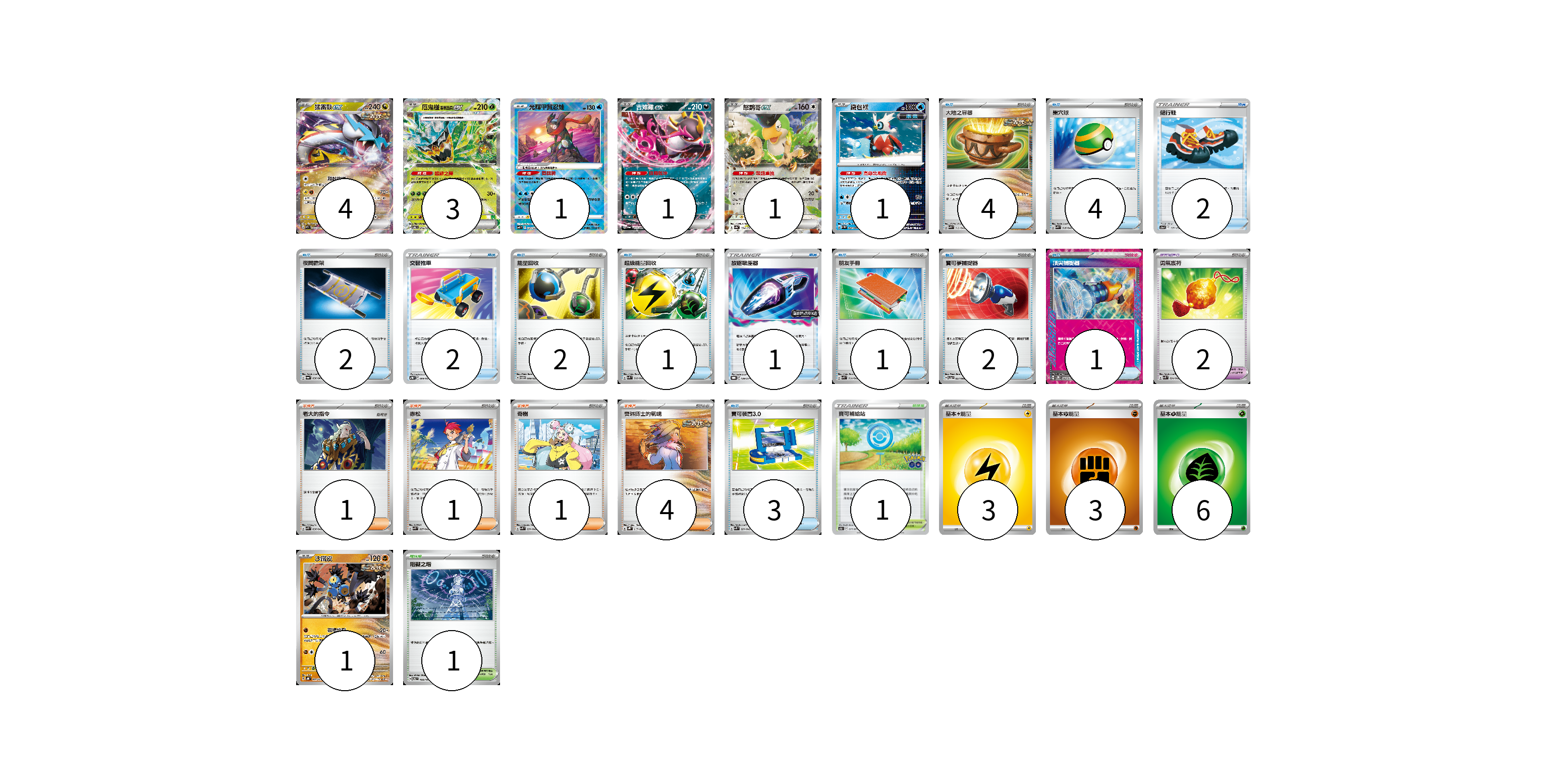 牌組構築方案 以此牌組為基礎新構築牌組 顯示卡面 顯示列表 寶可夢卡(12) 4 3 1 1 1 1 1 寶可夢道具(2) 2 物品卡(25) 4 4 2 2 2 2 1 1 1 2 1 3 支援者卡(7) 1 1 1 4 競技場卡(2) 1 1 能量卡(12) 3 3 6 寶可夢卡(12) 卡牌名稱 張數 卡牌名稱 張數 猛雷鼓ex SV5K 053/071 04 厄鬼椪 碧草面具ex SV6 016/101 03 光輝甲賀忍蛙 SVF 004/038 01 吉雉雞ex SV6a 038/064 01 怒鸚哥ex SV4a 154/190 01 鐵包袱 SV4M 020/066 01 沙鐵皮 SVHK 009/022 01 寶可夢道具(2) 卡牌名稱 張數 卡牌名稱 張數 勇氣護符 SVK 024/042 02 物品卡(25) 卡牌名稱 張數 卡牌名稱 張數 大地之容器 SVK 012/042 04 巢穴球 SVK 016/042 04 健行鞋 S12a 137/172 02 夜間擔架 SV6a 056/064 02 交替推車 SVTR 009/021 02 能量回收 SVTM 009/022 02 超級能量回收 SVK 010/042 01 放逐吸塵器 SV-P 139/SV-P 01 朋友手冊 SVK 014/042 01 寶可夢捕捉器 SV5a 057/066 02 頂尖捕捉器 SV5M 062/071 01 寶可裝置3.0 SVK 021/042 03 支援者卡(7) 卡牌名稱 張數 卡牌名稱 張數 老大的指令 SVK 036/042 01 赤松 SVK 027/042 01 奇樹 SVK 031/042 01 奧琳博士的氣魄 SVHK 017/022 04 競技場卡(2) 卡牌名稱 張數 卡牌名稱 張數 寶可補給站 S10b 071/071 01 阻礙之塔 SV6 100/101 01 能量卡(12) 卡牌名稱 張數 卡牌名稱 張數 基本雷能量 sv-p LIG 03 基本鬥能量 sv-p FIG 03 基本草能量 sv-p GRA 06 以此牌組為基礎新構築牌組 牌組編碼 dfJMPN-oMllwr-mhUqkS copy 列印牌組單 牌組編碼已複製 分享至SNS