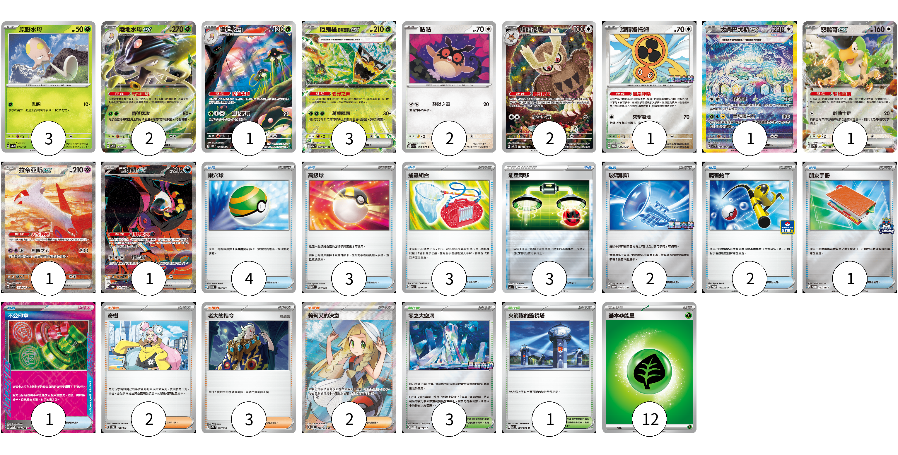 牌組構築方案 以此牌組為基礎新構築牌組 顯示卡面 顯示列表 寶可夢卡(18) 3 2 1 3 2 2 1 1 1 1 1 物品卡(19) 4 3 3 3 2 2 1 1 支援者卡(7) 2 3 2 競技場卡(4) 3 1 能量卡(12) 12 寶可夢卡(18) 卡牌名稱 張數 卡牌名稱 張數 原野水母 SV4a 018/190 03 陸地水母ex SVP1 002/007 02 陸地水母 SV4M 068/066 01 厄鬼椪 碧草面具ex SV8a 020/187 03 咕咕 SV5K 054/071 02 貓頭夜鷹 SV7 114/102 02 旋轉洛托姆 SV-P 146/SV-P 01 太樂巴戈斯ex SV7 130/102 01 怒鸚哥ex SV2P 065/071 01 拉帝亞斯ex SV7a 087/064 01 吉雉雞ex SV6a 089/064 01 物品卡(19) 卡牌名稱 張數 卡牌名稱 張數 巢穴球 SVTR 013/021 04 高級球 SVTS 014/022 03 捕蟲組合 SV8a 150/187 03 能量轉移 SO 017/030 03 玻璃喇叭 SV-P 149/SV-P 02 厲害釣竿 SV-P 112/SV-P 02 朋友手冊 SV-P 182/SV-P 01 不公印章 SV5a 053/066 01 支援者卡(7) 卡牌名稱 張數 卡牌名稱 張數 奇樹 SVM 160/175 02 老大的指令 SVTH 017/018 03 莉莉艾的決意 M1L 086/063 02 競技場卡(4) 卡牌名稱 張數 卡牌名稱 張數 零之大空洞 SV-P 151/SV-P 03 火箭隊的監視塔 SV10 096/098 01 能量卡(12) 卡牌名稱 張數 卡牌名稱 張數 基本【草】能量 M-P GRA 12 以此牌組為基礎新構築牌組 牌組編碼 dgYJCD-gusjvJ-uVcqYA copy 列印牌組單 牌組編碼已複製 分享至SNS