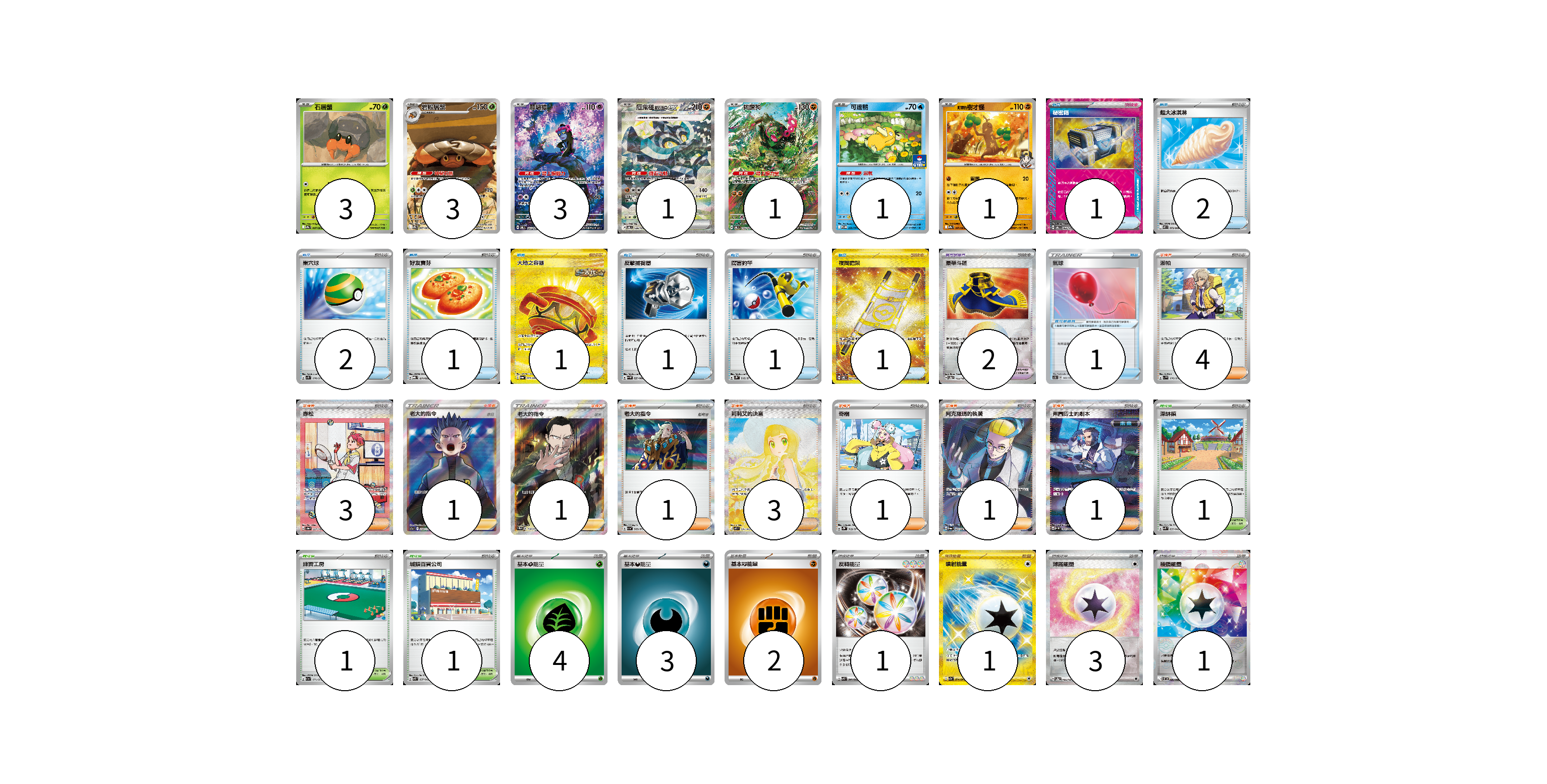 牌組構築方案 以此牌組為基礎新構築牌組 顯示卡面 顯示列表 寶可夢卡(13) 3 3 3 1 1 1 1 寶可夢道具(3) 2 1 物品卡(10) 1 2 2 1 1 1 1 1 支援者卡(16) 4 3 1 1 1 3 1 1 1 競技場卡(3) 1 1 1 能量卡(15) 4 3 2 1 1 3 1 寶可夢卡(13) 卡牌名稱 張數 卡牌名稱 張數 石居蟹 SV9a 007/063 03 岩殿居蟹 SV9a 067/063 03 願增猿 SV6 107/101 03 厄鬼椪 礎石面具ex SV6 128/101 01 夠讚狗 SV6 110/101 01 可達鴨 SV-P 220/SV-P 01 <阿響的>樹才怪 SV9a 041/063 01 寶可夢道具(3) 卡牌名稱 張數 卡牌名稱 張數 豪華斗篷 SV8a 155/187 02 氣球 SC1b 142/153 01 物品卡(10) 卡牌名稱 張數 卡牌名稱 張數 秘密箱 SV6 092/101 01 超大冰淇淋 M2 073/080 02 巢穴球 SV1S 070/078 02 好友寶芬 MBG 011/022 01 大地之容器 SV6a 093/064 01 反擊捕捉器 SV4M 059/066 01 厲害釣竿 SV2P 066/071 01 夜間擔架 SV8 137/106 01 支援者卡(16) 卡牌名稱 張數 卡牌名稱 張數 派帕 SV1V 076/078 04 赤松 SV8a 227/187 03 老大的指令(赤日) S12a 250/172 01 老大的指令(坂木) SC1b 170/153 01 老大的指令 SV1a 069/073 01 莉莉艾的決意 M1L 091/063 03 奇樹 SV2D 069/071 01 阿克羅瑪的執著 SV6a 083/064 01 弗圖博士的劇本 SV4M 091/066 01 競技場卡(3) 卡牌名稱 張數 卡牌名稱 張數 深缽鎮 SVK 039/042 01 練習工房 SV1a 071/073 01 城鎮百貨公司 SVK 037/042 01 能量卡(15) 卡牌名稱 張數 卡牌名稱 張數 基本草能量 sv-p GRA 04 基本惡能量 sv-p DAR 03 基本【鬥】能量 SVAM FIG 02 反轉能量 SVK 041/042 01 噴射能量 SV7a 094/064 01 薄霧能量 SV8a 186/187 03 稜鏡能量 SV11B 086/086 01 以此牌組為基礎新構築牌組 牌組編碼 diibUj-wIpOIG-bONNIZ copy 列印牌組單 牌組編碼已複製 分享至SNS