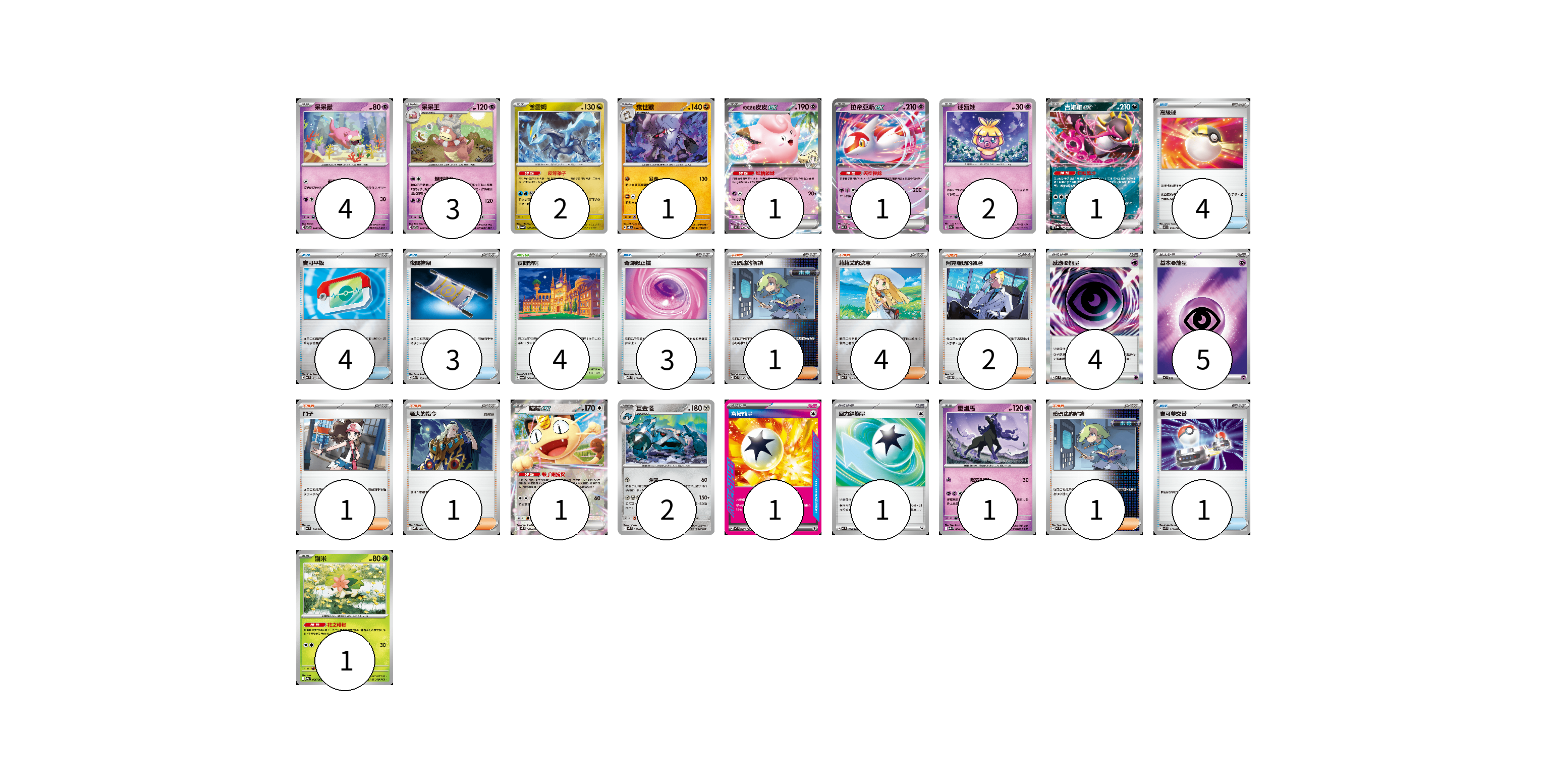 牌組構築方案 以此牌組為基礎新構築牌組 顯示卡面 顯示列表 寶可夢卡(20) 4 3 2 1 1 1 2 1 1 2 1 1 物品卡(15) 4 4 3 3 1 支援者卡(10) 1 4 2 1 1 1 競技場卡(4) 4 能量卡(11) 4 5 1 1 寶可夢卡(20) 卡牌名稱 張數 卡牌名稱 張數 呆呆獸 SV7 038/102 04 呆呆王 SV7 039/102 03 酋雷姆 SV6a 047/064 02 棄世猴 SV8 062/106 01 <莉莉艾的>皮皮ex MC 287/742 01 拉帝亞斯ex MC 312/742 01 迷唇娃 SV7a 018/064 02 吉雉雞ex SV8a 104/187 01 喵喵ex M3 061/080 01 巨金怪 M4 059/083 02 靈幽馬 M2a 080/193 01 謝米 SV9a 006/063 01 物品卡(15) 卡牌名稱 張數 卡牌名稱 張數 高級球 MC 651/742 04 寶可平板 MC 662/742 04 夜間擔架 M2a 159/193 03 奇跡修正檔 MBD 017/022 03 寶可夢交替 MJ 019/022 01 支援者卡(10) 卡牌名稱 張數 卡牌名稱 張數 暗碼迷的解讀 MC 698/742 01 莉莉艾的決意 MC 729/742 04 阿克羅瑪的執著 SVOM 017/021 02 鬥子 MC 718/742 01 老大的指令 MBD 020/022 01 暗碼迷的解讀 MC 698/742 01 競技場卡(4) 卡牌名稱 張數 卡牌名稱 張數 夜間學院 SV6a 064/064 04 能量卡(11) 卡牌名稱 張數 卡牌名稱 張數 感應【超】能量 M3 079/080 04 基本【超】能量 MC PSY 05 富裕能量 MC 740/742 01 回力鏢能量 MC 738/742 01 以此牌組為基礎新構築牌組 牌組編碼 dkItyu-YRuero-krzsML copy 列印牌組單 牌組編碼已複製 分享至SNS