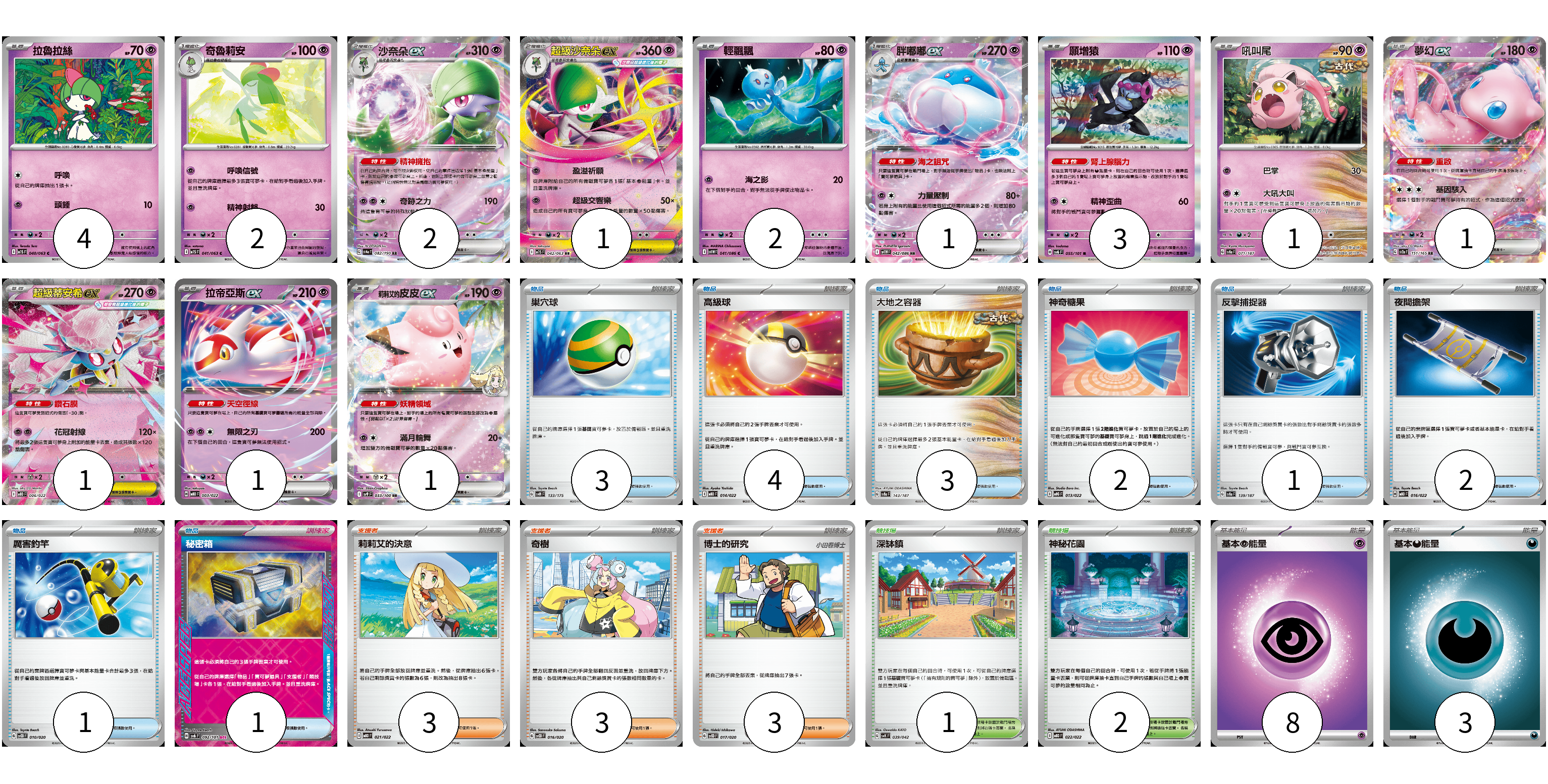 牌組構築方案 以此牌組為基礎新構築牌組 顯示卡面 顯示列表 寶可夢卡(20) 4 2 2 1 2 1 3 1 1 1 1 1 物品卡(17) 3 4 3 2 1 2 1 1 支援者卡(9) 3 3 3 競技場卡(3) 1 2 能量卡(11) 8 3 寶可夢卡(20) 卡牌名稱 張數 卡牌名稱 張數 拉魯拉絲 M1S 040/063 04 奇魯莉安 M1S 041/063 02 沙奈朵ex SV4a 082/190 02 超級沙奈朵ex M1S 042/063 01 輕飄飄 SV11W 041/086 02 胖嘟嘟ex SV11W 042/086 01 願增猿 SV6 055/101 03 吼叫尾 SV8a 071/187 01 夢幻ex SV2a 151/165 01 超級蒂安希ex MBD 006/022 01 拉帝亞斯ex MBD 003/022 01 莉莉艾的皮皮ex SV9 033/100 01 物品卡(17) 卡牌名稱 張數 卡牌名稱 張數 巢穴球 SVM 133/175 03 高級球 MBD 014/022 04 大地之容器 SV8a 143/187 03 神奇糖果 MBG 013/022 02 反擊捕捉器 SV8a 139/187 01 夜間擔架 MBD 016/022 02 厲害釣竿 SVOD 010/020 01 秘密箱 SV6 092/101 01 支援者卡(9) 卡牌名稱 張數 卡牌名稱 張數 莉莉艾的決意 MBD 021/022 03 奇樹 SVOD 016/020 03 博士的研究 SVOD 017/020 03 競技場卡(3) 卡牌名稱 張數 卡牌名稱 張數 深缽鎮 SVK 039/042 01 神秘花園 MBD 022/022 02 能量卡(11) 卡牌名稱 張數 卡牌名稱 張數 基本【超】能量 MBD PSY 08 基本【惡】能量 MBG DAR 03 以此牌組為基礎新構築牌組 牌組編碼 dlDcJn-TnGAQP-CVZbJJ copy 列印牌組單 牌組編碼已複製 分享至SNS