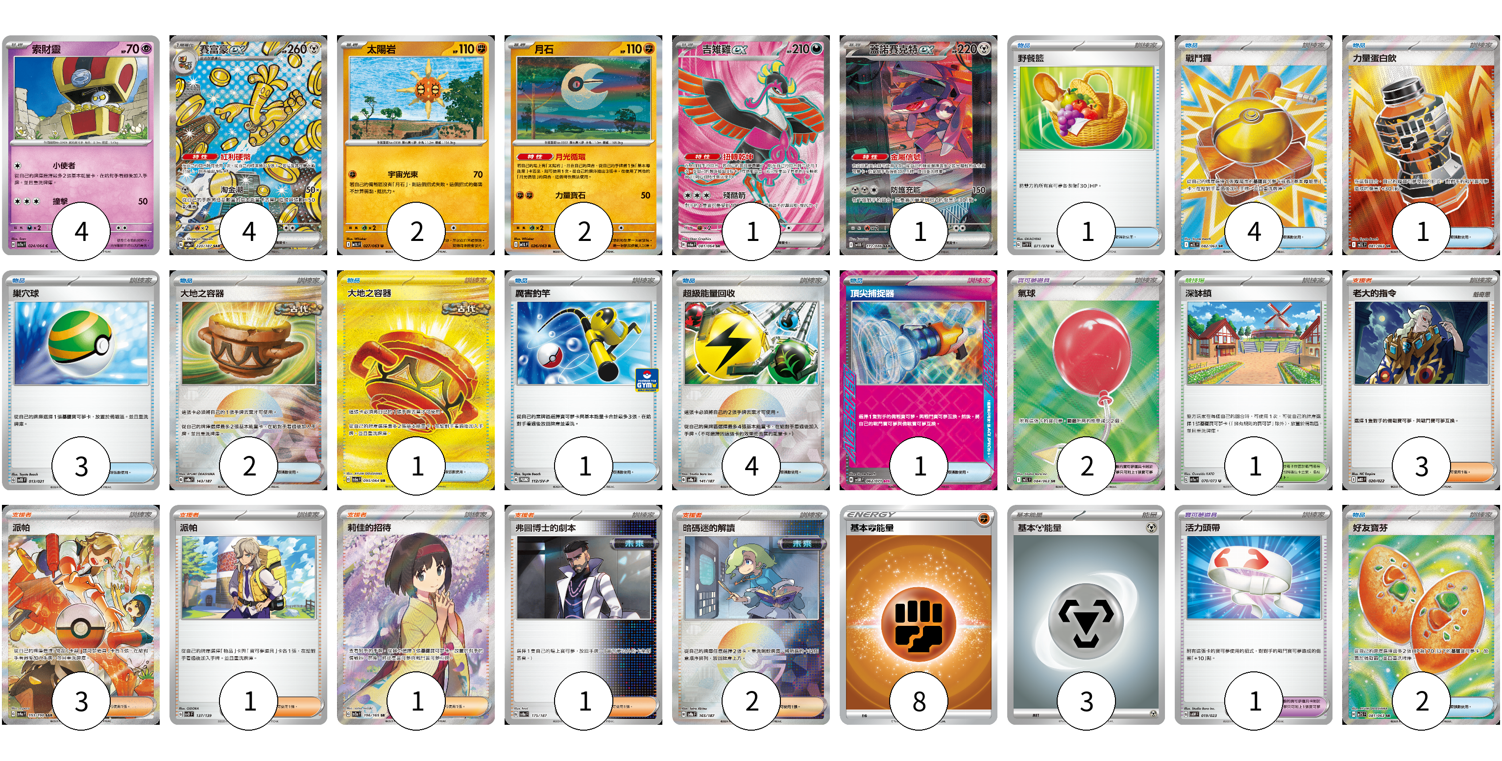 牌組構築方案 以此牌組為基礎新構築牌組 顯示卡面 顯示列表 寶可夢卡(14) 4 4 2 2 1 1 寶可夢道具(3) 2 1 物品卡(20) 1 4 1 3 2 1 1 4 1 2 支援者卡(11) 3 3 1 1 1 2 競技場卡(1) 1 能量卡(11) 8 3 寶可夢卡(14) 卡牌名稱 張數 卡牌名稱 張數 索財靈 SV7a 024/064 04 賽富豪ex SV8a 220/187 04 太陽岩 M1L 027/063 02 月石 M1L 026/063 02 吉雉雞ex SV6a 081/064 01 蓋諾賽克特ex SV11B 172/086 01 寶可夢道具(3) 卡牌名稱 張數 卡牌名稱 張數 氣球 M1L 084/063 02 活力頭帶 SVAW 019/023 01 物品卡(20) 卡牌名稱 張數 卡牌名稱 張數 野餐籃 SV1V 071/078 01 戰鬥鑼 M1L 082/063 04 力量蛋白飲 M1L 081/063 01 巢穴球 SVTR 013/021 03 大地之容器 SV8a 143/187 02 大地之容器 SV6a 093/064 01 厲害釣竿 SV-P 112/SV-P 01 超級能量回收 SV8a 141/187 04 頂尖捕捉器 SV5M 062/071 01 好友寶芬 M1S 081/063 02 支援者卡(11) 卡牌名稱 張數 卡牌名稱 張數 老大的指令 MBD 020/022 03 派帕 SV4a 353/190 03 派帕 SVD 137/139 01 莉佳的招待[支援者] SV2a 196/165 01 弗圖博士的劇本 SV8a 175/187 01 暗碼迷的解讀 SV8a 165/187 02 競技場卡(1) 卡牌名稱 張數 卡牌名稱 張數 深缽鎮 SV1a 070/073 01 能量卡(11) 卡牌名稱 張數 卡牌名稱 張數 基本鬥能量 SLL FIG 08 基本鋼能量 sv-p MET 03 以此牌組為基礎新構築牌組 牌組編碼 dlZdzG-JtgrFx-UUguVQ copy 列印牌組單 牌組編碼已複製 分享至SNS