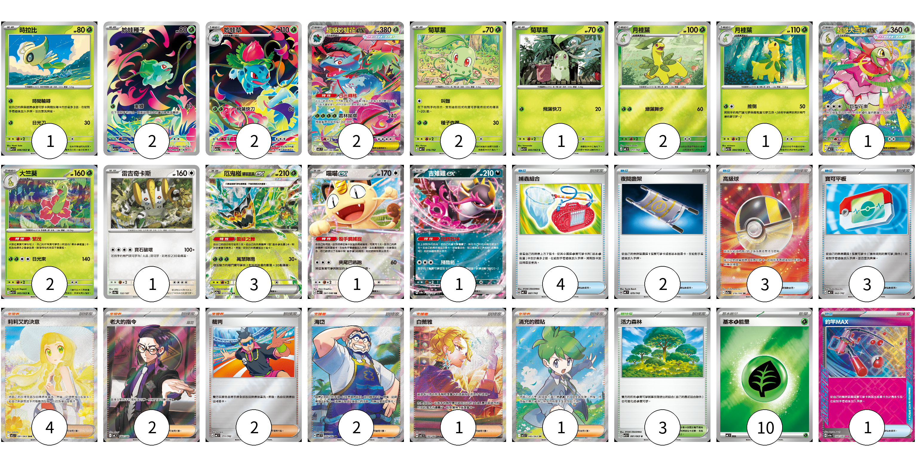 牌組構築方案 以此牌組為基礎新構築牌組 顯示卡面 顯示列表 寶可夢卡(22) 1 2 2 2 2 1 2 1 1 2 1 3 1 1 物品卡(13) 4 2 3 3 1 支援者卡(12) 4 2 2 2 1 1 競技場卡(3) 3 能量卡(10) 10 寶可夢卡(22) 卡牌名稱 張數 卡牌名稱 張數 時拉比 M1L 006/063 01 妙蛙種子 M1L 064/063 02 妙蛙草 M1L 065/063 02 超級妙蛙花ex M1L 087/063 02 菊草葉 MC 016/742 02 菊草葉 M1S 003/063 01 月桂葉 MC 017/742 02 月桂葉 M1S 004/063 01 超級大竺葵ex MC 761/742 01 大竺葵 M1S 005/063 02 雷吉奇卡斯 SV8a 132/187 01 厄鬼椪 碧草面具ex M2a 017/193 03 喵喵ex M3 061/080 01 吉雉雞ex SV8a 104/187 01 物品卡(13) 卡牌名稱 張數 卡牌名稱 張數 捕蟲組合 MC 667/742 04 夜間擔架 MC 670/742 02 高級球 M2a 216/193 03 寶可平板 MC 662/742 03 釣竿MAX SV8a 142/187 01 支援者卡(12) 卡牌名稱 張數 卡牌名稱 張數 莉莉艾的決意 M1L 091/063 04 老大的指令(烏羽) MC 760/742 02 裁判 MC 711/742 02 海岱 SV7 125/102 02 白蕾雅 SV7 132/102 01 滿充的體貼 M1S 085/063 01 競技場卡(3) 卡牌名稱 張數 卡牌名稱 張數 活力森林 M1S 061/063 03 能量卡(10) 卡牌名稱 張數 卡牌名稱 張數 基本【草】能量 MC GRA 10 以此牌組為基礎新構築牌組 牌組編碼 dmMowT-wgRHZu-fXqnYf copy 列印牌組單 牌組編碼已複製 分享至SNS