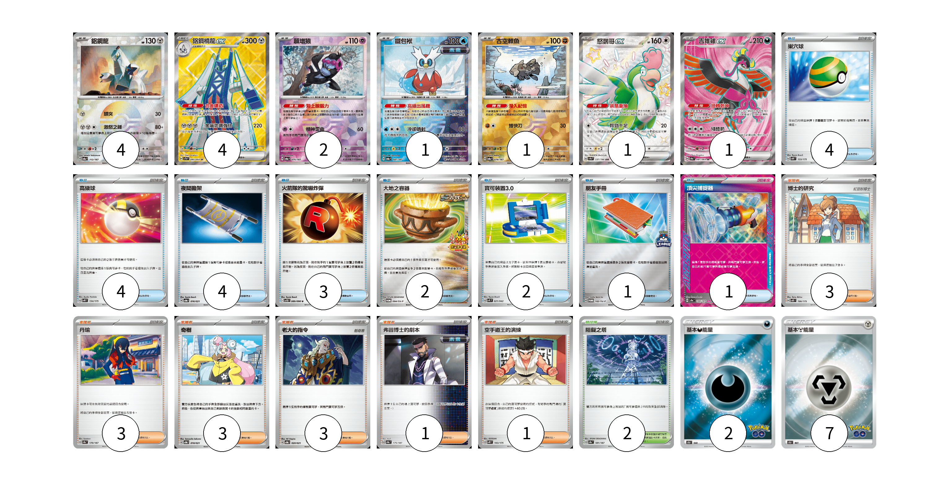 牌組構築方案 以此牌組為基礎新構築牌組 顯示卡面 顯示列表 寶可夢卡(14) 4 4 2 1 1 1 1 物品卡(21) 4 4 4 3 2 2 1 1 支援者卡(14) 3 3 3 3 1 1 競技場卡(2) 2 能量卡(9) 2 7 寶可夢卡(14) 卡牌名稱 張數 卡牌名稱 張數 鋁鋼龍 SV8a 112/187 04 鋁鋼橋龍ex SV7a 080/064 04 願增猿 SV8a 075/187 02 鐵包袱 SV8a 047/187 01 古空棘魚 SV8a 079/187 01 怒鸚哥ex SV4a 337/190 01 吉雉雞ex SV6a 081/064 01 物品卡(21) 卡牌名稱 張數 卡牌名稱 張數 巢穴球 SVM 133/175 04 高級球 SVM 134/175 04 夜間擔架 SVOM 016/021 04 火箭隊的驚嚇炸彈 SV10 089/098 03 大地之容器 SV-P 084/SV-P 02 寶可裝置3.0 SVK 021/042 02 朋友手冊 SV-P 182/SV-P 01 頂尖捕捉器 SV8a 148/187 01 支援者卡(14) 卡牌名稱 張數 卡牌名稱 張數 博士的研究 SVM 166/175 03 丹瑜 SV8a 170/187 03 奇樹 SVOM 018/021 03 老大的指令 SVOM 020/021 03 弗圖博士的劇本 SV8a 175/187 01 空手道王的演練 SVM 143/175 01 競技場卡(2) 卡牌名稱 張數 卡牌名稱 張數 阻礙之塔 SV8a 181/187 02 能量卡(9) 卡牌名稱 張數 卡牌名稱 張數 基本惡能量 S10b DAR 02 基本鋼能量 S10b MET 07 以此牌組為基礎新構築牌組 牌組編碼 dnKfZd-QgIwnM-MFbPzu copy 列印牌組單 牌組編碼已複製 分享至SNS