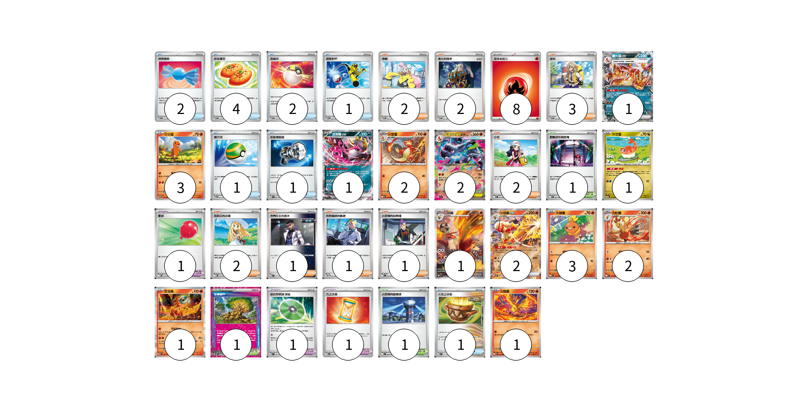 牌組構築方案 以此牌組為基礎新構築牌組 顯示卡面 顯示列表 寶可夢卡(20) 1 3 1 2 2 1 1 2 3 2 1 1 寶可夢道具(5) 2 1 1 1 物品卡(12) 2 4 2 1 1 1 1 支援者卡(12) 2 3 2 2 1 1 1 競技場卡(3) 1 1 1 能量卡(8) 8 寶可夢卡(20) 卡牌名稱 張數 卡牌名稱 張數 噴火龍ex SVTL 006/021 01 小火龍 SVTL 001/021 03 吉雉雞ex SV6a 038/064 01 火恐龍 M2 012/080 02 超級噴火龍Xex M2 013/080 02 米立龍 MBD 010/022 01 火焰雞 SV10 101/098 01 火焰雞ex SVM 016/175 02 火稚雞 SV10 018/098 03 力壯雞 SV10 019/098 02 古玉魚 SV8a 025/187 01 火焰鳥 M2 014/080 01 寶可夢道具(5) 卡牌名稱 張數 卡牌名稱 張數 奇樹 SVTL 018/021 02 氣球 MBD 018/022 01 招式學習器 演進 SVK 025/042 01 力之沙漏 SV6a 058/064 01 物品卡(12) 卡牌名稱 張數 卡牌名稱 張數 神奇糖果 SVTL 013/021 02 好友寶芬 SVTL 010/021 04 高級球 SVTL 012/021 02 厲害釣竿 SVTL 009/021 01 巢穴球 SVTL 011/021 01 反擊捕捉器 SVK 009/042 01 大地之容器 SVK 012/042 01 支援者卡(12) 卡牌名稱 張數 卡牌名稱 張數 老大的指令 SVTL 021/021 02 派帕 SVTL 020/021 03 小光 M2 077/080 02 莉莉艾的決意 MBD 021/022 02 弗圖博士的劇本 SVK 034/042 01 阿克羅瑪的執著 SVOM 017/021 01 火箭隊的拉姆達 SV10 094/098 01 競技場卡(3) 卡牌名稱 張數 卡牌名稱 張數 對戰圓形競技場 M2 079/080 01 壯偉碩木 SV7 101/102 01 火箭隊的監視塔 SV10 096/098 01 能量卡(8) 卡牌名稱 張數 卡牌名稱 張數 基本【火】能量 SVTL FIR 08 以此牌組為基礎新構築牌組 牌組編碼 dpFaUN-xQHhcn-kpExKl copy 列印牌組單 牌組編碼已複製 分享至SNS