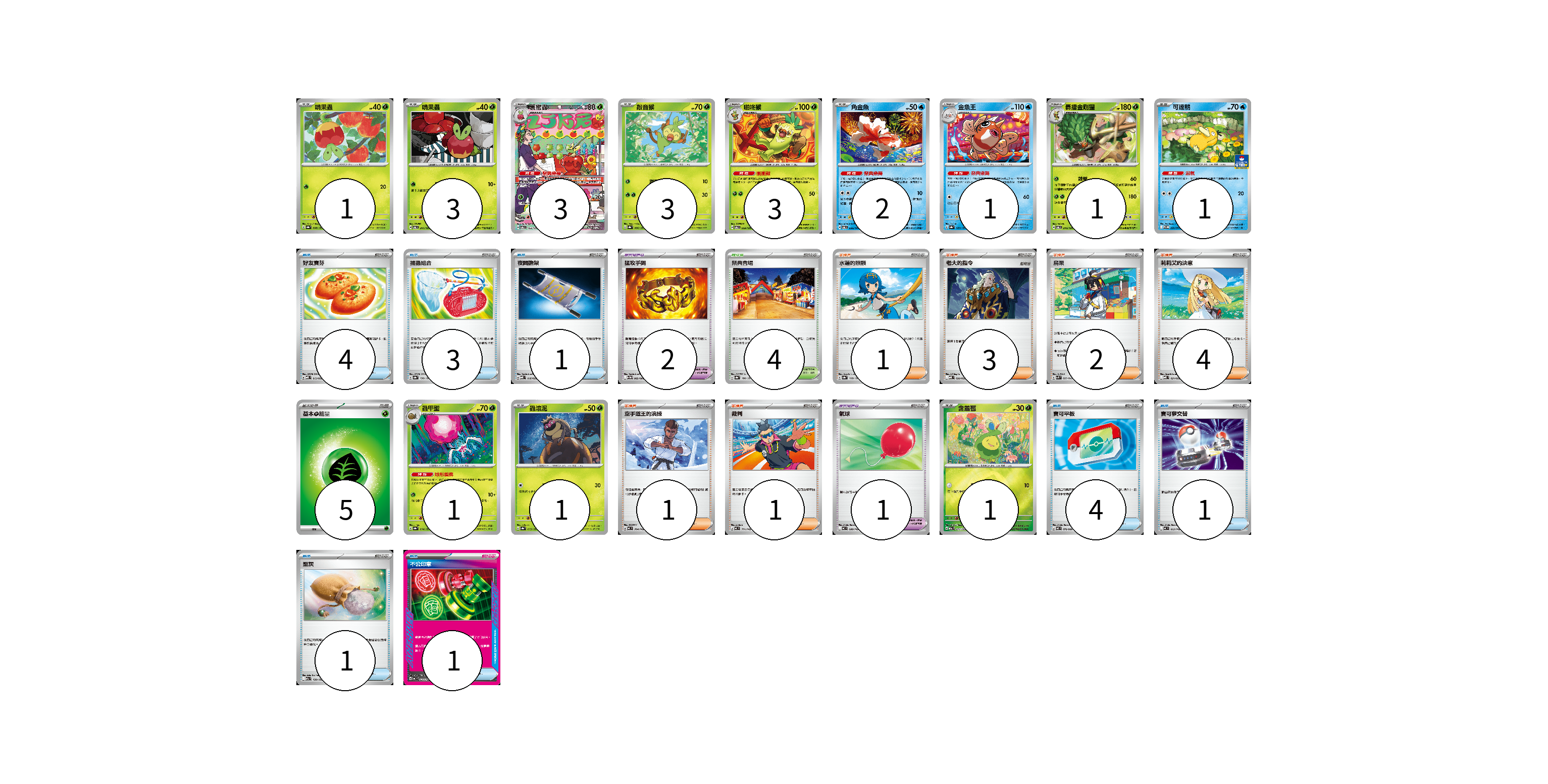 牌組構築方案 以此牌組為基礎新構築牌組 顯示卡面 顯示列表 寶可夢卡(21) 1 3 3 3 3 2 1 1 1 1 1 1 寶可夢道具(3) 2 1 物品卡(15) 4 3 1 4 1 1 1 支援者卡(12) 1 3 2 4 1 1 競技場卡(4) 4 能量卡(5) 5 寶可夢卡(21) 卡牌名稱 張數 卡牌名稱 張數 啃果蟲 SV8a 008/187 01 啃果蟲 SV6 011/101 03 裹蜜蟲 SV6 103/101 03 敲音猴 SV8a 006/187 03 啪咚猴 SV6 009/101 03 角金魚 SV6 026/101 02 金魚王 SV8a 029/187 01 轟擂金剛猩 SV6 010/101 01 可達鴨 SV-P 220/SV-P 01 蟲甲聖 SV8a 014/187 01 蟲滾泥 SV8a 013/187 01 含羞苞 M2a 011/193 01 寶可夢道具(3) 卡牌名稱 張數 卡牌名稱 張數 猛攻手鐲 SV11W 082/086 02 氣球 MC 688/742 01 物品卡(15) 卡牌名稱 張數 卡牌名稱 張數 好友寶芬 MBD 013/022 04 捕蟲組合 SV8a 150/187 03 夜間擔架 MBD 016/022 01 寶可平板 M3 070/080 04 寶可夢交替 MC 663/742 01 聖灰 M2a 150/193 01 不公印章 MC 633/742 01 支援者卡(12) 卡牌名稱 張數 卡牌名稱 張數 水蓮的照顧 SV8a 168/187 01 老大的指令 MBD 020/022 03 烏栗 SVK 029/042 02 莉莉艾的決意 MBD 021/022 04 空手道王的演練 MC 704/742 01 裁判 MC 711/742 01 競技場卡(4) 卡牌名稱 張數 卡牌名稱 張數 祭典會場 SV8a 180/187 04 能量卡(5) 卡牌名稱 張數 卡牌名稱 張數 基本【草】能量 M-P GRA 05 以此牌組為基礎新構築牌組 牌組編碼 dsNIOu-RhAIpy-nPbDPo copy 列印牌組單 牌組編碼已複製 分享至SNS