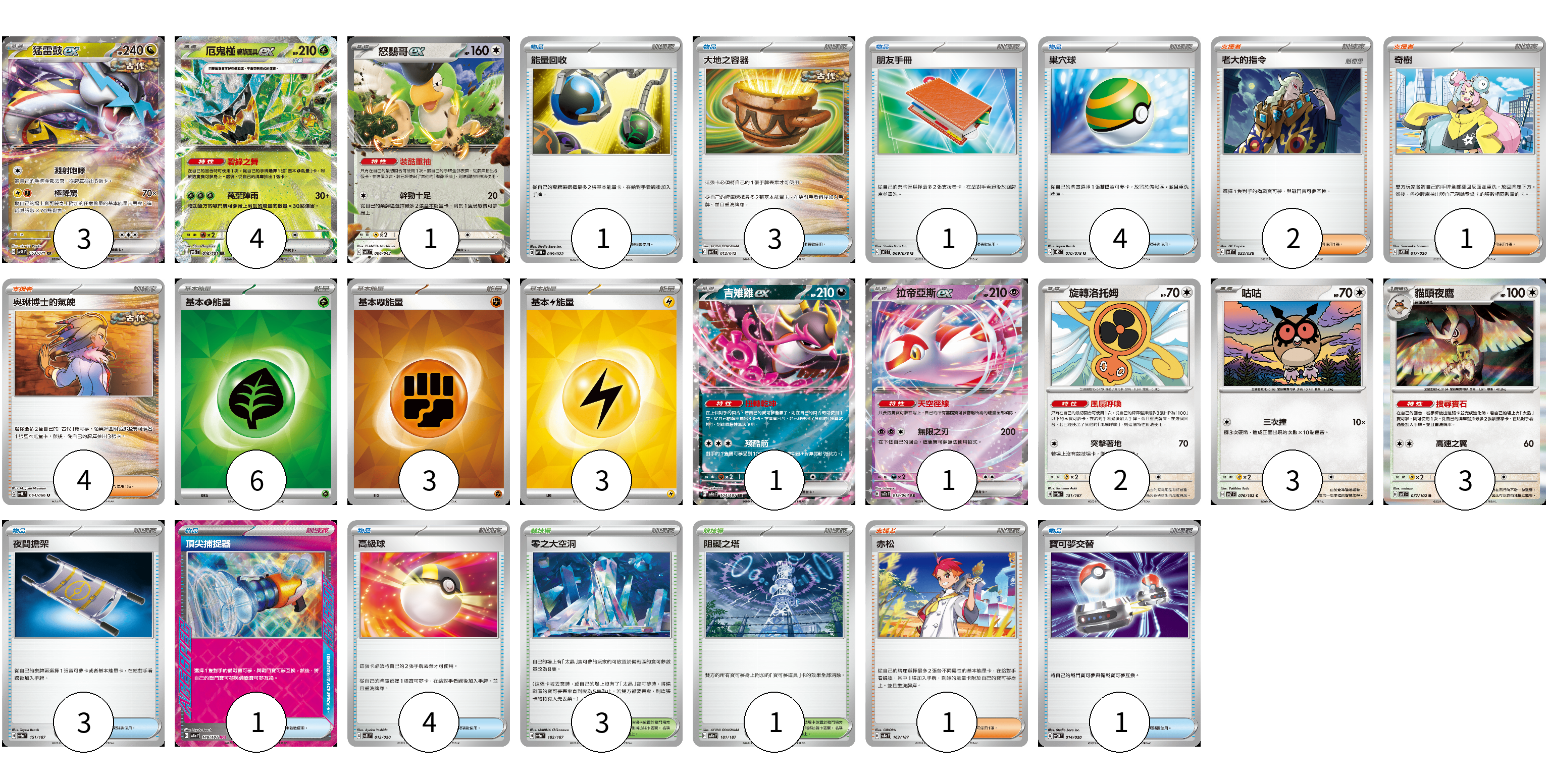 牌組構築方案 以此牌組為基礎新構築牌組 顯示卡面 顯示列表 寶可夢卡(18) 3 4 1 1 1 2 3 3 物品卡(18) 1 3 1 4 3 1 4 1 支援者卡(8) 2 1 4 1 競技場卡(4) 3 1 能量卡(12) 6 3 3 寶可夢卡(18) 卡牌名稱 張數 卡牌名稱 張數 猛雷鼓ex SV5K 053/071 03 厄鬼椪 碧草面具ex SV6 016/101 04 怒鸚哥ex SVK 006/042 01 吉雉雞ex SV8a 104/187 01 拉帝亞斯ex SV7a 019/064 01 旋轉洛托姆 SV8a 131/187 02 咕咕 SV7 076/102 03 貓頭夜鷹 SV7 077/102 03 物品卡(18) 卡牌名稱 張數 卡牌名稱 張數 能量回收 SVTM 009/022 01 大地之容器 SVK 012/042 03 朋友手冊 SV1S 069/078 01 巢穴球 SV1S 070/078 04 夜間擔架 SV8a 151/187 03 頂尖捕捉器 SV8a 148/187 01 高級球 SVEL 012/020 04 寶可夢交替 SVOD 014/020 01 支援者卡(8) 卡牌名稱 張數 卡牌名稱 張數 老大的指令 SVF 032/038 02 奇樹 SVEM 017/020 01 奧琳博士的氣魄 SV4K 064/066 04 赤松 SV8a 163/187 01 競技場卡(4) 卡牌名稱 張數 卡牌名稱 張數 零之大空洞 SV8a 182/187 03 阻礙之塔 SV8a 181/187 01 能量卡(12) 卡牌名稱 張數 卡牌名稱 張數 基本【草】能量 SVK GRA 06 基本【鬥】能量 SVK FIG 03 基本【雷】能量 SVK LIG 03 以此牌組為基礎新構築牌組 牌組編碼 dvPYhs-aVRDpU-gmmZuD copy 列印牌組單 牌組編碼已複製 分享至SNS