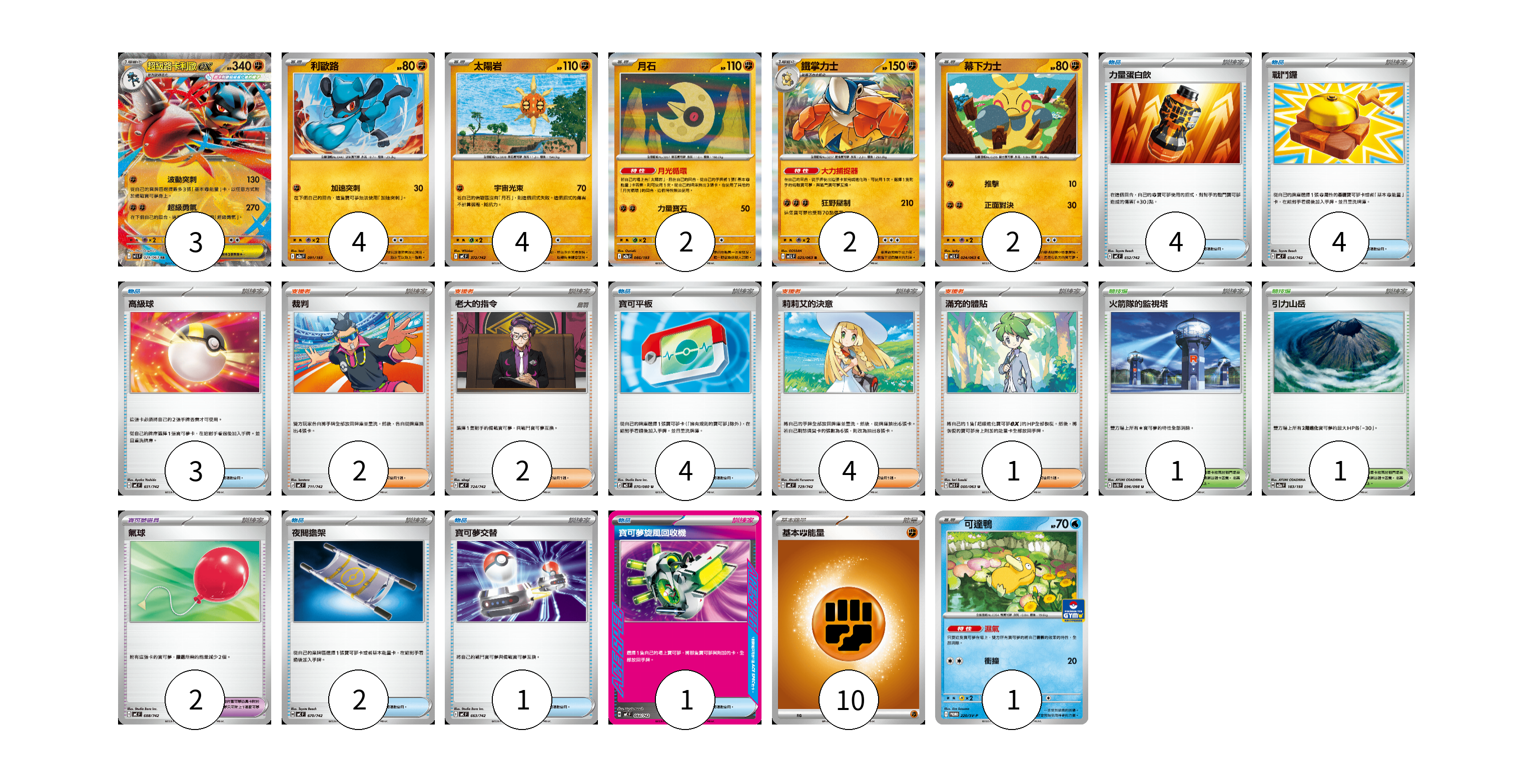 牌組構築方案 以此牌組為基礎新構築牌組 顯示卡面 顯示列表 寶可夢卡(18) 3 4 4 2 2 2 1 寶可夢道具(2) 2 物品卡(19) 4 4 3 4 2 1 1 支援者卡(9) 2 2 4 1 競技場卡(2) 1 1 能量卡(10) 10 寶可夢卡(18) 卡牌名稱 張數 卡牌名稱 張數 超級路卡利歐ex M1L 029/063 03 利歐路 M2a 091/193 04 太陽岩 MC 372/742 04 月石 M2a 086/193 02 鐵掌力士 M1L 025/063 02 幕下力士 M1L 024/063 02 可達鴨 SV-P 220/SV-P 01 寶可夢道具(2) 卡牌名稱 張數 卡牌名稱 張數 氣球 MC 688/742 02 物品卡(19) 卡牌名稱 張數 卡牌名稱 張數 力量蛋白飲 MC 652/742 04 戰鬥鑼 MC 654/742 04 高級球 MC 651/742 03 寶可平板 M3 070/080 04 夜間擔架 MC 670/742 02 寶可夢交替 MC 663/742 01 寶可夢旋風回收機 MC 664/742 01 支援者卡(9) 卡牌名稱 張數 卡牌名稱 張數 裁判 MC 711/742 02 老大的指令 MC 724/742 02 莉莉艾的決意 MC 729/742 04 滿充的體貼 M1S 060/063 01 競技場卡(2) 卡牌名稱 張數 卡牌名稱 張數 火箭隊的監視塔 SV10 096/098 01 引力山岳 M2a 183/193 01 能量卡(10) 卡牌名稱 張數 卡牌名稱 張數 基本【鬥】能量 MC FIG 10 以此牌組為基礎新構築牌組 牌組編碼 dwHrOY-xLfSKo-OtYyuA copy 列印牌組單 牌組編碼已複製 分享至SNS