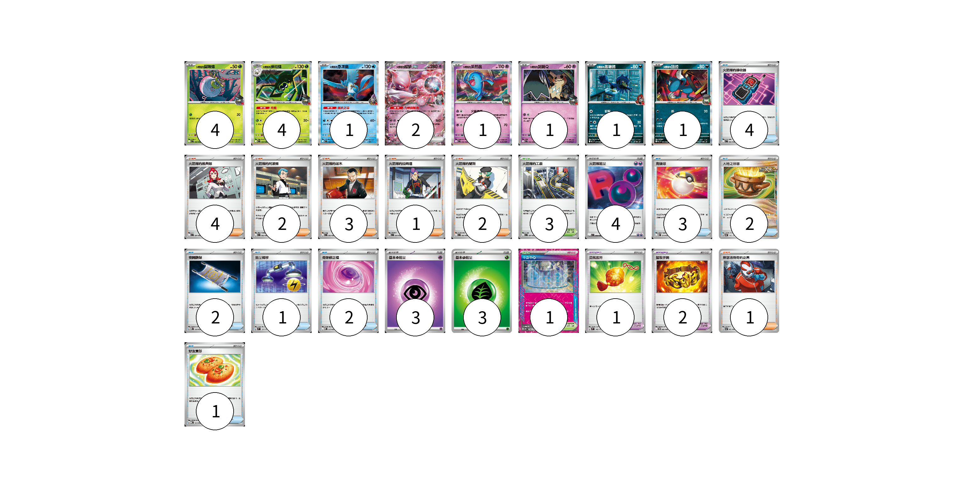 牌組構築方案 以此牌組為基礎新構築牌組 顯示卡面 顯示列表 寶可夢卡(15) 4 4 1 2 1 1 1 1 寶可夢道具(3) 1 2 物品卡(15) 4 3 2 2 1 2 1 支援者卡(13) 4 2 3 1 2 1 競技場卡(4) 3 1 能量卡(10) 4 3 3 寶可夢卡(15) 卡牌名稱 張數 卡牌名稱 張數 <火箭隊的>團珠蛛 SV10 008/098 04 <火箭隊的>操陷蛛 SV10 009/098 04 <火箭隊的>急凍鳥 SV10 022/098 01 <火箭隊的>超夢ex SV10 039/098 02 <火箭隊的>果然翁 SV10 040/098 01 <火箭隊的>謎擬Q SV10 042/098 01 <火箭隊的>黑暗鴉 SV10 071/098 01 <火箭隊的>狃拉 SV10 072/098 01 寶可夢道具(3) 卡牌名稱 張數 卡牌名稱 張數 勇氣護符 SVM 142/175 01 猛攻手鐲 SV11W 082/086 02 物品卡(15) 卡牌名稱 張數 卡牌名稱 張數 火箭隊的接收器 SV10 090/098 04 高級球 MBD 014/022 03 大地之容器 SV8a 143/187 02 夜間擔架 MBD 016/022 02 能量轉移 SVM 127/175 01 奇跡修正檔 MBD 017/022 02 好友寶芬 MBD 013/022 01 支援者卡(13) 卡牌名稱 張數 卡牌名稱 張數 火箭隊的雅典娜 SV10 091/098 04 火箭隊的阿波羅 SV10 092/098 02 火箭隊的坂木 SV10 093/098 03 火箭隊的拉姆達 SV10 094/098 01 火箭隊的蘭斯 SV10 095/098 02 庫瑟洛斯奇的企圖 SV6a 062/064 01 競技場卡(4) 卡牌名稱 張數 卡牌名稱 張數 火箭隊的工廠 SV10 097/098 03 中立中心 SV8a 184/187 01 能量卡(10) 卡牌名稱 張數 卡牌名稱 張數 火箭隊能量 SV10 098/098 04 基本【超】能量 MBD PSY 03 基本【草】能量 M-P GRA 03 以此牌組為基礎新構築牌組 牌組編碼 dxEjZL-kVqCyu-xWyyou copy 列印牌組單 牌組編碼已複製 分享至SNS