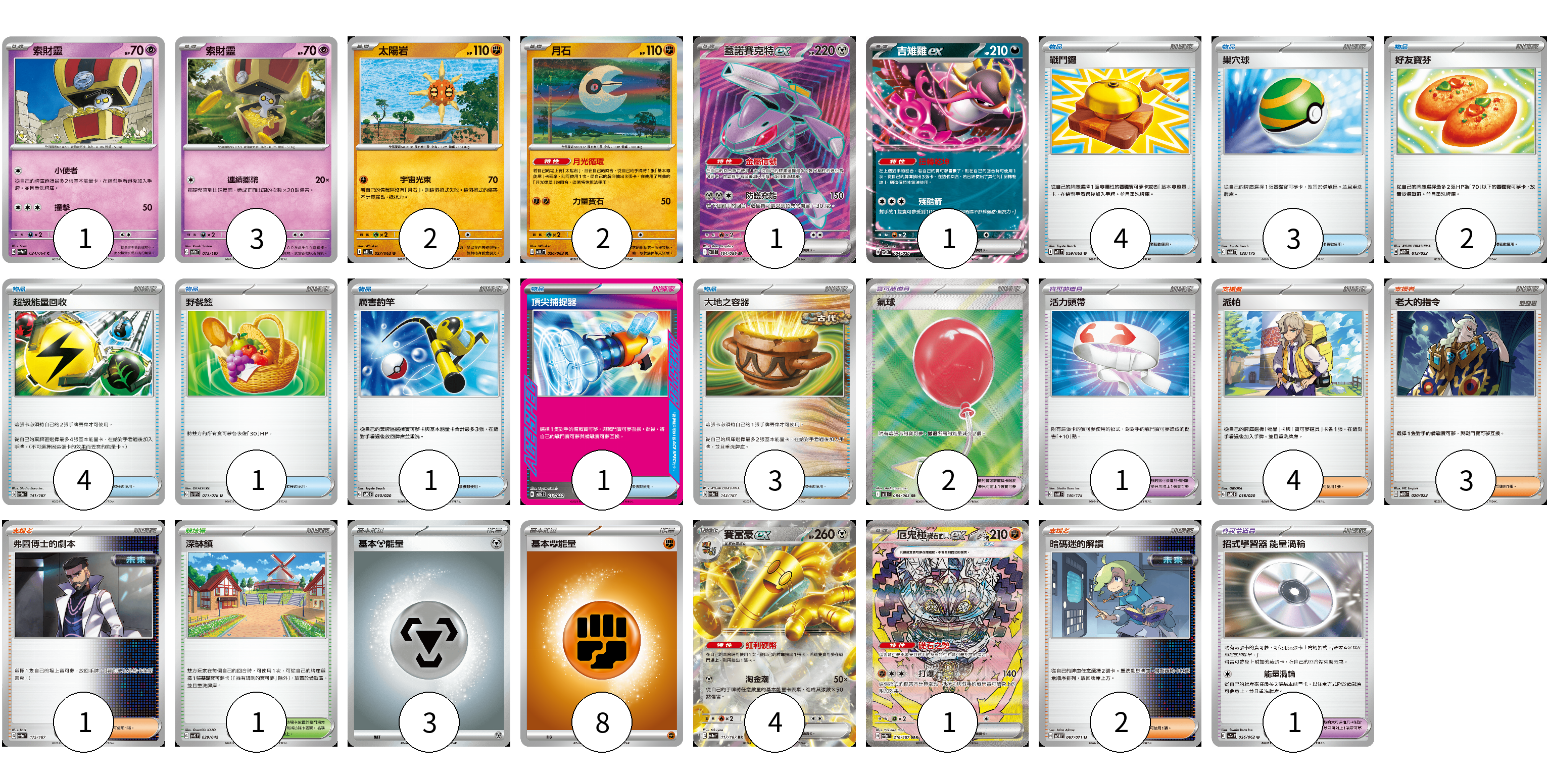 牌組構築方案 以此牌組為基礎新構築牌組 顯示卡面 顯示列表 寶可夢卡(15) 1 3 2 2 1 1 4 1 寶可夢道具(4) 2 1 1 物品卡(19) 4 3 2 4 1 1 1 3 支援者卡(10) 4 3 1 2 競技場卡(1) 1 能量卡(11) 3 8 寶可夢卡(15) 卡牌名稱 張數 卡牌名稱 張數 索財靈 SV7a 024/064 01 索財靈 SV8a 073/187 03 太陽岩 M1L 027/063 02 月石 M1L 026/063 02 蓋諾賽克特ex SV11B 164/086 01 吉雉雞ex SVOD 004/020 01 賽富豪ex SV8a 117/187 04 厄鬼椪 礎石面具ex SV8a 216/187 01 寶可夢道具(4) 卡牌名稱 張數 卡牌名稱 張數 氣球 M1L 084/063 02 活力頭帶 SVM 140/175 01 招式學習器 能量渦輪 SV3a 056/062 01 物品卡(19) 卡牌名稱 張數 卡牌名稱 張數 戰鬥鑼 M1L 059/063 04 巢穴球 SVM 133/175 03 好友寶芬 MBD 013/022 02 超級能量回收 SV8a 141/187 04 野餐籃 SV1V 071/078 01 厲害釣竿 SVOD 010/020 01 頂尖捕捉器 MBG 014/022 01 大地之容器 SV8a 143/187 03 支援者卡(10) 卡牌名稱 張數 卡牌名稱 張數 派帕 SVOD 018/020 04 老大的指令 MBD 020/022 03 弗圖博士的劇本 SV8a 175/187 01 暗碼迷的解讀 SV5M 067/071 02 競技場卡(1) 卡牌名稱 張數 卡牌名稱 張數 深缽鎮 SVK 039/042 01 能量卡(11) 卡牌名稱 張數 卡牌名稱 張數 基本【鋼】能量 M-P MET 03 基本【鬥】能量 M-P FIG 08 以此牌組為基礎新構築牌組 牌組編碼 dxccsN-deftTs-zDFkIs copy 列印牌組單 牌組編碼已複製 分享至SNS