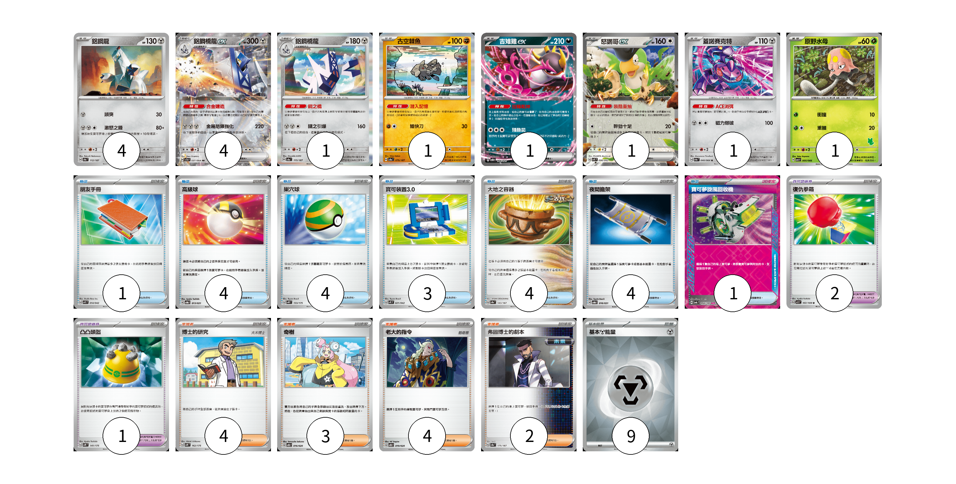 牌組構築方案 以此牌組為基礎新構築牌組 顯示卡面 顯示列表 寶可夢卡(14) 4 4 1 1 1 1 1 1 寶可夢道具(3) 2 1 物品卡(21) 1 4 4 3 4 4 1 支援者卡(13) 4 3 4 2 能量卡(9) 9 寶可夢卡(14) 卡牌名稱 張數 卡牌名稱 張數 鋁鋼龍 SV8a 112/187 04 鋁鋼橋龍ex SV7a 037/064 04 鋁鋼橋龍 SV8a 113/187 01 古空棘魚 SV8a 079/187 01 吉雉雞ex SVOD 004/020 01 怒鸚哥ex SVK 006/042 01 蓋諾賽克特 SV6a 040/064 01 原野水母 SVI 005/066 01 寶可夢道具(3) 卡牌名稱 張數 卡牌名稱 張數 復仇拳箱 SV3 102/108 02 凸凸頭盔 SVM 141/175 01 物品卡(21) 卡牌名稱 張數 卡牌名稱 張數 朋友手冊 SVK 014/042 01 高級球 SVOM 013/021 04 巢穴球 SVM 133/175 04 寶可裝置3.0 SVK 021/042 03 大地之容器 SV8a 143/187 04 夜間擔架 SVOM 016/021 04 寶可夢旋風回收機 SV6 093/101 01 支援者卡(13) 卡牌名稱 張數 卡牌名稱 張數 博士的研究 SVM 162/175 04 奇樹 SVOD 016/020 03 老大的指令 SVOD 019/020 04 弗圖博士的劇本 SV8a 175/187 02 能量卡(9) 卡牌名稱 張數 卡牌名稱 張數 基本【鋼】能量 SVOD MET 09 以此牌組為基礎新構築牌組 牌組編碼 dyPZRA-BpyAUW-SbXrPJ copy 列印牌組單 牌組編碼已複製 分享至SNS
