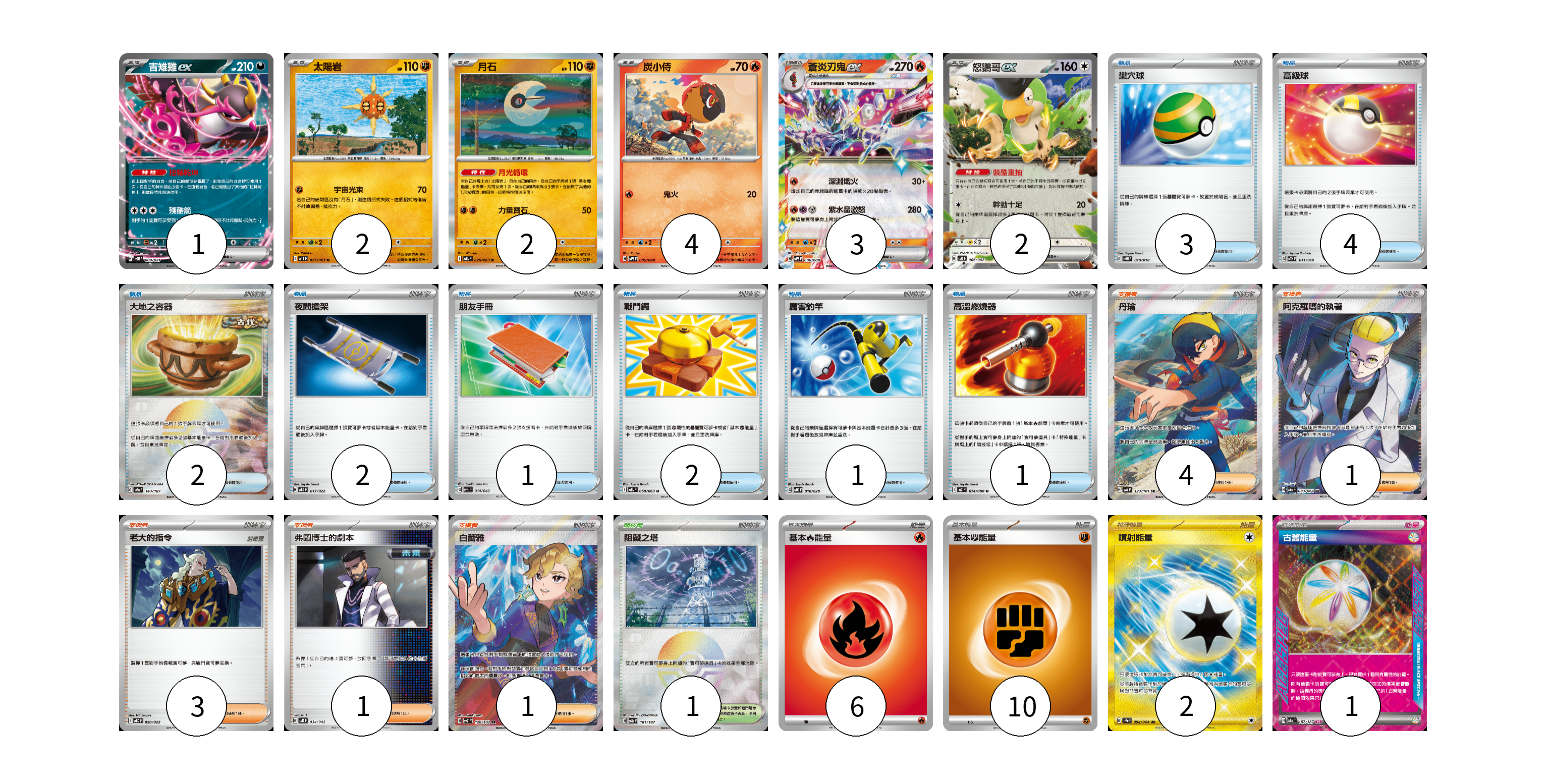 牌組構築方案 以此牌組為基礎新構築牌組 顯示卡面 顯示列表 寶可夢卡(14) 1 2 2 4 3 2 物品卡(16) 3 4 2 2 1 2 1 1 支援者卡(10) 4 1 3 1 1 競技場卡(1) 1 能量卡(19) 6 10 2 1 寶可夢卡(14) 卡牌名稱 張數 卡牌名稱 張數 吉雉雞ex SVOM 009/021 01 太陽岩 M1L 027/063 02 月石 M1L 026/063 02 炭小侍 SVPS 005/008 04 蒼炎刃鬼ex SVPS 006/008 03 怒鸚哥ex SVK 006/042 02 物品卡(16) 卡牌名稱 張數 卡牌名稱 張數 巢穴球 SVTH 010/018 03 高級球 SVTH 011/018 04 大地之容器 SV8a 143/187 02 夜間擔架 MBG 017/022 02 朋友手冊 SVK 014/042 01 戰鬥鑼 M1L 059/063 02 厲害釣竿 SVOD 010/020 01 高溫燃燒器 M2 074/080 01 支援者卡(10) 卡牌名稱 張數 卡牌名稱 張數 丹瑜 SV6 123/101 04 阿克羅瑪的執著 SV6a 083/064 01 老大的指令 MBD 020/022 03 弗圖博士的劇本 SVK 034/042 01 白蕾雅 SV7 126/102 01 競技場卡(1) 卡牌名稱 張數 卡牌名稱 張數 阻礙之塔 SV8a 181/187 01 能量卡(19) 卡牌名稱 張數 卡牌名稱 張數 基本火能量 sv-p FIR 06 基本【鬥】能量 SVAM FIG 10 噴射能量 SV7a 094/064 02 古舊能量 SV8a 187/187 01 以此牌組為基礎新構築牌組 牌組編碼 eAfVxs-hfWGST-yGJOMp copy 列印牌組單 牌組編碼已複製 分享至SNS