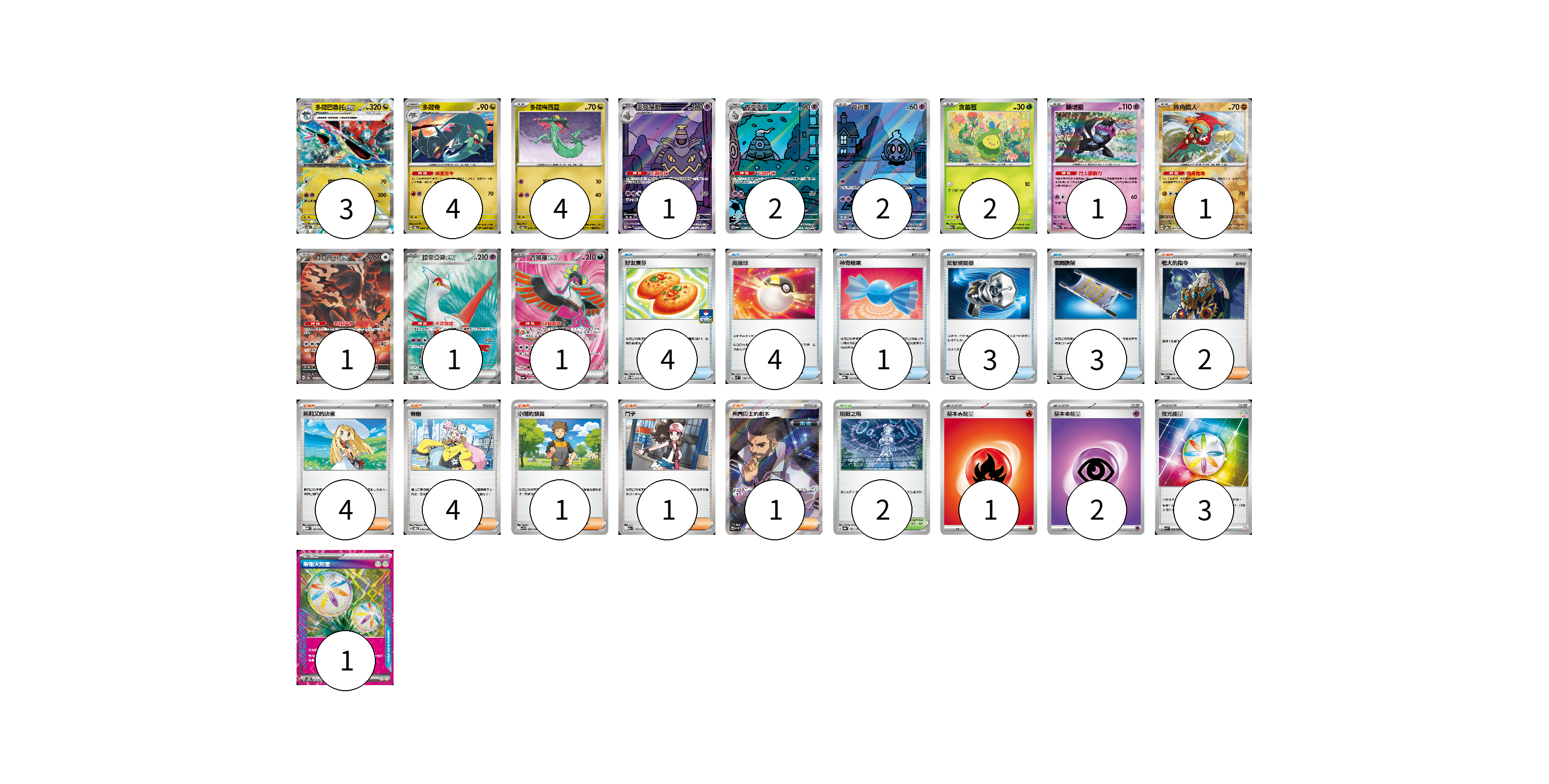 牌組構築方案 以此牌組為基礎新構築牌組 顯示卡面 顯示列表 寶可夢卡(23) 3 4 4 1 2 2 2 1 1 1 1 1 物品卡(15) 4 4 1 3 3 支援者卡(13) 2 4 4 1 1 1 競技場卡(2) 2 能量卡(7) 1 2 3 1 寶可夢卡(23) 卡牌名稱 張數 卡牌名稱 張數 多龍巴魯托ex SV6 081/101 03 多龍奇 SV6 080/101 04 多龍梅西亞 SV6 079/101 04 黑夜魔靈 SV6a 070/064 01 彷徨夜靈 SV6a 069/064 02 夜巡靈 SV6a 068/064 02 含羞苞 M2a 011/193 02 願增猿 M2a 081/193 01 摔角鷹人 SV8a 084/187 01 月月熊 赫月ex SV8a 225/187 01 拉帝亞斯ex SV7a 078/064 01 吉雉雞ex SV6a 081/064 01 物品卡(15) 卡牌名稱 張數 卡牌名稱 張數 好友寶芬 SV-P 212/SV-P 04 高級球 SVM 134/175 04 神奇糖果 MBG 013/022 01 反擊捕捉器 SV8a 139/187 03 夜間擔架 MBG 017/022 03 支援者卡(13) 卡牌名稱 張數 卡牌名稱 張數 老大的指令 MBD 020/022 02 莉莉艾的決意 MBD 021/022 04 奇樹 SVOD 016/020 04 小剛的發掘 SV9 096/100 01 鬥子 M2a 172/193 01 弗圖博士的劇本 SV4M 086/066 01 競技場卡(2) 卡牌名稱 張數 卡牌名稱 張數 阻礙之塔 SV8a 181/187 02 能量卡(7) 卡牌名稱 張數 卡牌名稱 張數 基本火能量 sv-p FIR 01 基本超能量 sv-p PSY 02 夜光能量 SVK 042/042 03 新衝天能量 SV5K 071/071 01 以此牌組為基礎新構築牌組 牌組編碼 eBkuTR-zsEOJR-qHfvQV copy 列印牌組單 牌組編碼已複製 分享至SNS