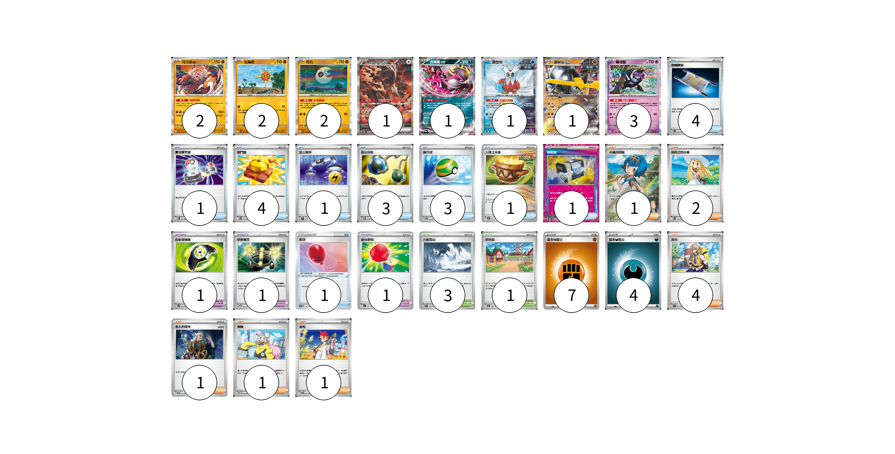 牌組構築方案 以此牌組為基礎新構築牌組 顯示卡面 顯示列表 寶可夢卡(13) 2 2 2 1 1 1 1 3 寶可夢道具(4) 1 1 1 1 物品卡(18) 4 1 4 1 3 3 1 1 支援者卡(10) 1 2 4 1 1 1 競技場卡(4) 3 1 能量卡(11) 7 4 寶可夢卡(13) 卡牌名稱 張數 卡牌名稱 張數 月月熊 赫月 SV8a 085/187 02 太陽岩 M2a 087/193 02 月石 M1L 026/063 02 月月熊 赫月ex SV8a 225/187 01 吉雉雞ex SV8a 104/187 01 鐵包袱 SV8a 047/187 01 鐵磐岩ex SV5M 041/071 01 願增猿 M2a 081/193 03 寶可夢道具(4) 卡牌名稱 張數 卡牌名稱 張數 反擊增幅器 M2a 161/193 01 學習裝置 SVTM 016/022 01 氣球 S8b 145/184 01 復仇拳箱 SV3 102/108 01 物品卡(18) 卡牌名稱 張數 卡牌名稱 張數 夜間擔架 M2a 159/193 04 寶可夢交替 MBG 015/022 01 戰鬥鑼 M2a 155/193 04 能量轉移 SVM 127/175 01 能量回收 SVQL 012/022 03 巢穴球 SVTS 013/022 03 大地之容器 SV4K 060/066 01 秘密箱 SV6 092/101 01 支援者卡(10) 卡牌名稱 張數 卡牌名稱 張數 水蓮的照顧 SV5a 088/066 01 莉莉艾的決意 M2a 175/193 02 派帕 SVK 035/042 04 老大的指令 SVTH 017/018 01 奇樹 SVOM 018/021 01 赤松 SV7 097/102 01 競技場卡(4) 卡牌名稱 張數 卡牌名稱 張數 災禍雪山 SV2P 070/071 03 深缽鎮 SV4a 185/190 01 能量卡(11) 卡牌名稱 張數 卡牌名稱 張數 基本【鬥】能量 M-P FIG 07 基本【惡】能量 M-P DAR 04 以此牌組為基礎新構築牌組 牌組編碼 eFGNnh-jQkLsa-pLUgRq copy 列印牌組單 牌組編碼已複製 分享至SNS