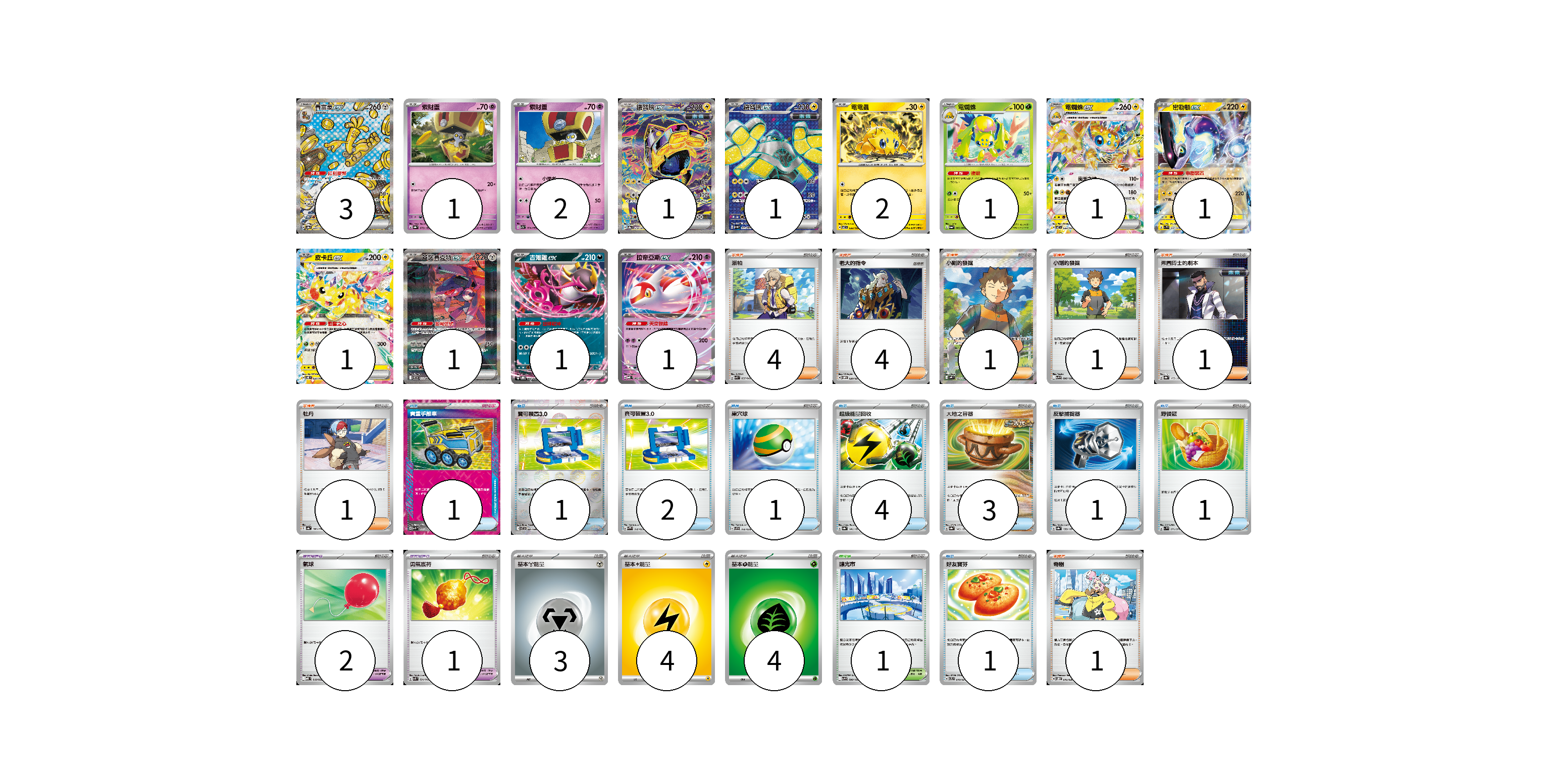 牌組構築方案 以此牌組為基礎新構築牌組 顯示卡面 顯示列表 寶可夢卡(17) 3 1 2 1 1 2 1 1 1 1 1 1 1 寶可夢道具(3) 2 1 物品卡(15) 1 1 2 1 4 3 1 1 1 支援者卡(13) 4 4 1 1 1 1 1 競技場卡(1) 1 能量卡(11) 3 4 4 寶可夢卡(17) 卡牌名稱 張數 卡牌名稱 張數 賽富豪ex SV8a 220/187 03 索財靈 SV8a 073/187 01 索財靈 SV7a 024/064 02 鐵臂膀ex SV8a 210/187 01 鐵臂膀ex SV4M 079/066 01 電電蟲 SV7 032/102 02 電蜘蛛 SV6a 002/064 01 電蜘蛛ex SV7 033/102 01 密勒頓ex SV1V 037/078 01 皮卡丘ex SV8 033/106 01 蓋諾賽克特ex SV11B 172/086 01 吉雉雞ex SVOD 004/020 01 拉帝亞斯ex MBD 003/022 01 寶可夢道具(3) 卡牌名稱 張數 卡牌名稱 張數 氣球 MBD 018/022 02 勇氣護符 SVK 024/042 01 物品卡(15) 卡牌名稱 張數 卡牌名稱 張數 貴重手推車 SVK 020/042 01 寶可裝置3.0 SV11B 081/086 01 寶可裝置3.0 SVAW 016/023 02 巢穴球 SVF 016/038 01 超級能量回收 SV8a 141/187 04 大地之容器 SV8a 143/187 03 反擊捕捉器 SV8a 139/187 01 野餐籃 SV1V 071/078 01 好友寶芬 SVTL 010/021 01 支援者卡(13) 卡牌名稱 張數 卡牌名稱 張數 派帕 SVK 035/042 04 老大的指令 SVOM 020/021 04 小剛的發掘 SV9 123/100 01 小剛的發掘 SV9 096/100 01 弗圖博士的劇本 SV8a 175/187 01 牡丹 SV4a 182/190 01 奇樹 SVOD 016/020 01 競技場卡(1) 卡牌名稱 張數 卡牌名稱 張數 釀光市 SV9 098/100 01 能量卡(11) 卡牌名稱 張數 卡牌名稱 張數 基本鋼能量 sv-p MET 03 基本雷能量 sv-p LIG 04 基本草能量 sv-p GRA 04 以此牌組為基礎新構築牌組 牌組編碼 eKJawH-gBrGge-uQbImm copy 列印牌組單 牌組編碼已複製 分享至SNS