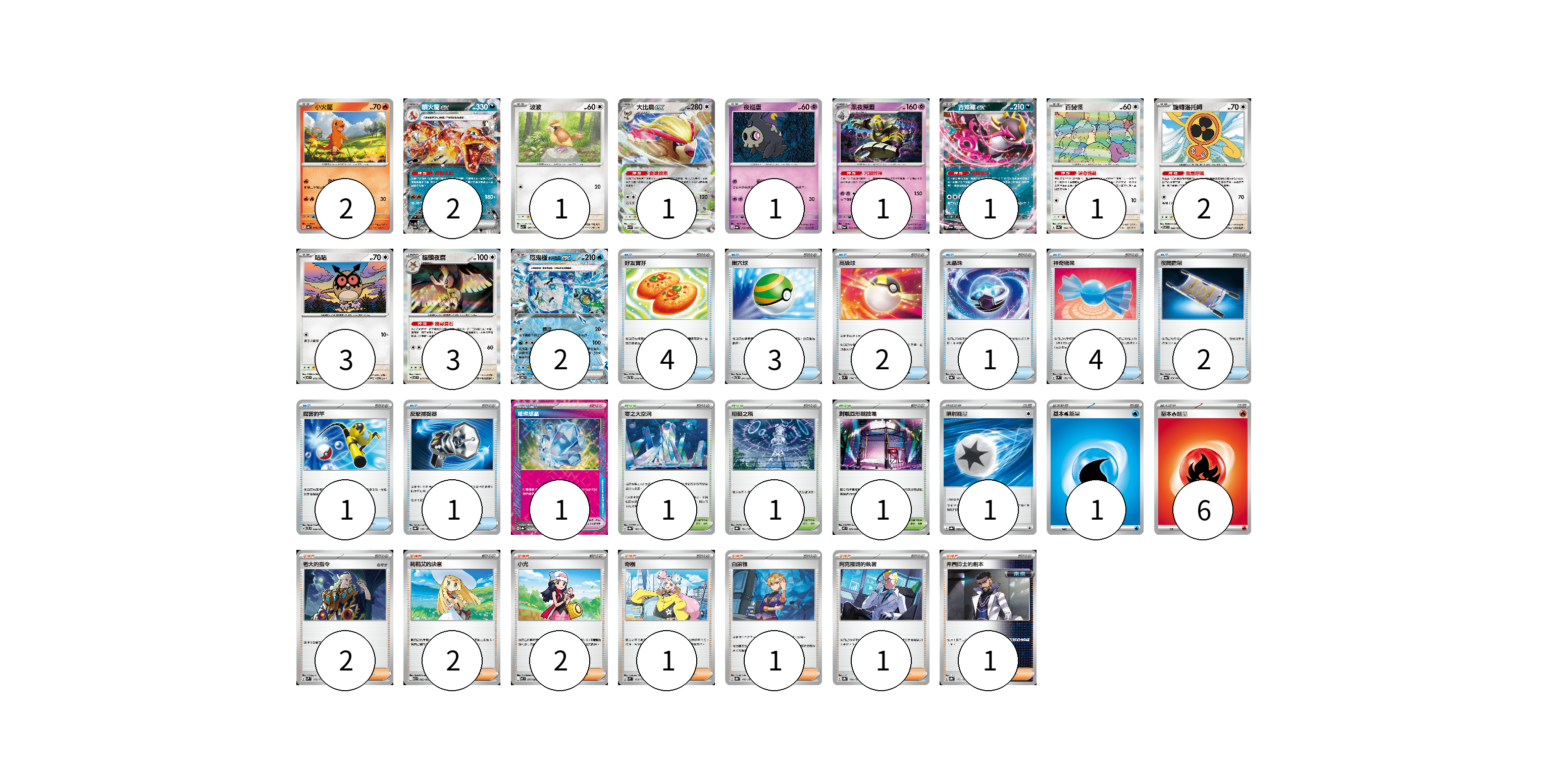 牌組構築方案 以此牌組為基礎新構築牌組 顯示卡面 顯示列表 寶可夢卡(20) 2 2 1 1 1 1 1 1 2 3 3 2 寶可夢道具(1) 1 物品卡(18) 4 3 2 1 4 2 1 1 支援者卡(10) 2 2 2 1 1 1 1 競技場卡(3) 1 1 1 能量卡(8) 1 1 6 寶可夢卡(20) 卡牌名稱 張數 卡牌名稱 張數 小火龍 SV4a 025/190 02 噴火龍ex SV4a 115/190 02 波波 SV3 087/108 01 大比鳥ex SV3 089/108 01 夜巡靈 SV6a 018/064 01 黑夜魔靈 SV6a 020/064 01 吉雉雞ex SV6a 038/064 01 百變怪 SV4a 144/190 01 旋轉洛托姆 SV7 080/102 02 咕咕 SV7 076/102 03 貓頭夜鷹 SV7 077/102 03 厄鬼椪 水井面具ex SV6 038/101 02 寶可夢道具(1) 卡牌名稱 張數 卡牌名稱 張數 璀璨結晶 SV8a 152/187 01 物品卡(18) 卡牌名稱 張數 卡牌名稱 張數 好友寶芬 SVTL 010/021 04 巢穴球 SVTL 011/021 03 高級球 SVM 134/175 02 太晶珠 SV8a 145/187 01 神奇糖果 SVM 135/175 04 夜間擔架 SV6a 056/064 02 厲害釣竿 SVTL 009/021 01 反擊捕捉器 SV8a 139/187 01 支援者卡(10) 卡牌名稱 張數 卡牌名稱 張數 老大的指令 SVM 172/175 02 莉莉艾的決意 M1L 062/063 02 小光 M2 077/080 02 奇樹 SVM 160/175 01 白蕾雅 SV8a 176/187 01 阿克羅瑪的執著 SV8a 164/187 01 弗圖博士的劇本 SV8a 175/187 01 競技場卡(3) 卡牌名稱 張數 卡牌名稱 張數 零之大空洞 SV8a 182/187 01 阻礙之塔 SV8a 181/187 01 對戰圓形競技場 M2 079/080 01 能量卡(8) 卡牌名稱 張數 卡牌名稱 張數 噴射能量 SV8a 185/187 01 基本【水】能量 SVF WAT 01 基本【火】能量 SVTL FIR 06 以此牌組為基礎新構築牌組 牌組編碼 eKmJqO-YUqsdx-tyTcQn copy 列印牌組單 牌組編碼已複製 分享至SNS
