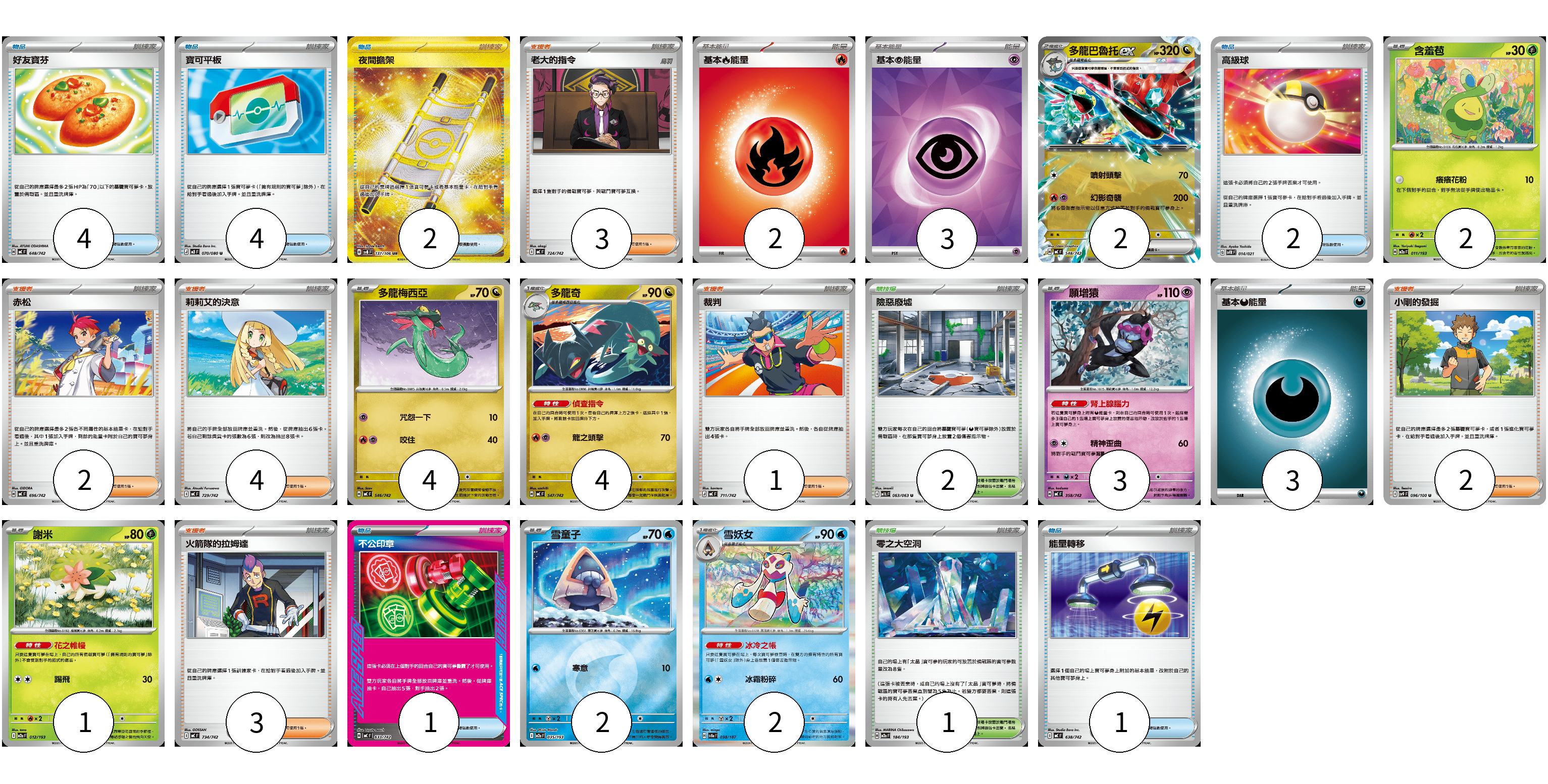 牌組構築方案 以此牌組為基礎新構築牌組 顯示卡面 顯示列表 寶可夢卡(20) 2 2 4 4 3 1 2 2 物品卡(14) 4 4 2 2 1 1 支援者卡(15) 3 2 4 1 2 3 競技場卡(3) 2 1 能量卡(8) 2 3 3 寶可夢卡(20) 卡牌名稱 張數 卡牌名稱 張數 多龍巴魯托ex MC 548/742 02 含羞苞 M2a 011/193 02 多龍梅西亞 MC 546/742 04 多龍奇 MC 547/742 04 願增猿 MC 358/742 03 謝米 M2a 012/193 01 雪童子 M2a 035/193 02 雪妖女 SV8a 038/187 02 物品卡(14) 卡牌名稱 張數 卡牌名稱 張數 好友寶芬 MC 648/742 04 寶可平板 M3 070/080 04 夜間擔架 SV8 137/106 02 高級球 SVTR 014/021 02 不公印章 MC 633/742 01 能量轉移 MC 638/742 01 支援者卡(15) 卡牌名稱 張數 卡牌名稱 張數 老大的指令 MC 724/742 03 赤松 MC 696/742 02 莉莉艾的決意 MC 729/742 04 裁判 MC 711/742 01 小剛的發掘 SV9 096/100 02 火箭隊的拉姆達 MC 734/742 03 競技場卡(3) 卡牌名稱 張數 卡牌名稱 張數 險惡廢墟 M1L 063/063 02 零之大空洞 M2a 184/193 01 能量卡(8) 卡牌名稱 張數 卡牌名稱 張數 基本【火】能量 MC FIR 02 基本【超】能量 SVOD PSY 03 基本【惡】能量 MC DAR 03 以此牌組為基礎新構築牌組 牌組編碼 eLPCwz-jxcOKC-FqIKlu copy 列印牌組單 牌組編碼已複製 分享至SNS