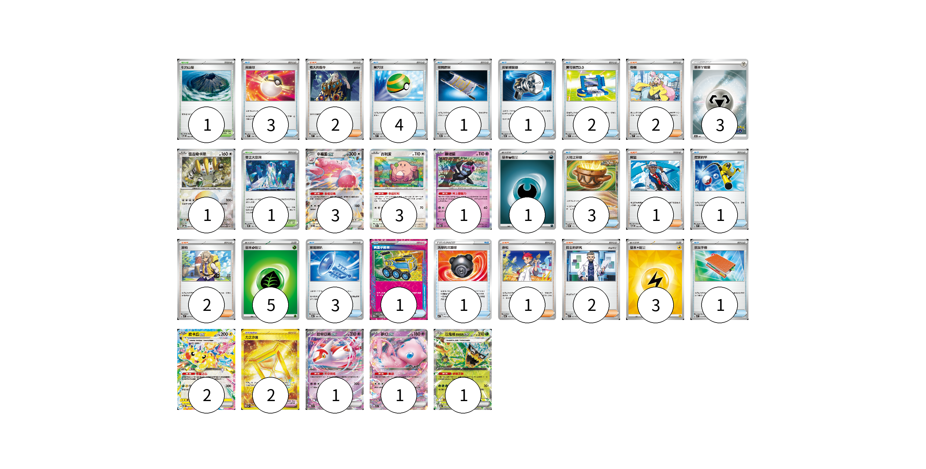 牌組構築方案 以此牌組為基礎新構築牌組 顯示卡面 顯示列表 寶可夢卡(13) 1 3 3 1 2 1 1 1 寶可夢道具(2) 2 物品卡(21) 3 4 1 1 2 3 1 3 1 1 1 支援者卡(10) 2 2 1 2 1 2 競技場卡(2) 1 1 能量卡(12) 3 1 5 3 寶可夢卡(13) 卡牌名稱 張數 卡牌名稱 張數 雷吉奇卡斯 SV8a 132/187 01 幸福蛋ex SV6 085/101 03 吉利蛋 SV2a 113/165 03 願增猿 SV8a 075/187 01 皮卡丘ex SV8 033/106 02 拉帝亞斯ex SV7a 019/064 01 夢幻ex SV2a 151/165 01 厄鬼椪 碧草面具ex SV8a 020/187 01 寶可夢道具(2) 卡牌名稱 張數 卡牌名稱 張數 力之沙漏 SV6a 094/064 02 物品卡(21) 卡牌名稱 張數 卡牌名稱 張數 高級球 SVM 134/175 03 巢穴球 SVM 133/175 04 夜間擔架 SV8a 151/187 01 反擊捕捉器 SV8a 139/187 01 寶可裝置3.0 SVK 021/042 02 大地之容器 SV8a 143/187 03 厲害釣竿 SVK 011/042 01 玻璃喇叭 SV8a 140/187 03 貴重手推車 SVK 020/042 01 洗翠的沉重球 SVF 019/038 01 朋友手冊 SVK 014/042 01 支援者卡(10) 卡牌名稱 張數 卡牌名稱 張數 老大的指令 SVM 172/175 02 奇樹 SVM 160/175 02 席藍 SV8 102/106 01 派帕 SVK 035/042 02 赤松 SV8a 163/187 01 博士的研究 SVK 033/042 02 競技場卡(2) 卡牌名稱 張數 卡牌名稱 張數 引力山岳 SV8 106/106 01 零之大空洞 SV8a 182/187 01 能量卡(12) 卡牌名稱 張數 卡牌名稱 張數 基本鋼能量 S10b MET 03 基本惡能量 sv-p DAR 01 基本草能量 sv-p GRA 05 基本【雷】能量 SVK LIG 03 以此牌組為基礎新構築牌組 牌組編碼 eLjqcB-ovzqJt-cBwGqi copy 列印牌組單 牌組編碼已複製 分享至SNS