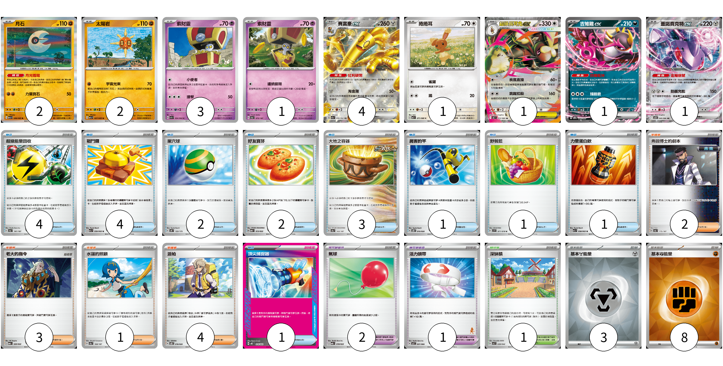 牌組構築方案 以此牌組為基礎新構築牌組 顯示卡面 顯示列表 寶可夢卡(16) 2 2 3 1 4 1 1 1 1 寶可夢道具(3) 2 1 物品卡(19) 4 4 2 2 3 1 1 1 1 支援者卡(10) 2 3 1 4 競技場卡(1) 1 能量卡(11) 3 8 寶可夢卡(16) 卡牌名稱 張數 卡牌名稱 張數 月石 M1L 026/063 02 太陽岩 M1L 027/063 02 索財靈 SV7a 024/064 03 索財靈 SV8a 073/187 01 賽富豪ex SV3a 050/062 04 捲捲耳 M2 071/080 01 超級長耳兔ex M2 072/080 01 吉雉雞ex SVOD 004/020 01 蓋諾賽克特ex SV11B 069/086 01 寶可夢道具(3) 卡牌名稱 張數 卡牌名稱 張數 氣球 MBD 018/022 02 活力頭帶 SVI 057/066 01 物品卡(19) 卡牌名稱 張數 卡牌名稱 張數 超級能量回收 SV8a 141/187 04 戰鬥鑼 M1L 059/063 04 巢穴球 SVM 133/175 02 好友寶芬 MBD 013/022 02 大地之容器 SV8a 143/187 03 厲害釣竿 SVOD 010/020 01 野餐籃 SV1V 071/078 01 力量蛋白飲 M1L 058/063 01 頂尖捕捉器 MBG 014/022 01 支援者卡(10) 卡牌名稱 張數 卡牌名稱 張數 弗圖博士的劇本 SV8a 175/187 02 老大的指令 MBD 020/022 03 水蓮的照顧 SV8a 168/187 01 派帕 SVOD 018/020 04 競技場卡(1) 卡牌名稱 張數 卡牌名稱 張數 深缽鎮 SVK 039/042 01 能量卡(11) 卡牌名稱 張數 卡牌名稱 張數 基本【鋼】能量 SVOD MET 03 基本【鬥】能量 SVM FIG 08 以此牌組為基礎新構築牌組 牌組編碼 eNXADv-GJQwgM-NdlUnW copy 列印牌組單 牌組編碼已複製 分享至SNS