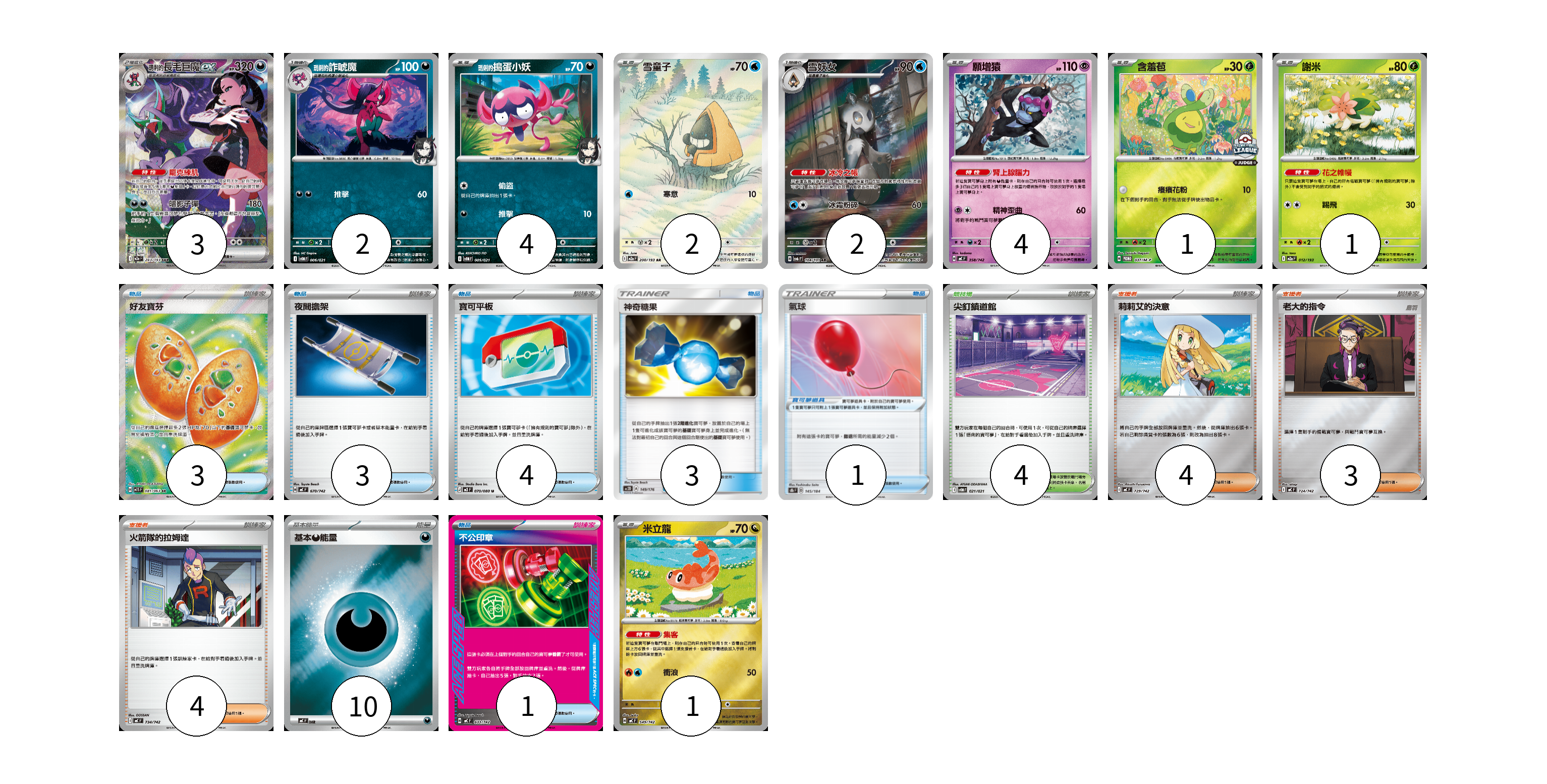 牌組構築方案 以此牌組為基礎新構築牌組 顯示卡面 顯示列表 寶可夢卡(20) 3 2 4 2 2 4 1 1 1 寶可夢道具(1) 1 物品卡(14) 3 3 4 3 1 支援者卡(11) 4 3 4 競技場卡(4) 4 能量卡(10) 10 寶可夢卡(20) 卡牌名稱 張數 卡牌名稱 張數 <瑪俐的>長毛巨魔ex M2a 243/193 03 <瑪俐的>詐唬魔 SVOM 006/021 02 <瑪俐的>搗蛋小妖 SVOM 005/021 04 雪童子 M2a 200/193 02 雪妖女 SV6 104/101 02 願增猿 MC 358/742 04 含羞苞 M-P 037/M-P 01 謝米 M2a 012/193 01 米立龍 MC 549/742 01 寶可夢道具(1) 卡牌名稱 張數 卡牌名稱 張數 氣球 S8b 145/184 01 物品卡(14) 卡牌名稱 張數 卡牌名稱 張數 好友寶芬 M1S 081/063 03 夜間擔架 MC 670/742 03 寶可平板 M3 070/080 04 神奇糖果 AC2D 149/176 03 不公印章 MC 633/742 01 支援者卡(11) 卡牌名稱 張數 卡牌名稱 張數 莉莉艾的決意 MC 729/742 04 老大的指令 MC 724/742 03 火箭隊的拉姆達 MC 734/742 04 競技場卡(4) 卡牌名稱 張數 卡牌名稱 張數 尖釘鎮道館 SVOM 021/021 04 能量卡(10) 卡牌名稱 張數 卡牌名稱 張數 基本【惡】能量 MC DAR 10 以此牌組為基礎新構築牌組 牌組編碼 eNxzXd-efpDRB-ZSiWfx copy 列印牌組單 牌組編碼已複製 分享至SNS