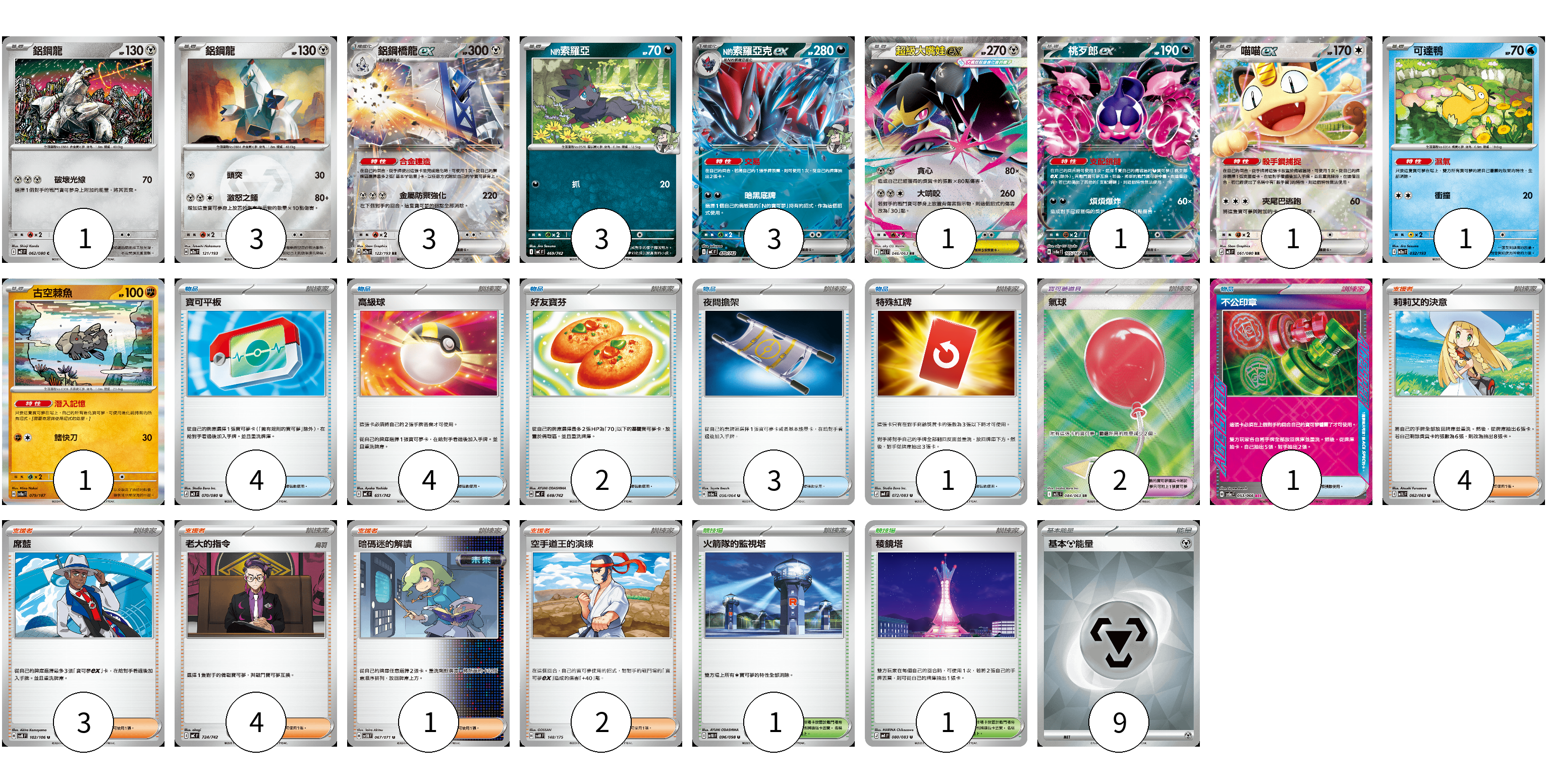 牌組構築方案 以此牌組為基礎新構築牌組 顯示卡面 顯示列表 寶可夢卡(18) 1 3 3 3 3 1 1 1 1 1 寶可夢道具(2) 2 物品卡(15) 4 4 2 3 1 1 支援者卡(14) 4 3 4 1 2 競技場卡(2) 1 1 能量卡(9) 9 寶可夢卡(18) 卡牌名稱 張數 卡牌名稱 張數 鋁鋼龍 M2 062/080 01 鋁鋼龍 M2a 121/193 03 鋁鋼橋龍ex M2a 122/193 03 <N的>索羅亞 MC 469/742 03 <N的>索羅亞克ex MC 470/742 03 超級大嘴娃ex M1L 046/063 01 桃歹郎ex SV8a 105/187 01 喵喵ex M3 061/080 01 可達鴨 M2a 032/193 01 古空棘魚 SV8a 079/187 01 寶可夢道具(2) 卡牌名稱 張數 卡牌名稱 張數 氣球 M1L 084/063 02 物品卡(15) 卡牌名稱 張數 卡牌名稱 張數 寶可平板 M3 070/080 04 高級球 MC 651/742 04 好友寶芬 MC 648/742 02 夜間擔架 SV6a 056/064 03 特殊紅牌 M4 072/083 01 不公印章 SV5a 053/066 01 支援者卡(14) 卡牌名稱 張數 卡牌名稱 張數 莉莉艾的決意 M1L 062/063 04 席藍 SV8 102/106 03 老大的指令 MC 724/742 04 暗碼迷的解讀 SV5M 067/071 01 空手道王的演練 SVM 148/175 02 競技場卡(2) 卡牌名稱 張數 卡牌名稱 張數 火箭隊的監視塔 SV10 096/098 01 稜鏡塔 M4 080/083 01 能量卡(9) 卡牌名稱 張數 卡牌名稱 張數 基本【鋼】能量 SVOD MET 09 以此牌組為基礎新構築牌組 牌組編碼 eORben-ZkXFqk-MTCEXS copy 列印牌組單 牌組編碼已複製 分享至SNS