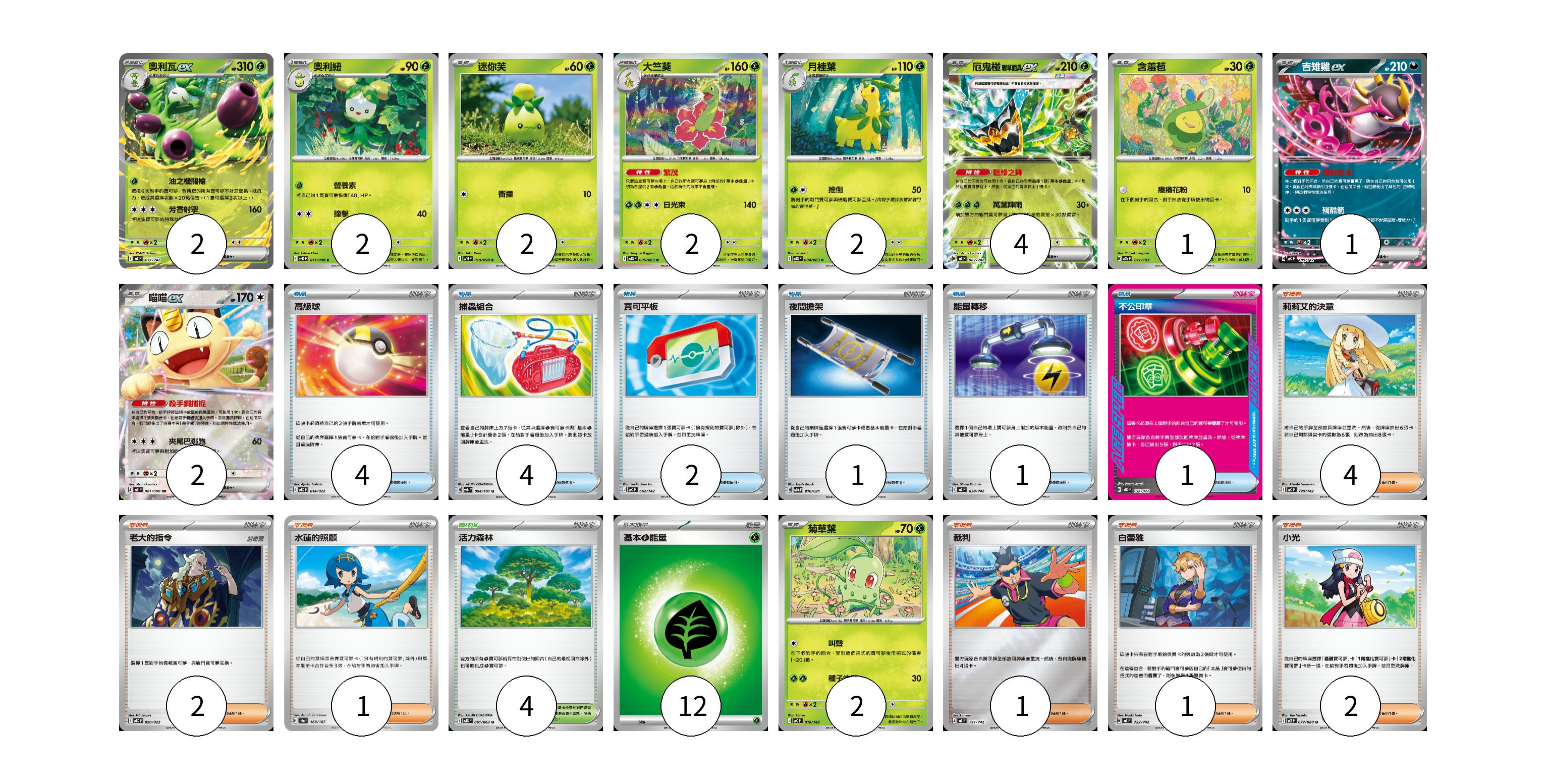 牌組構築方案 以此牌組為基礎新構築牌組 顯示卡面 顯示列表 寶可夢卡(20) 2 2 2 2 2 4 1 1 2 2 物品卡(13) 4 4 2 1 1 1 支援者卡(11) 4 2 1 1 1 2 競技場卡(4) 4 能量卡(12) 12 寶可夢卡(20) 卡牌名稱 張數 卡牌名稱 張數 奧利瓦ex MC 071/742 02 奧利紐 SV10 011/098 02 迷你芙 SV10 010/098 02 大竺葵 M1S 005/063 02 月桂葉 M1S 004/063 02 厄鬼椪 碧草面具ex MC 082/742 04 含羞苞 M2a 011/193 01 吉雉雞ex MC 489/742 01 喵喵ex M3 061/080 02 菊草葉 MC 016/742 02 物品卡(13) 卡牌名稱 張數 卡牌名稱 張數 高級球 MBD 014/022 04 捕蟲組合 SV6 094/101 04 寶可平板 MC 662/742 02 夜間擔架 SVOM 016/021 01 能量轉移 MC 638/742 01 不公印章 MBD 011/022 01 支援者卡(11) 卡牌名稱 張數 卡牌名稱 張數 莉莉艾的決意 MC 729/742 04 老大的指令 MBD 020/022 02 水蓮的照顧 SV8a 168/187 01 裁判 MC 711/742 01 白蕾雅 MC 722/742 01 小光 M2 077/080 02 競技場卡(4) 卡牌名稱 張數 卡牌名稱 張數 活力森林 M1S 061/063 04 能量卡(12) 卡牌名稱 張數 卡牌名稱 張數 基本【草】能量 MC GRA 12 以此牌組為基礎新構築牌組 牌組編碼 eQLBmJ-vhmeNN-HhZJeu copy 列印牌組單 牌組編碼已複製 分享至SNS