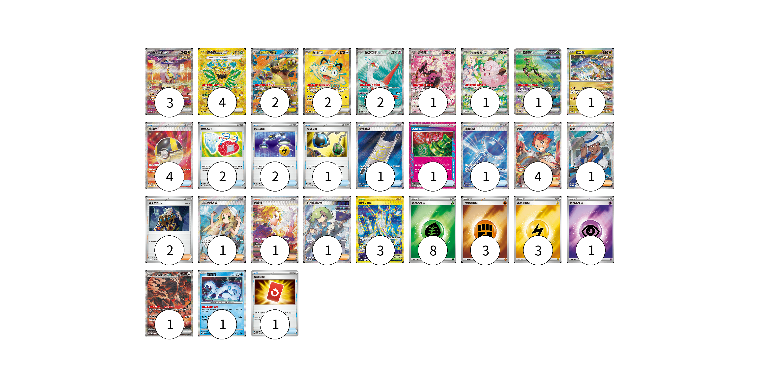 牌組構築方案 以此牌組為基礎新構築牌組 顯示卡面 顯示列表 寶可夢卡(19) 3 4 2 2 2 1 1 1 1 1 1 物品卡(13) 4 2 2 1 1 1 1 1 支援者卡(10) 4 1 2 1 1 1 競技場卡(3) 3 能量卡(15) 8 3 3 1 寶可夢卡(19) 卡牌名稱 張數 卡牌名稱 張數 猛雷鼓ex SV5K 095/071 03 厄鬼椪 碧草面具ex SV6 131/101 04 超級袋獸ex M1S 080/063 02 喵喵ex M3 100/080 02 拉帝亞斯ex SV7a 078/064 02 吉雉雞ex M2a 244/193 01 莉莉艾的皮皮ex SV9 126/100 01 鐵斑葉ex SV5M 093/071 01 猛雷鼓 SV7 075/102 01 月月熊 赫月ex SV8a 225/187 01 古劍豹 SV8 032/106 01 物品卡(13) 卡牌名稱 張數 卡牌名稱 張數 高級球 M2a 216/193 04 捕蟲組合 MC 667/742 02 能量轉移 MC 638/742 02 能量回收 SV11W 079/086 01 夜間擔架 M1L 083/063 01 不公印章 SV5a 053/066 01 玻璃喇叭 M2a 215/193 01 特殊紅牌 M4 072/083 01 支援者卡(10) 卡牌名稱 張數 卡牌名稱 張數 赤松 SV7 123/102 04 席藍 SV8 127/106 01 老大的指令 MBG 021/022 02 莉莉艾的決意 M1L 086/063 01 白蕾雅 SV7 132/102 01 暗碼迷的解讀 SV5M 090/071 01 競技場卡(3) 卡牌名稱 張數 卡牌名稱 張數 零之大空洞 SV7 135/102 03 能量卡(15) 卡牌名稱 張數 卡牌名稱 張數 基本【草】能量 MC GRA 08 基本【鬥】能量 MC FIG 03 基本【雷】能量 MC LIG 03 基本【超】能量 MC PSY 01 以此牌組為基礎新構築牌組 牌組編碼 eQMvLw-boaMYa-BOZDDU copy 列印牌組單 牌組編碼已複製 分享至SNS
