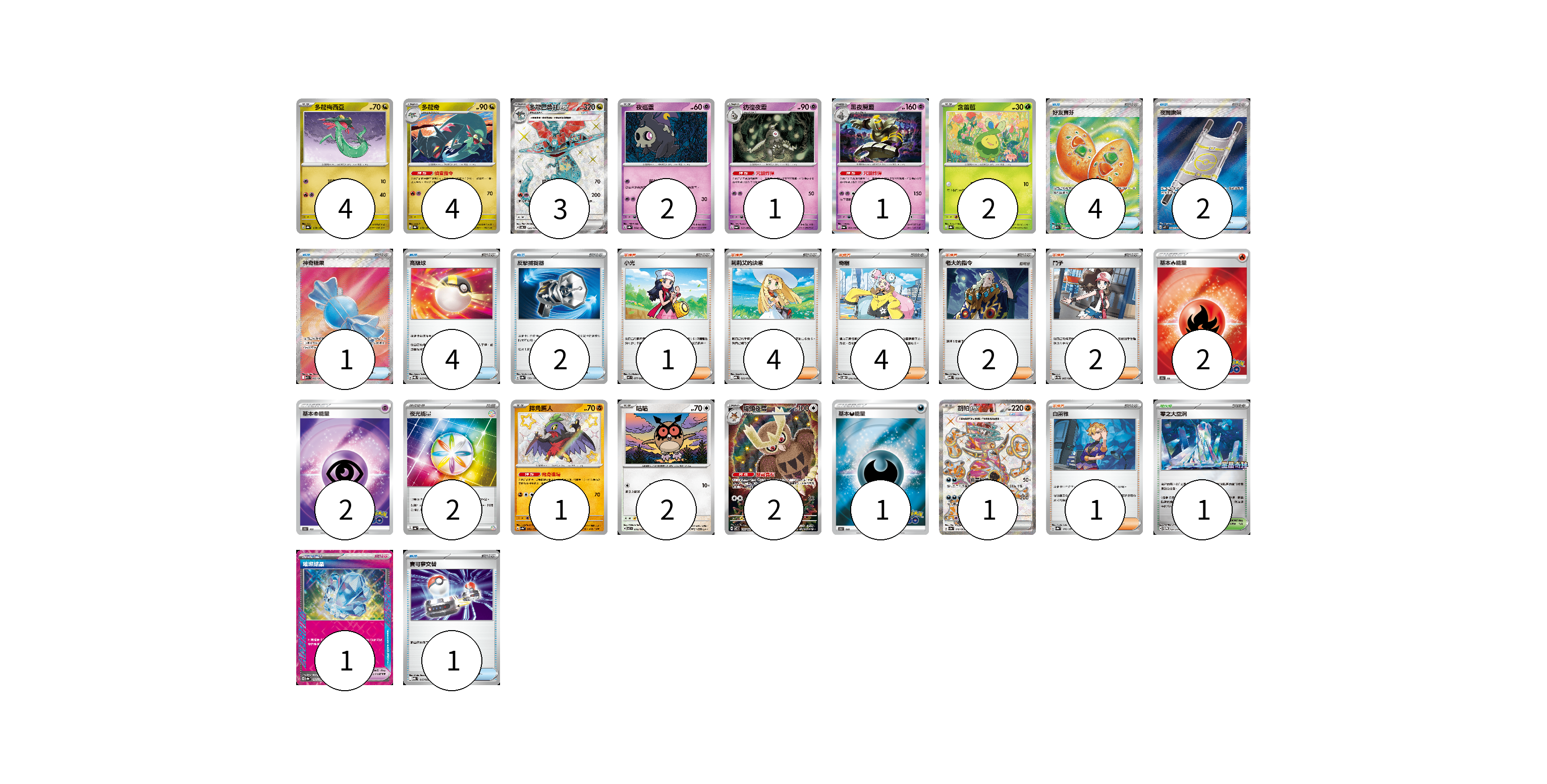 牌組構築方案 以此牌組為基礎新構築牌組 顯示卡面 顯示列表 寶可夢卡(23) 4 4 3 2 1 1 2 1 2 2 1 寶可夢道具(1) 1 物品卡(14) 4 2 1 4 2 1 支援者卡(14) 1 4 4 2 2 1 競技場卡(1) 1 能量卡(7) 2 2 2 1 寶可夢卡(23) 卡牌名稱 張數 卡牌名稱 張數 多龍梅西亞 SV8a 118/187 04 多龍奇 SV8a 119/187 04 多龍巴魯托ex SV6 120/101 03 夜巡靈 SV8a 064/187 02 彷徨夜靈 SV6a 019/064 01 黑夜魔靈 SV6a 020/064 01 含羞苞 SV8a 001/187 02 摔角鷹人 SV4a 282/190 01 咕咕 SV7 076/102 02 貓頭夜鷹 SV7 114/102 02 胡帕ex SV3a 078/062 01 寶可夢道具(1) 卡牌名稱 張數 卡牌名稱 張數 璀璨結晶 SV8a 152/187 01 物品卡(14) 卡牌名稱 張數 卡牌名稱 張數 好友寶芬 M1S 081/063 04 夜間擔架 M1L 083/063 02 神奇糖果 M1S 082/063 01 高級球 SVQL 015/022 04 反擊捕捉器 SV8a 139/187 02 寶可夢交替 MBG 015/022 01 支援者卡(14) 卡牌名稱 張數 卡牌名稱 張數 小光 M2 077/080 01 莉莉艾的決意 MBG 022/022 04 奇樹 SVOD 016/020 04 老大的指令 MBD 020/022 02 鬥子 SV11W 085/086 02 白蕾雅 SV8a 176/187 01 競技場卡(1) 卡牌名稱 張數 卡牌名稱 張數 零之大空洞 SV-P 151/SV-P 01 能量卡(7) 卡牌名稱 張數 卡牌名稱 張數 基本火能量 S10b FIR 02 基本超能量 S10b PSY 02 夜光能量 SV4a 190/190 02 基本惡能量 S10b DAR 01 以此牌組為基礎新構築牌組 牌組編碼 eQjrvm-RFDoLn-gEKGqs copy 列印牌組單 牌組編碼已複製 分享至SNS