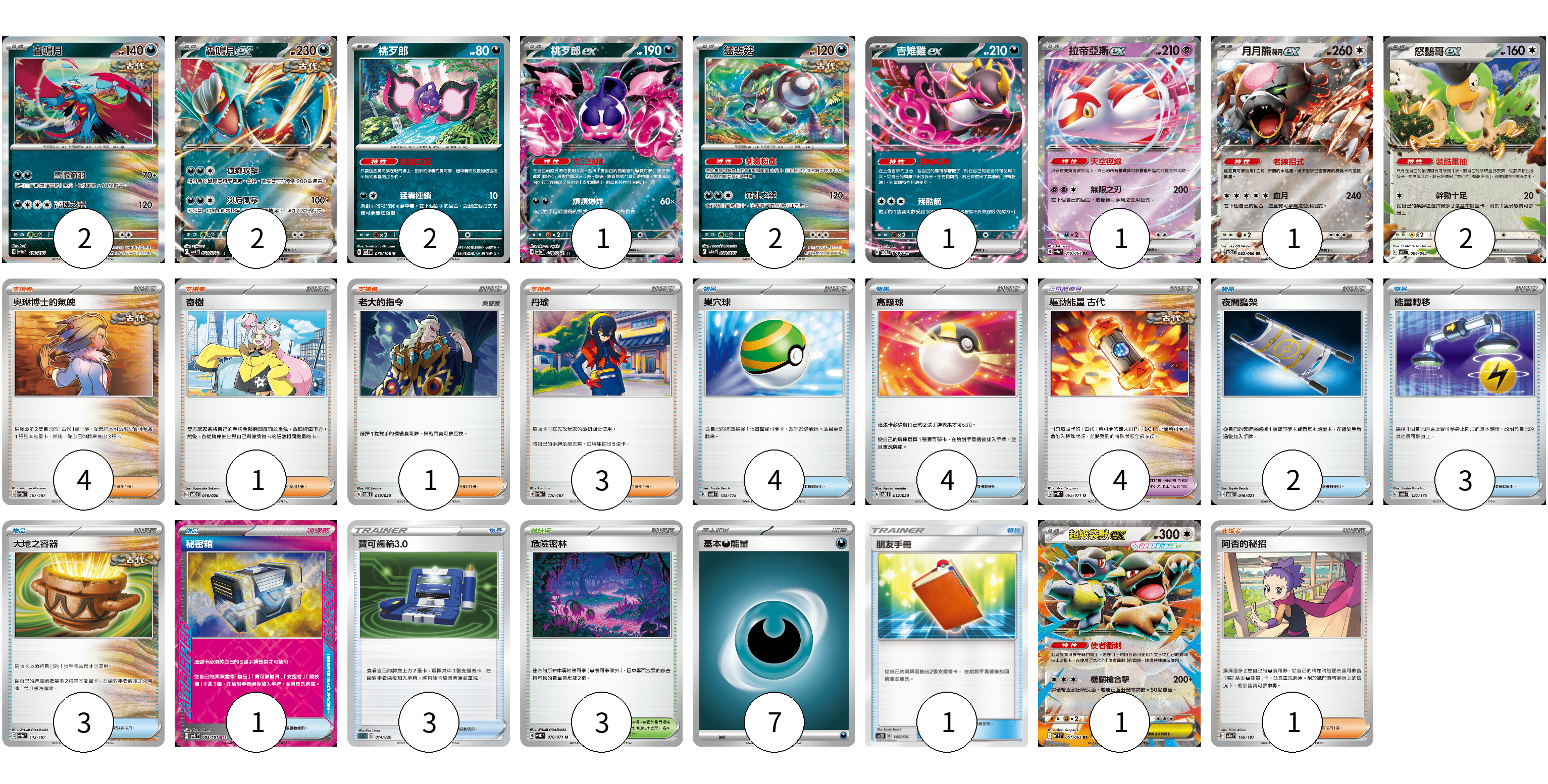 牌組構築方案 以此牌組為基礎新構築牌組 顯示卡面 顯示列表 寶可夢卡(15) 2 2 2 1 2 1 1 1 2 1 寶可夢道具(4) 4 物品卡(21) 4 4 2 3 3 1 3 1 支援者卡(10) 4 1 1 3 1 競技場卡(3) 3 能量卡(7) 7 寶可夢卡(15) 卡牌名稱 張數 卡牌名稱 張數 轟鳴月 SV8a 100/187 02 轟鳴月ex SV4K 054/066 02 桃歹郎 SV8 075/106 02 桃歹郎ex SV6a 039/064 01 猛惡菇 SV8a 099/187 02 吉雉雞ex SVOM 009/021 01 拉帝亞斯ex SV7a 019/064 01 月月熊 赫月 ex SV5a 052/066 01 怒鸚哥ex SVK 006/042 02 超級袋獸ex M1S 051/063 01 寶可夢道具(4) 卡牌名稱 張數 卡牌名稱 張數 驅勁能量 古代 SV5K 065/071 04 物品卡(21) 卡牌名稱 張數 卡牌名稱 張數 巢穴球 SVM 133/175 04 高級球 SVOD 012/020 04 夜間擔架 SVOM 016/021 02 能量轉移 SVM 127/175 03 大地之容器 SV8a 143/187 03 秘密箱 SV6 092/101 01 寶可齒輪3.0 SLD 014/020 03 朋友手冊 AC2D 145/176 01 支援者卡(10) 卡牌名稱 張數 卡牌名稱 張數 奧琳博士的氣魄 SV8a 167/187 04 奇樹 SVOD 016/020 01 老大的指令 SVOD 019/020 01 丹瑜 SV8a 170/187 03 阿杏的秘招 SV8a 166/187 01 競技場卡(3) 卡牌名稱 張數 卡牌名稱 張數 危險密林 SV5K 070/071 03 能量卡(7) 卡牌名稱 張數 卡牌名稱 張數 基本【惡】能量 SVF DAR 07 以此牌組為基礎新構築牌組 牌組編碼 eRnEjt-DvPsif-HPpXhp copy 列印牌組單 牌組編碼已複製 分享至SNS