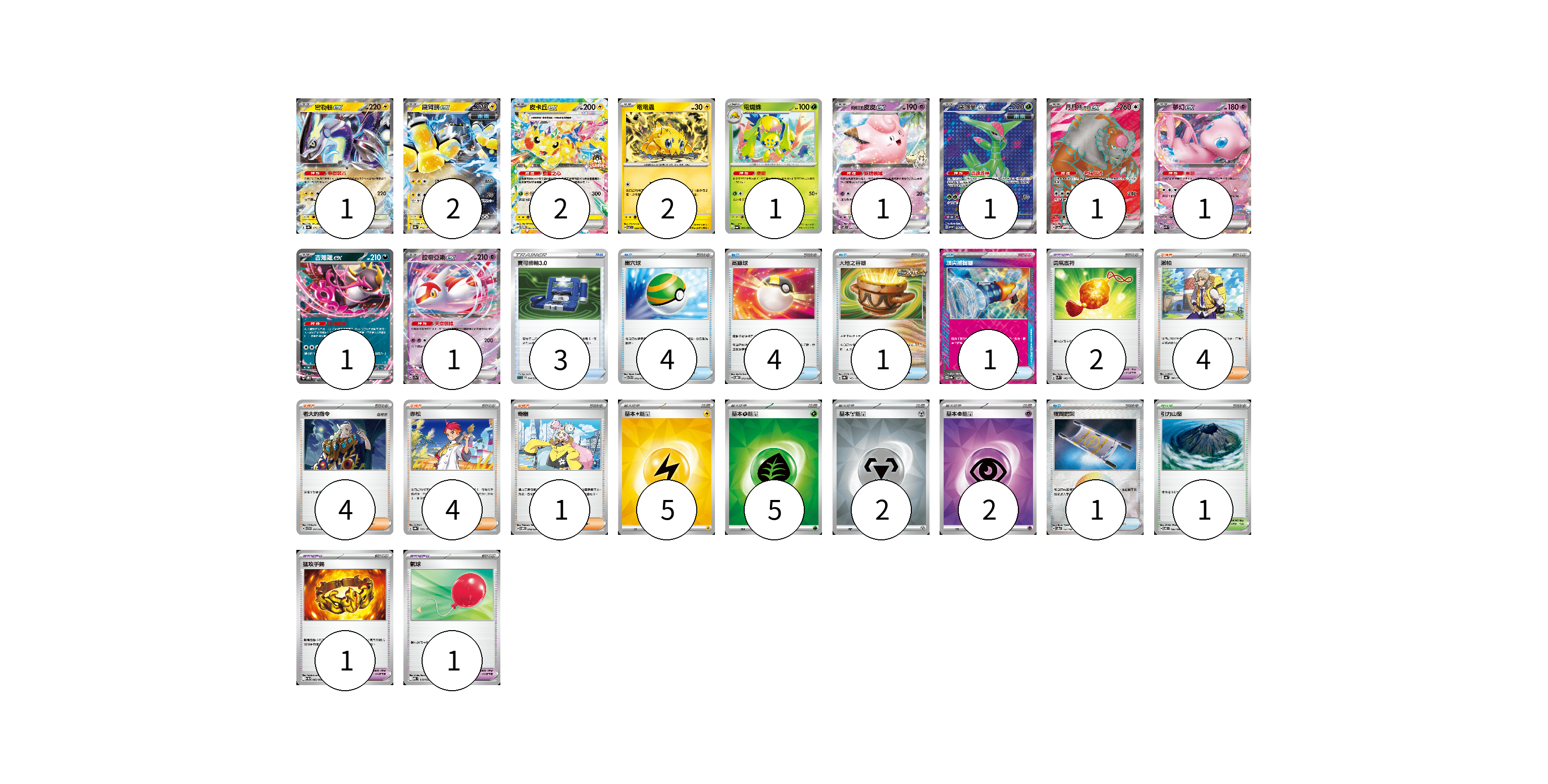 牌組構築方案 以此牌組為基礎新構築牌組 顯示卡面 顯示列表 寶可夢卡(14) 1 2 2 2 1 1 1 1 1 1 1 寶可夢道具(4) 2 1 1 物品卡(14) 3 4 4 1 1 1 支援者卡(13) 4 4 4 1 競技場卡(1) 1 能量卡(14) 5 5 2 2 寶可夢卡(14) 卡牌名稱 張數 卡牌名稱 張數 密勒頓ex SV4a 071/190 01 鐵臂膀ex SV8a 054/187 02 皮卡丘ex SV-P 185/SV-P 02 電電蟲 SV7 032/102 02 電蜘蛛 SV6a 002/064 01 莉莉艾的皮皮ex SV9 033/100 01 鐵斑葉ex SV5M 084/071 01 月月熊 赫月 ex SV5a 084/066 01 夢幻ex SVK 001/042 01 吉雉雞ex SVOD 004/020 01 拉帝亞斯ex SV7a 019/064 01 寶可夢道具(4) 卡牌名稱 張數 卡牌名稱 張數 勇氣護符 SVM 142/175 02 猛攻手鐲 SV11W 082/086 01 氣球 MBD 018/022 01 物品卡(14) 卡牌名稱 張數 卡牌名稱 張數 寶可齒輪3.0 SLD 014/020 03 巢穴球 SVTG 012/019 04 高級球 SVOD 012/020 04 大地之容器 SV8a 143/187 01 頂尖捕捉器 SV8a 148/187 01 夜間擔架 SV8a 151/187 01 支援者卡(13) 卡牌名稱 張數 卡牌名稱 張數 派帕 SV4a 180/190 04 老大的指令 SVTH 017/018 04 赤松 SV8a 163/187 04 奇樹 SVOM 018/021 01 競技場卡(1) 卡牌名稱 張數 卡牌名稱 張數 引力山岳 SV8 106/106 01 能量卡(14) 卡牌名稱 張數 卡牌名稱 張數 基本【雷】能量 SVK LIG 05 基本【草】能量 SVK GRA 05 基本【鋼】能量 SVOD MET 02 基本【超】能量 SVOD PSY 02 以此牌組為基礎新構築牌組 牌組編碼 eSdYkx-CyvbtR-IHxbGe copy 列印牌組單 牌組編碼已複製 分享至SNS