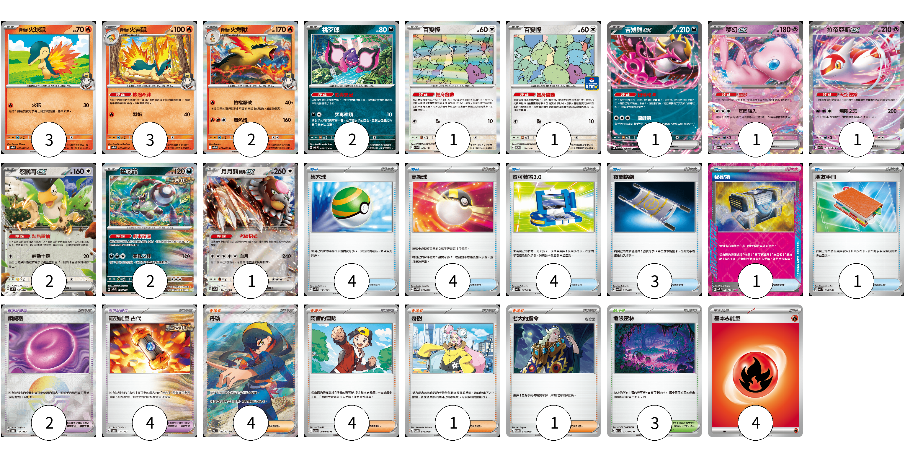 牌組構築方案 以此牌組為基礎新構築牌組 顯示卡面 顯示列表 寶可夢卡(20) 3 3 2 2 1 1 1 1 1 2 2 1 寶可夢道具(6) 2 4 物品卡(17) 4 4 4 3 1 1 支援者卡(10) 4 4 1 1 競技場卡(3) 3 能量卡(4) 4 寶可夢卡(20) 卡牌名稱 張數 卡牌名稱 張數 <阿響的>火球鼠 SV9a 015/063 03 <阿響的>火岩鼠 SV9a 016/063 03 <阿響的>火爆獸 SV9a 017/063 02 桃歹郎 SV8 075/106 02 百變怪 SV4a 144/190 01 百變怪 SV-P 111/SV-P 01 吉雉雞ex SVOD 004/020 01 夢幻ex SVK 001/042 01 拉帝亞斯ex SV7a 019/064 01 怒鸚哥ex SVK 006/042 02 猛惡菇 SV8a 099/187 02 月月熊 赫月ex SV8a 134/187 01 寶可夢道具(6) 卡牌名稱 張數 卡牌名稱 張數 鎖鏈糬 SV8a 154/187 02 驅勁能量 古代 SV8a 157/187 04 物品卡(17) 卡牌名稱 張數 卡牌名稱 張數 巢穴球 SVM 133/175 04 高級球 SVOD 012/020 04 寶可裝置3.0 SVK 021/042 04 夜間擔架 SVOM 016/021 03 秘密箱 SV6 092/101 01 朋友手冊 SVK 014/042 01 支援者卡(10) 卡牌名稱 張數 卡牌名稱 張數 丹瑜 SV6 123/101 04 阿響的冒險 SV9a 063/063 04 奇樹 SVOD 016/020 01 老大的指令 SVOD 019/020 01 競技場卡(3) 卡牌名稱 張數 卡牌名稱 張數 危險密林 SV5K 070/071 03 能量卡(4) 卡牌名稱 張數 卡牌名稱 張數 基本火能量 sv-p FIR 04 以此牌組為基礎新構築牌組 牌組編碼 eWhlFc-ltmieU-FSBGQZ copy 列印牌組單 牌組編碼已複製 分享至SNS