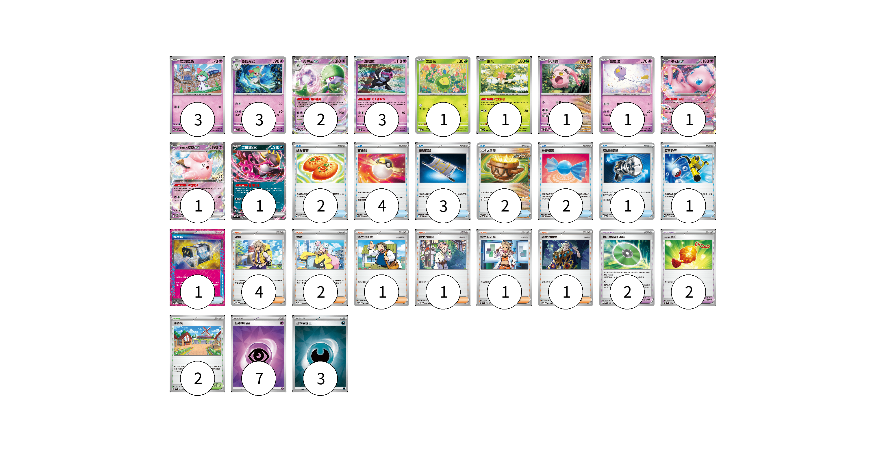 牌組構築方案 以此牌組為基礎新構築牌組 顯示卡面 顯示列表 寶可夢卡(18) 3 3 2 3 1 1 1 1 1 1 1 寶可夢道具(4) 2 2 物品卡(16) 2 4 3 2 2 1 1 1 支援者卡(10) 4 2 1 1 1 1 競技場卡(2) 2 能量卡(10) 7 3 寶可夢卡(18) 卡牌名稱 張數 卡牌名稱 張數 拉魯拉絲 SVTS 002/022 03 奇魯莉安 SV4a 081/190 03 沙奈朵ex SV4a 082/190 02 願增猿 SV8a 075/187 03 含羞苞 SV8a 001/187 01 謝米 SV9a 006/063 01 吼叫尾 SV8a 071/187 01 飄飄球 SVTS 005/022 01 夢幻ex SVK 001/042 01 莉莉艾的皮皮ex SV9 033/100 01 吉雉雞ex SVOD 004/020 01 寶可夢道具(4) 卡牌名稱 張數 卡牌名稱 張數 招式學習器 演進 SV8a 160/187 02 勇氣護符 SVM 142/175 02 物品卡(16) 卡牌名稱 張數 卡牌名稱 張數 好友寶芬 SVOD 011/020 02 高級球 SVOD 012/020 04 夜間擔架 SVOM 016/021 03 大地之容器 SV8a 143/187 02 神奇糖果 SVOD 013/020 02 反擊捕捉器 SV8a 139/187 01 厲害釣竿 SVOD 010/020 01 秘密箱 SV6 092/101 01 支援者卡(10) 卡牌名稱 張數 卡牌名稱 張數 派帕 SVOD 018/020 04 奇樹 SVOD 016/020 02 博士的研究 SVOD 017/020 01 博士的研究 SVOM 019/021 01 博士的研究 SVK 032/042 01 老大的指令 SVOD 019/020 01 競技場卡(2) 卡牌名稱 張數 卡牌名稱 張數 深缽鎮 SVK 039/042 02 能量卡(10) 卡牌名稱 張數 卡牌名稱 張數 基本【超】能量 SVOD PSY 07 基本【惡】能量 SVOM DAR 03 以此牌組為基礎新構築牌組 牌組編碼 eWsukx-MWWrLB-iNMuTR copy 列印牌組單 牌組編碼已複製 分享至SNS