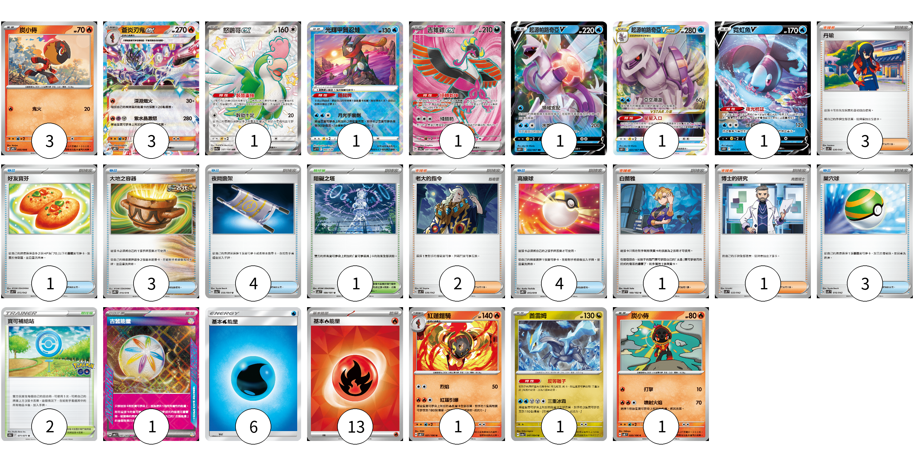 牌組構築方案 以此牌組為基礎新構築牌組 顯示卡面 顯示列表 寶可夢卡(15) 3 3 1 1 1 1 1 1 1 1 1 物品卡(15) 1 3 4 4 3 支援者卡(7) 3 2 1 1 競技場卡(3) 1 2 能量卡(20) 1 6 13 寶可夢卡(15) 卡牌名稱 張數 卡牌名稱 張數 炭小侍 SVPS 005/008 03 蒼炎刃鬼ex SVPS 006/008 03 怒鸚哥ex SV4a 337/190 01 光輝甲賀忍蛙 SVF 004/038 01 吉雉雞ex SV6a 081/064 01 起源帕路奇亞V S10P 022/067 01 起源帕路奇亞VSTAR S10P 023/067 01 霓虹魚V SVHK 004/022 01 紅蓮鎧騎 SV8 021/106 01 酋雷姆 SV6a 047/064 01 炭小侍 SV8 020/106 01 物品卡(15) 卡牌名稱 張數 卡牌名稱 張數 好友寶芬 SVK 015/042 01 大地之容器 SVTG 010/019 03 夜間擔架 SV6a 056/064 04 高級球 SVTG 013/019 04 巢穴球 SVK 016/042 03 支援者卡(7) 卡牌名稱 張數 卡牌名稱 張數 丹瑜 SVK 030/042 03 老大的指令 SVK 036/042 02 白蕾雅 SV7 100/102 01 博士的研究 SVK 033/042 01 競技場卡(3) 卡牌名稱 張數 卡牌名稱 張數 阻礙之塔 SV6 100/101 01 寶可補給站 S10b 071/071 02 能量卡(20) 卡牌名稱 張數 卡牌名稱 張數 古舊能量 SV6 101/101 01 基本水能量 AS6D WAT 06 基本【火】能量 SVK FIR 13 以此牌組為基礎新構築牌組 牌組編碼 eWzjaQ-qCNCga-DiXmIk copy 列印牌組單 牌組編碼已複製 分享至SNS