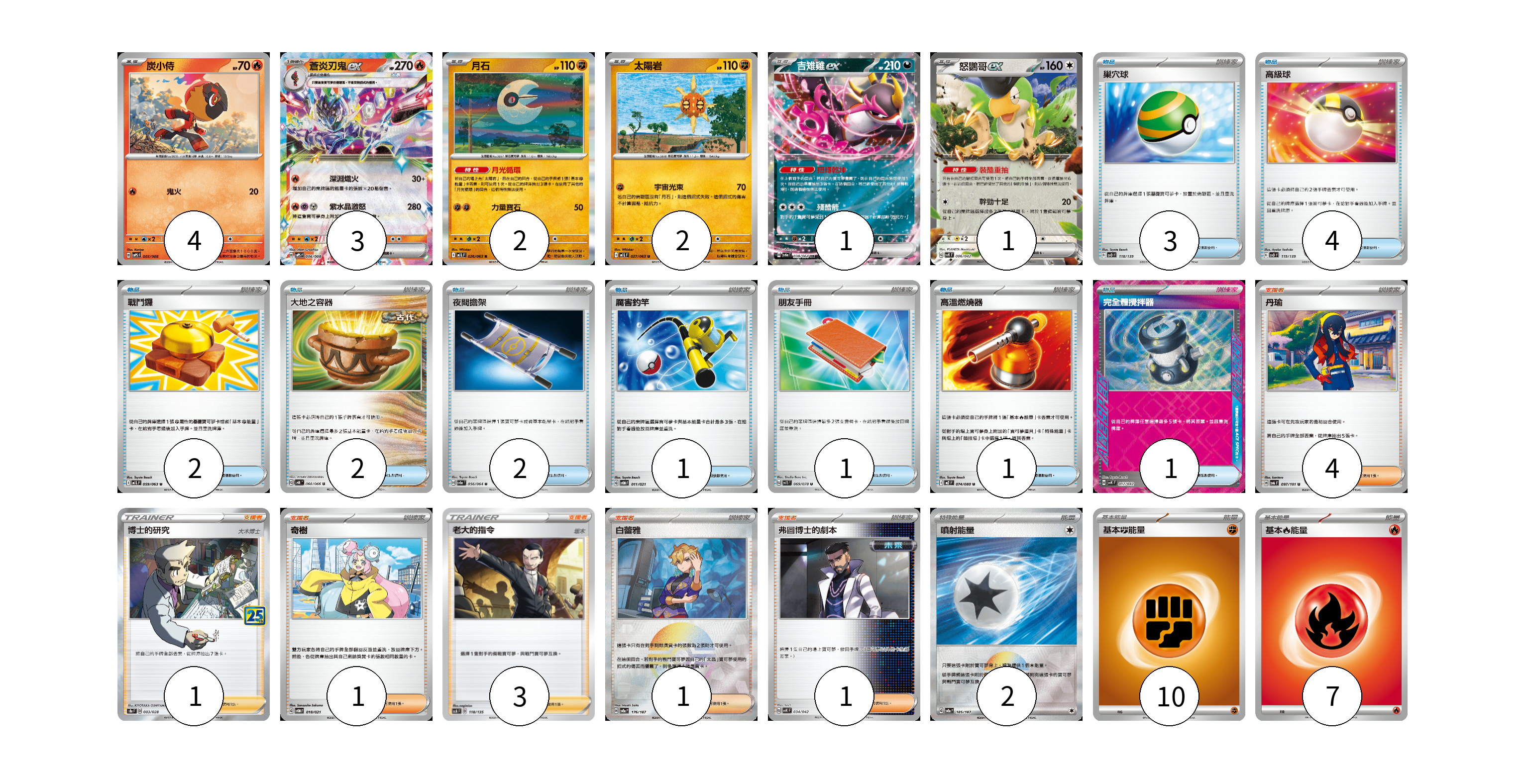 牌組構築方案 以此牌組為基礎新構築牌組 顯示卡面 顯示列表 寶可夢卡(13) 4 3 2 2 1 1 物品卡(17) 3 4 2 2 2 1 1 1 1 支援者卡(11) 4 1 1 3 1 1 能量卡(19) 2 10 7 寶可夢卡(13) 卡牌名稱 張數 卡牌名稱 張數 炭小侍 SVPS 005/008 04 蒼炎刃鬼ex SVPS 006/008 03 月石 M1L 026/063 02 太陽岩 M1L 027/063 02 吉雉雞ex SV6a 038/064 01 怒鸚哥ex SVK 006/042 01 物品卡(17) 卡牌名稱 張數 卡牌名稱 張數 巢穴球 SVD 118/139 03 高級球 SVD 119/139 04 戰鬥鑼 M1L 059/063 02 大地之容器 SV4K 060/066 02 夜間擔架 SV6a 056/064 02 厲害釣竿 SVOM 011/021 01 朋友手冊 SV1S 069/078 01 高溫燃燒器 M2 074/080 01 完全體攪拌器 SVK 017/042 01 支援者卡(11) 卡牌名稱 張數 卡牌名稱 張數 丹瑜 SV6 097/101 04 博士的研究(大木博士) S8a 003/028 01 奇樹 SVOM 018/021 01 老大的指令(坂木) SCA 118/135 03 白蕾雅 SV8a 176/187 01 弗圖博士的劇本 SVK 034/042 01 能量卡(19) 卡牌名稱 張數 卡牌名稱 張數 噴射能量 SV8a 185/187 02 基本【鬥】能量 SVAM FIG 10 基本火能量 sv-p FIR 07 以此牌組為基礎新構築牌組 牌組編碼 eYScnY-MiiNEE-HKtZkn copy 列印牌組單 牌組編碼已複製 分享至SNS