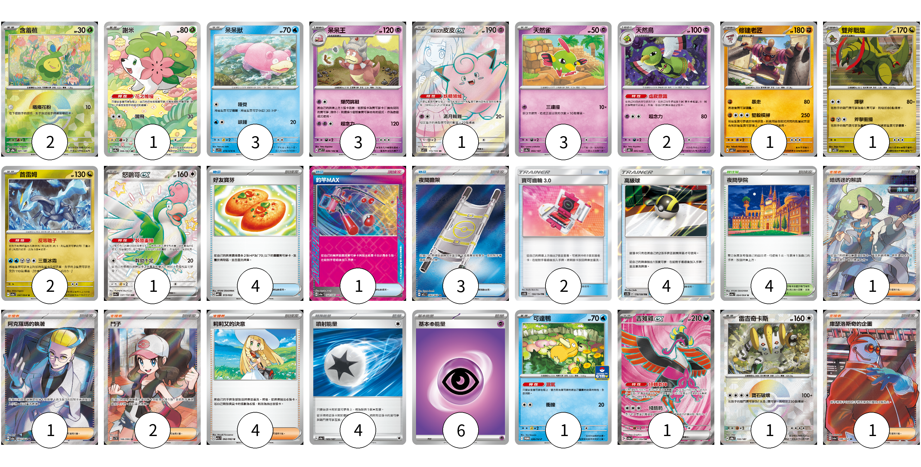 牌組構築方案 以此牌組為基礎新構築牌組 顯示卡面 顯示列表 寶可夢卡(23) 2 1 3 3 1 3 2 1 1 2 1 1 1 1 物品卡(14) 4 1 3 2 4 支援者卡(9) 1 1 2 4 1 競技場卡(4) 4 能量卡(10) 4 6 寶可夢卡(23) 卡牌名稱 張數 卡牌名稱 張數 含羞苞 SV8a 001/187 02 謝米 SV9a 066/063 01 呆呆獸 SV1V 019/078 03 呆呆王 SV7 039/102 03 莉莉艾的皮皮ex SV9 115/100 01 天然雀 SV8a 060/187 03 天然鳥 SVEM 005/020 02 修建老匠 SV6 061/101 01 雙斧戰龍 SV11B 072/086 01 酋雷姆 SV6a 047/064 02 怒鸚哥ex SV4a 337/190 01 可達鴨 SV-P 220/SV-P 01 吉雉雞ex SV6a 081/064 01 雷吉奇卡斯 SV8a 132/187 01 物品卡(14) 卡牌名稱 張數 卡牌名稱 張數 好友寶芬 MBD 013/022 04 釣竿MAX SV8a 142/187 01 夜間擔架 M1L 083/063 03 寶可齒輪3.0 AS6b 190/194 02 高級球 AS5b 178/186 04 支援者卡(9) 卡牌名稱 張數 卡牌名稱 張數 暗碼迷的解讀 SV5M 090/071 01 阿克羅瑪的執著 SV6a 083/064 01 鬥子 SV11W 166/086 02 莉莉艾的決意 M1L 062/063 04 庫瑟洛斯奇的企圖 SV6a 086/064 01 競技場卡(4) 卡牌名稱 張數 卡牌名稱 張數 夜間學院 SV6a 064/064 04 能量卡(10) 卡牌名稱 張數 卡牌名稱 張數 噴射能量 SV8a 185/187 04 基本超能量 sv-p PSY 06 以此牌組為基礎新構築牌組 牌組編碼 eYkUgb-PkskQB-cDAWLU copy 列印牌組單 牌組編碼已複製 分享至SNS