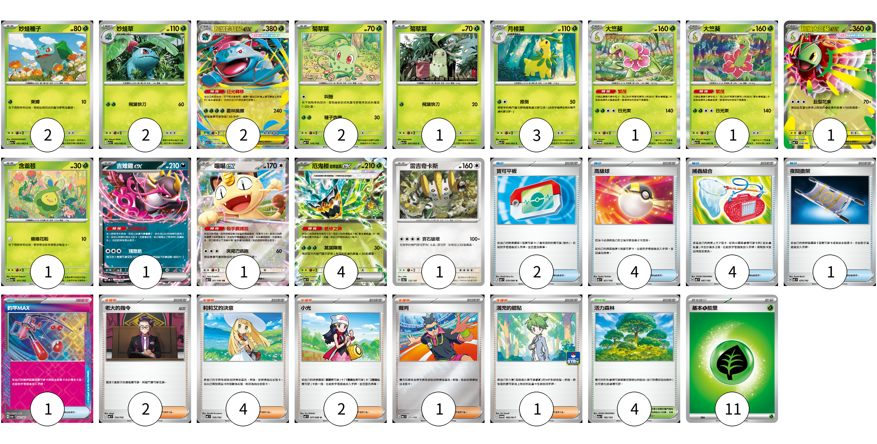 牌組構築方案 以此牌組為基礎新構築牌組 顯示卡面 顯示列表 寶可夢卡(23) 2 2 2 2 1 3 1 1 1 1 1 1 4 1 物品卡(12) 2 4 4 1 1 支援者卡(10) 2 4 2 1 1 競技場卡(4) 4 能量卡(11) 11 寶可夢卡(23) 卡牌名稱 張數 卡牌名稱 張數 妙蛙種子 M1L 001/063 02 妙蛙草 M1L 002/063 02 超級妙蛙花ex M1L 003/063 02 菊草葉 MC 016/742 02 菊草葉 M1S 003/063 01 月桂葉 M1S 004/063 03 大竺葵 M-P 055/M-P 01 大竺葵 M1S 005/063 01 超級大竺葵ex MC 018/742 01 含羞苞 M2a 011/193 01 吉雉雞ex MC 489/742 01 喵喵ex M3 061/080 01 厄鬼椪 碧草面具ex MC 082/742 04 雷吉奇卡斯 SV8a 132/187 01 物品卡(12) 卡牌名稱 張數 卡牌名稱 張數 寶可平板 M3 070/080 02 高級球 MC 651/742 04 捕蟲組合 MC 667/742 04 夜間擔架 MC 670/742 01 釣竿MAX SV8a 142/187 01 支援者卡(10) 卡牌名稱 張數 卡牌名稱 張數 老大的指令 MC 724/742 02 莉莉艾的決意 MC 729/742 04 小光 M2 077/080 02 裁判 MC 711/742 01 滿充的體貼 M-P 082/M-P 01 競技場卡(4) 卡牌名稱 張數 卡牌名稱 張數 活力森林 M2a 182/193 04 能量卡(11) 卡牌名稱 張數 卡牌名稱 張數 基本【草】能量 M-P GRA 11 以此牌組為基礎新構築牌組 牌組編碼 eZfAsx-eNgDwE-FcNijz copy 列印牌組單 牌組編碼已複製 分享至SNS