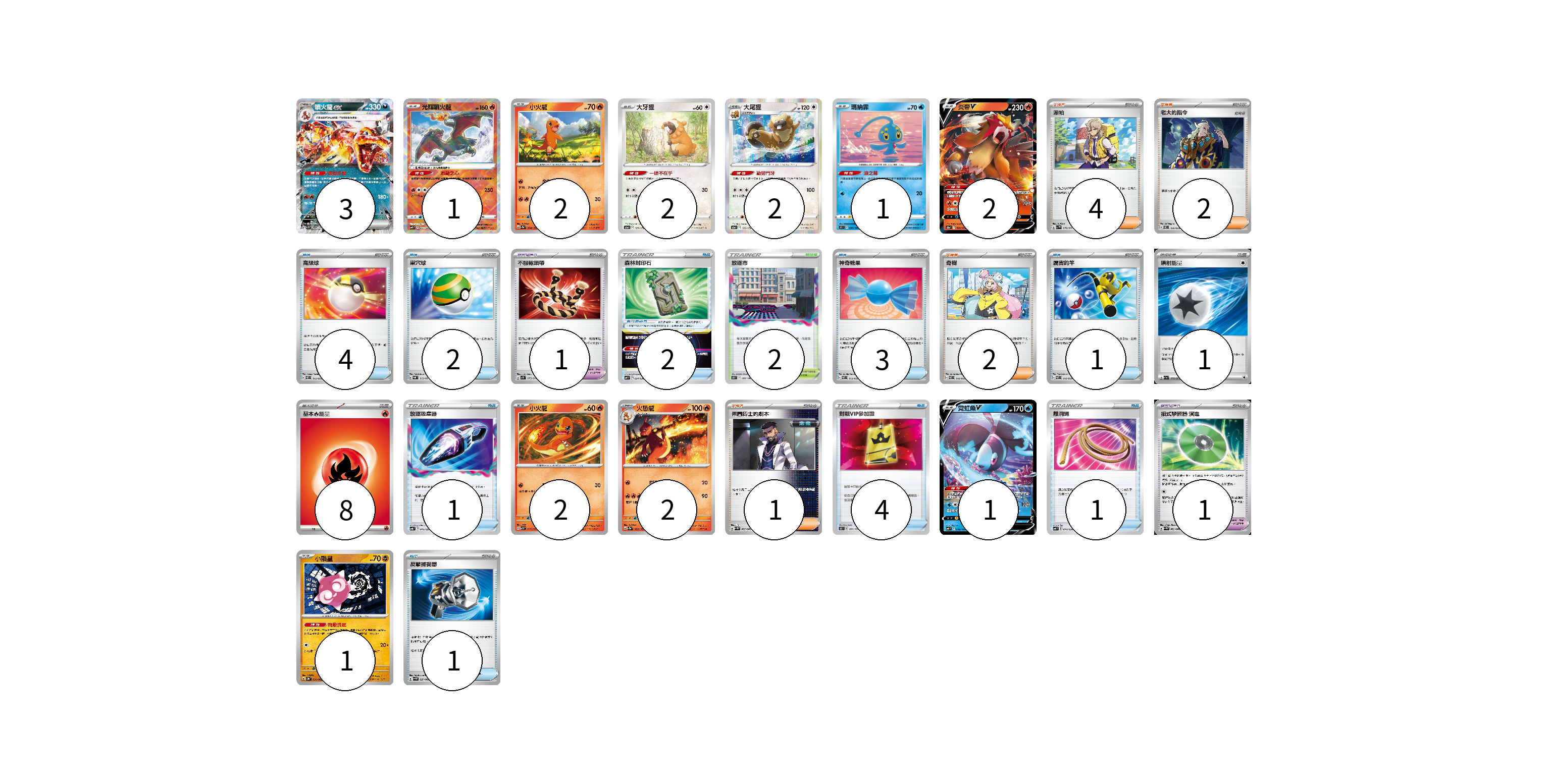 牌組構築方案 以此牌組為基礎新構築牌組 顯示卡面 顯示列表 寶可夢卡(20) 3 1 2 2 2 1 2 1 2 2 1 1 寶可夢道具(2) 1 1 物品卡(18) 4 2 2 3 1 4 1 1 支援者卡(9) 4 2 2 1 競技場卡(2) 2 能量卡(9) 1 8 寶可夢卡(20) 卡牌名稱 張數 卡牌名稱 張數 噴火龍ex SV3 066/108 03 光輝噴火龍 SVF 001/038 01 小火龍 SV2a 004/165 02 大牙狸 S12a 121/172 02 大尾狸 S12a 122/172 02 瑪納霏 S9 031/100 01 炎帝V S12a 019/172 02 厲害釣竿 SVEL 010/020 01 小火龍 SV3 012/108 02 火恐龍 SV2a 005/165 02 霓虹魚V SVF 002/038 01 小隕星 SV3a 030/062 01 寶可夢道具(2) 卡牌名稱 張數 卡牌名稱 張數 不服輸頭帶 SV1S 073/078 01 招式學習器 演進 SV4M 063/066 01 物品卡(18) 卡牌名稱 張數 卡牌名稱 張數 高級球 SVEL 012/020 04 巢穴球 SVAL 012/021 02 森林封印石 SVF 024/038 02 神奇糖果 SVEL 013/020 03 放逐吸塵器 SVB 016/028 01 對戰VIP參加證 S8 091/100 04 離洞繩 SVF 010/038 01 反擊捕捉器 SV4M 059/066 01 支援者卡(9) 卡牌名稱 張數 卡牌名稱 張數 派帕 SV1V 076/078 04 老大的指令 SVEL 019/020 02 奇樹 SVEL 016/020 02 弗圖博士的劇本 SV4M 065/066 01 競技場卡(2) 卡牌名稱 張數 卡牌名稱 張數 放逐市 S11 099/100 02 能量卡(9) 卡牌名稱 張數 卡牌名稱 張數 噴射能量 SV1a 072/073 01 基本火能量 sv-p FIR 08 以此牌組為基礎新構築牌組 牌組編碼 eZtIXX-XIBXEa-qmEXzi copy 列印牌組單 牌組編碼已複製 分享至SNS