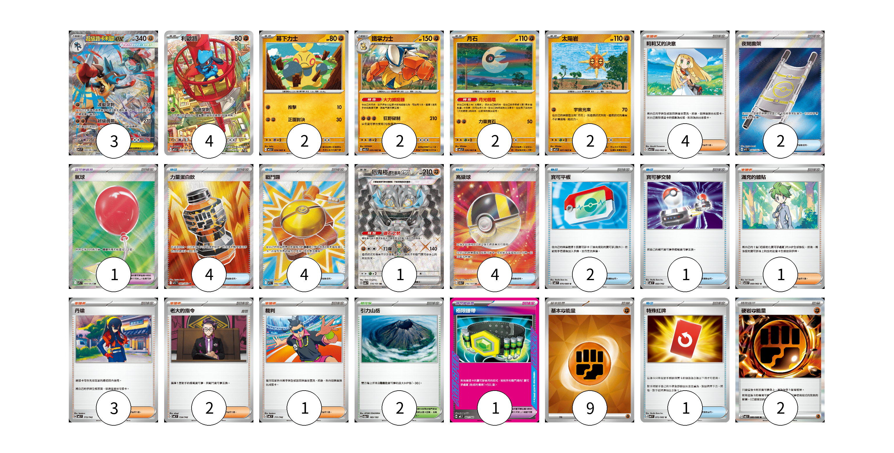 牌組構築方案 以此牌組為基礎新構築牌組 顯示卡面 顯示列表 寶可夢卡(16) 3 4 2 2 2 2 1 寶可夢道具(2) 1 1 物品卡(18) 2 4 4 4 2 1 1 支援者卡(11) 4 1 3 2 1 競技場卡(2) 2 能量卡(11) 9 2 寶可夢卡(16) 卡牌名稱 張數 卡牌名稱 張數 超級路卡利歐ex M1L 088/063 03 利歐路 M1L 068/063 04 幕下力士 M1L 024/063 02 鐵掌力士 M1L 025/063 02 月石 M1L 026/063 02 太陽岩 M1L 027/063 02 厄鬼椪 礎石面具ex SV6 119/101 01 寶可夢道具(2) 卡牌名稱 張數 卡牌名稱 張數 氣球 M1L 084/063 01 極限腰帶 MC 691/742 01 物品卡(18) 卡牌名稱 張數 卡牌名稱 張數 夜間擔架 M1L 083/063 02 力量蛋白飲 M1L 081/063 04 戰鬥鑼 M1L 082/063 04 高級球 M2a 216/193 04 寶可平板 M3 070/080 02 寶可夢交替 MC 663/742 01 特殊紅牌 M4 072/083 01 支援者卡(11) 卡牌名稱 張數 卡牌名稱 張數 莉莉艾的決意 M1L 062/063 04 滿充的體貼 M1S 060/063 01 丹瑜 MC 715/742 03 老大的指令 MC 724/742 02 裁判 MC 711/742 01 競技場卡(2) 卡牌名稱 張數 卡牌名稱 張數 引力山岳 M2a 183/193 02 能量卡(11) 卡牌名稱 張數 卡牌名稱 張數 基本【鬥】能量 SVM FIG 09 硬岩【鬥】能量 M3 080/080 02 以此牌組為基礎新構築牌組 牌組編碼 eaNEGJ-thFUNw-OcFqku copy 列印牌組單 牌組編碼已複製 分享至SNS
