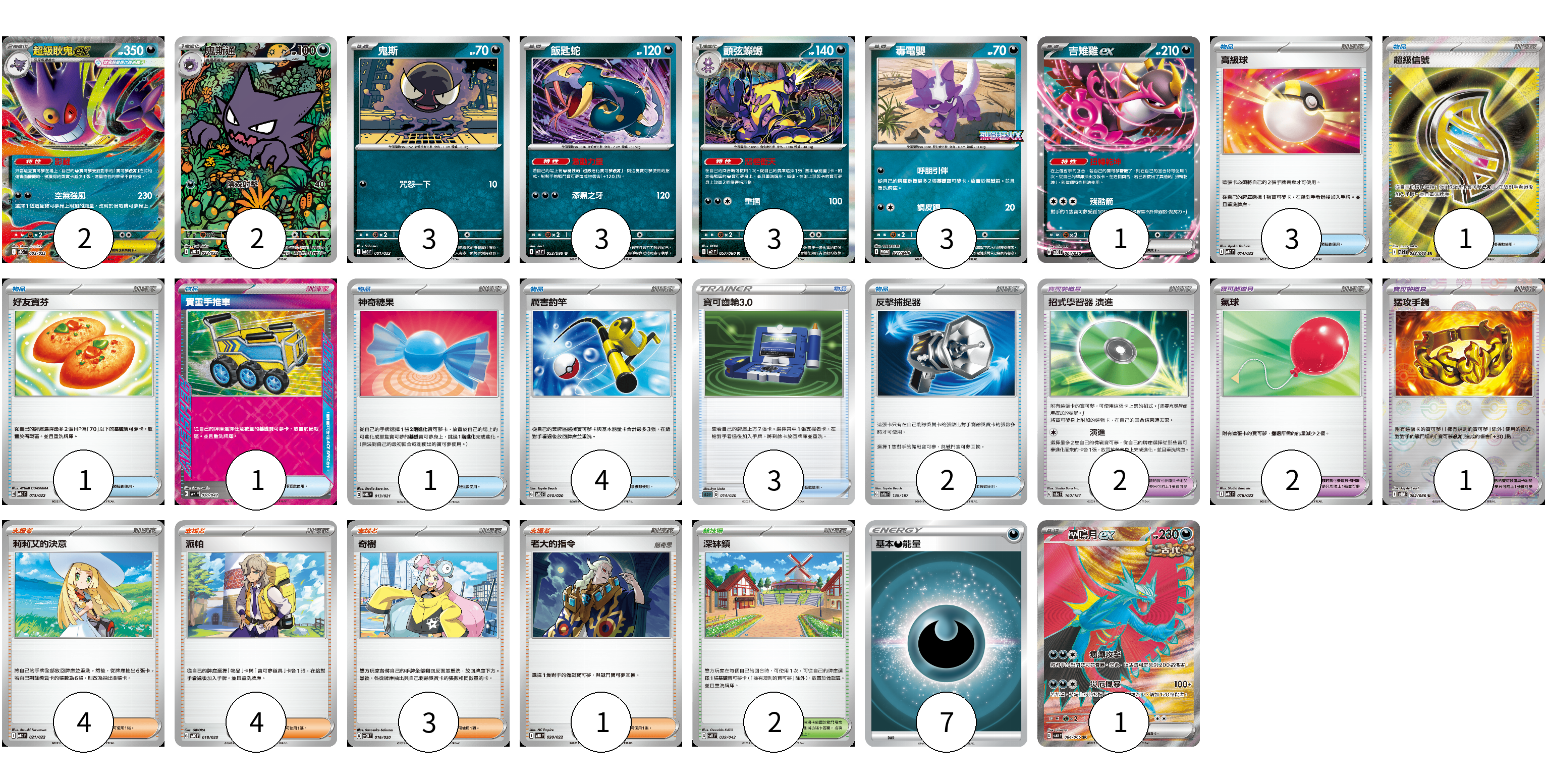 牌組構築方案 以此牌組為基礎新構築牌組 顯示卡面 顯示列表 寶可夢卡(18) 2 2 3 3 3 3 1 1 寶可夢道具(5) 2 2 1 物品卡(16) 3 1 1 1 1 4 3 2 支援者卡(12) 4 4 3 1 競技場卡(2) 2 能量卡(7) 7 寶可夢卡(18) 卡牌名稱 張數 卡牌名稱 張數 超級耿鬼ex MBG 003/022 02 鬼斯通 MBG 023/022 02 鬼斯 MBG 001/022 03 飯匙蛇 M2 052/080 03 顫弦蠑螈 M2 057/080 03 毒電嬰 M-P 027/M-P 03 吉雉雞ex SVOD 004/020 01 轟鳴月ex SV4K 084/066 01 寶可夢道具(5) 卡牌名稱 張數 卡牌名稱 張數 招式學習器 演進 SV8a 160/187 02 氣球 MBD 018/022 02 猛攻手鐲 SV11W 082/086 01 物品卡(16) 卡牌名稱 張數 卡牌名稱 張數 高級球 MBD 014/022 03 超級信號 M1S 083/063 01 好友寶芬 MBD 013/022 01 貴重手推車 SVK 020/042 01 神奇糖果 SVTL 013/021 01 厲害釣竿 SVOD 010/020 04 寶可齒輪3.0 SLD 014/020 03 反擊捕捉器 SV8a 139/187 02 支援者卡(12) 卡牌名稱 張數 卡牌名稱 張數 莉莉艾的決意 MBD 021/022 04 派帕 SVOD 018/020 04 奇樹 SVOD 016/020 03 老大的指令 MBD 020/022 01 競技場卡(2) 卡牌名稱 張數 卡牌名稱 張數 深缽鎮 SVK 039/042 02 能量卡(7) 卡牌名稱 張數 卡牌名稱 張數 基本惡能量 SLD DAR 07 以此牌組為基礎新構築牌組 牌組編碼 eaTcmU-MICvoL-APnQdX copy 列印牌組單 牌組編碼已複製 分享至SNS