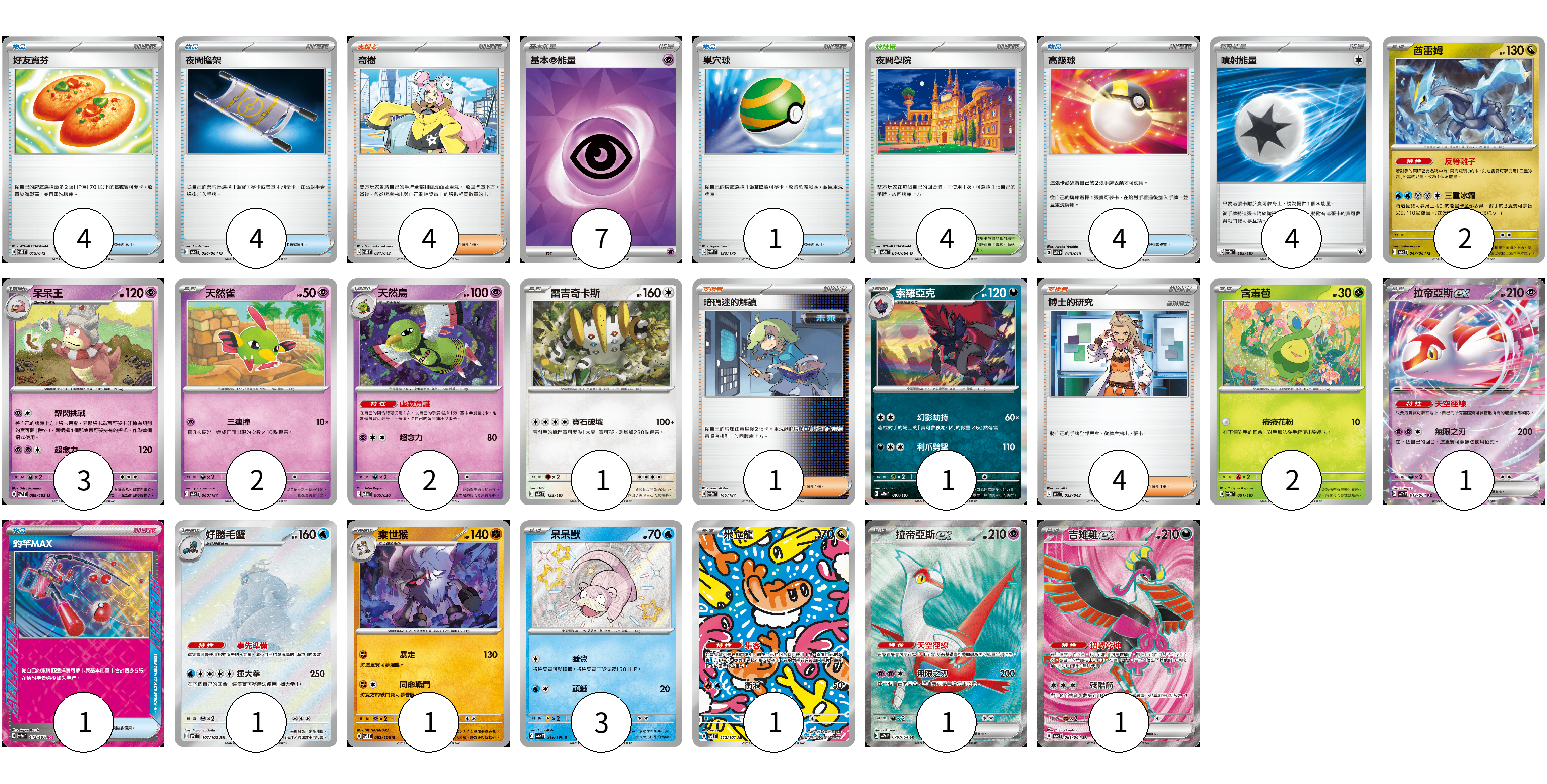 牌組構築方案 以此牌組為基礎新構築牌組 顯示卡面 顯示列表 寶可夢卡(22) 2 3 2 2 1 1 2 1 1 1 3 1 1 1 物品卡(14) 4 4 1 4 1 支援者卡(9) 4 1 4 競技場卡(4) 4 能量卡(11) 7 4 寶可夢卡(22) 卡牌名稱 張數 卡牌名稱 張數 酋雷姆 SV6a 047/064 02 呆呆王 SV7 039/102 03 天然雀 SV8a 060/187 02 天然鳥 SVEM 005/020 02 雷吉奇卡斯 SV8a 132/187 01 索羅亞克 SV8a 097/187 01 含羞苞 SV8a 001/187 02 拉帝亞斯ex SV7a 019/064 01 好勝毛蟹 SV7 107/102 01 棄世猴 SV8 062/106 01 呆呆獸 SV4a 219/190 03 米立龍 SV6 112/101 01 拉帝亞斯ex SV7a 078/064 01 吉雉雞ex SV6a 081/064 01 物品卡(14) 卡牌名稱 張數 卡牌名稱 張數 好友寶芬 SVK 015/042 04 夜間擔架 SV6a 056/064 04 巢穴球 SVM 133/175 01 高級球 SVTG 013/019 04 釣竿MAX SV8a 142/187 01 支援者卡(9) 卡牌名稱 張數 卡牌名稱 張數 奇樹 SVK 031/042 04 暗碼迷的解讀 SV8a 165/187 01 博士的研究 SVK 032/042 04 競技場卡(4) 卡牌名稱 張數 卡牌名稱 張數 夜間學院 SV6a 064/064 04 能量卡(11) 卡牌名稱 張數 卡牌名稱 張數 基本【超】能量 SVK PSY 07 噴射能量 SV8a 185/187 04 以此牌組為基礎新構築牌組 牌組編碼 eccxke-DBEyqv-ZhrLoT copy 列印牌組單 牌組編碼已複製 分享至SNS