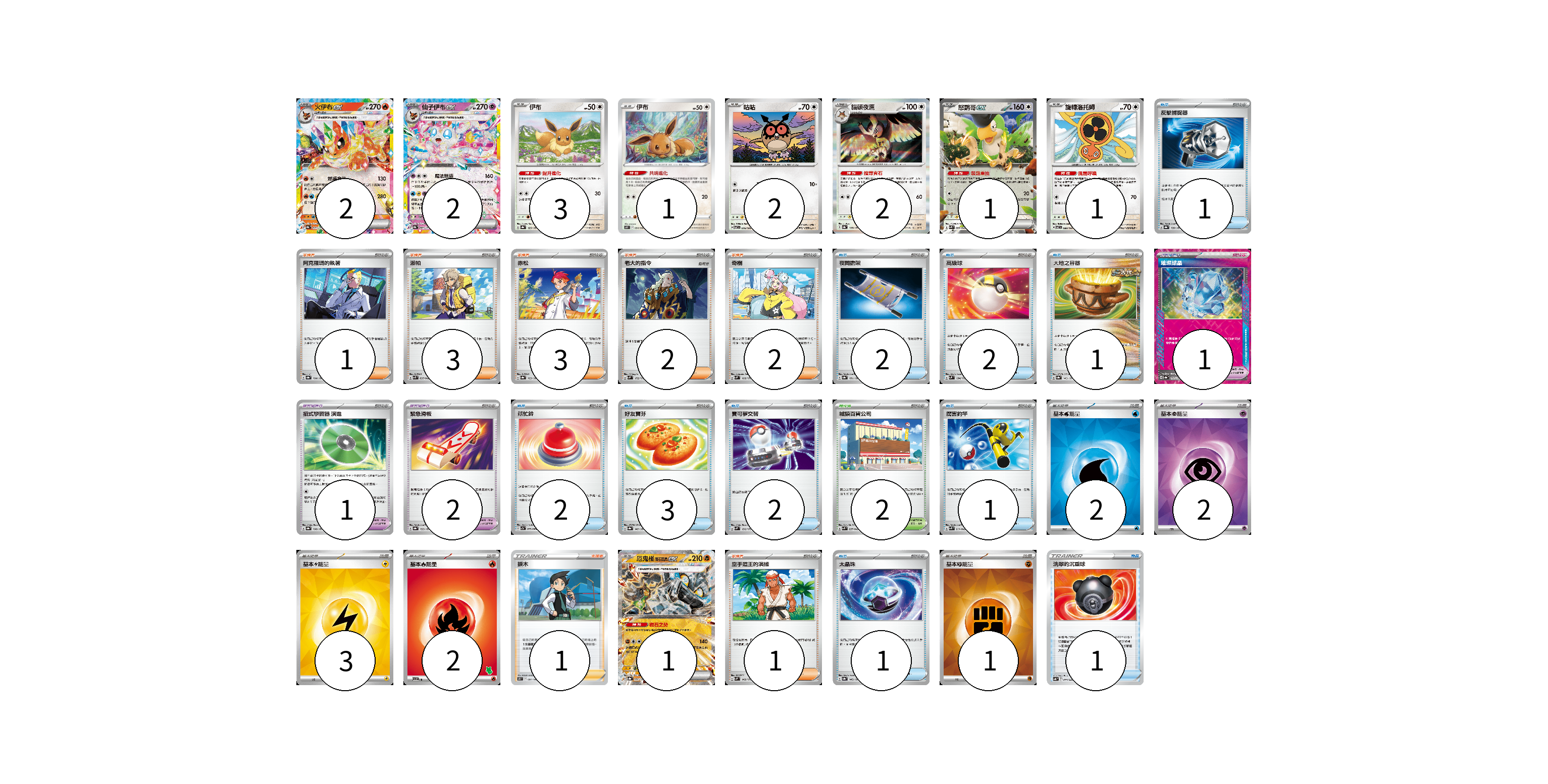 牌組構築方案 以此牌組為基礎新構築牌組 顯示卡面 顯示列表 寶可夢卡(15) 2 2 3 1 2 2 1 1 1 寶可夢道具(4) 1 1 2 物品卡(16) 1 2 2 1 2 3 2 1 1 1 支援者卡(13) 1 3 3 2 2 1 1 競技場卡(2) 2 能量卡(10) 2 2 3 2 1 寶可夢卡(15) 卡牌名稱 張數 卡牌名稱 張數 火伊布ex SV8a 022/187 02 仙子伊布ex SV8a 069/187 02 伊布 SV8a 125/187 03 伊布 S10P 054/067 01 咕咕 SV7 076/102 02 貓頭夜鷹 SV8a 128/187 02 怒鸚哥ex SVK 006/042 01 旋轉洛托姆 SV7 080/102 01 厄鬼椪 礎石面具ex SV8a 091/187 01 寶可夢道具(4) 卡牌名稱 張數 卡牌名稱 張數 璀璨結晶 SV8a 152/187 01 招式學習器 演進 SV8a 160/187 01 緊急滑板 SV8a 153/187 02 物品卡(16) 卡牌名稱 張數 卡牌名稱 張數 反擊捕捉器 SV8a 139/187 01 夜間擔架 SV8a 151/187 02 高級球 SVM 134/175 02 大地之容器 SV8a 143/187 01 幫忙鈴 SV7a 053/064 02 好友寶芬 SV8a 147/187 03 寶可夢交替 SVM 136/175 02 厲害釣竿 SVK 011/042 01 太晶珠 SV8a 145/187 01 洗翠的沉重球 SVB 014/028 01 支援者卡(13) 卡牌名稱 張數 卡牌名稱 張數 阿克羅瑪的執著 SV8a 164/187 01 派帕 SVK 035/042 03 赤松 SV8a 163/187 03 老大的指令 SVM 172/175 02 奇樹 SVM 160/175 02 捩木 S11 097/100 01 空手道王的演練 SVM 149/175 01 競技場卡(2) 卡牌名稱 張數 卡牌名稱 張數 城鎮百貨公司 SVK 037/042 02 能量卡(10) 卡牌名稱 張數 卡牌名稱 張數 基本【水】能量 SVK WAT 02 基本【超】能量 SVK PSY 02 基本【雷】能量 SVK LIG 03 基本【火】能量 SVI FIR 02 基本【鬥】能量 SVK FIG 01 以此牌組為基礎新構築牌組 牌組編碼 edwyig-YBURue-woyixg copy 列印牌組單 牌組編碼已複製 分享至SNS