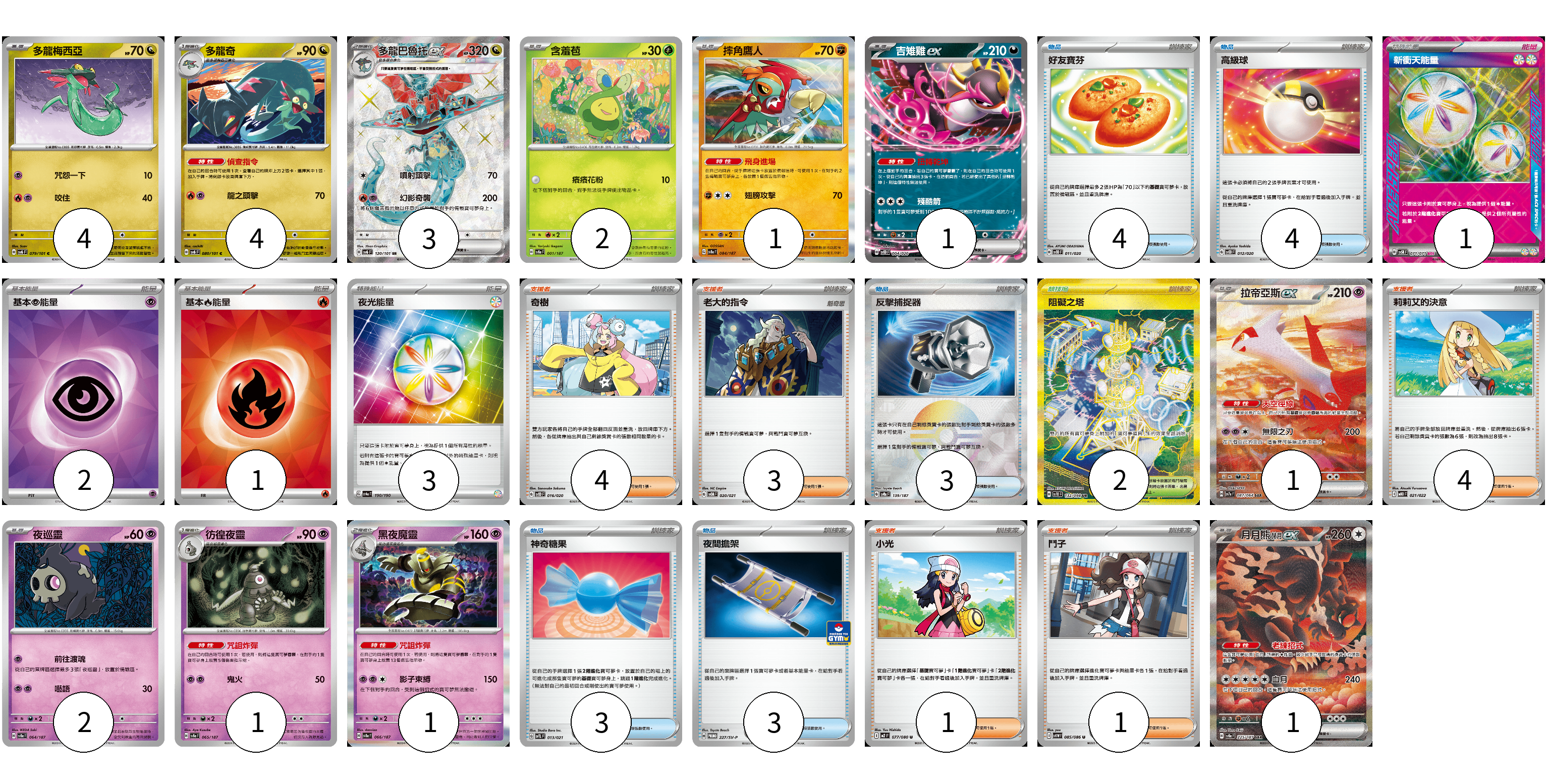 牌組構築方案 以此牌組為基礎新構築牌組 顯示卡面 顯示列表 寶可夢卡(21) 4 4 3 2 1 1 1 2 1 1 1 物品卡(17) 4 4 3 3 3 支援者卡(13) 4 3 4 1 1 競技場卡(2) 2 能量卡(7) 1 2 1 3 寶可夢卡(21) 卡牌名稱 張數 卡牌名稱 張數 多龍梅西亞 SV6 079/101 04 多龍奇 SV6 080/101 04 多龍巴魯托ex SV6 120/101 03 含羞苞 SV8a 001/187 02 摔角鷹人 SV8a 084/187 01 吉雉雞ex SVOD 004/020 01 拉帝亞斯ex SV7a 087/064 01 夜巡靈 SV8a 064/187 02 彷徨夜靈 SV8a 065/187 01 黑夜魔靈 SV8a 066/187 01 月月熊 赫月ex SV8a 225/187 01 物品卡(17) 卡牌名稱 張數 卡牌名稱 張數 好友寶芬 SVOD 011/020 04 高級球 SVOD 012/020 04 反擊捕捉器 SV8a 139/187 03 神奇糖果 SVTL 013/021 03 夜間擔架 SV-P 227/SV-P 03 支援者卡(13) 卡牌名稱 張數 卡牌名稱 張數 奇樹 SVOD 016/020 04 老大的指令 SVOM 020/021 03 莉莉艾的決意 MBD 021/022 04 小光 M2 077/080 01 鬥子 SV11W 085/086 01 競技場卡(2) 卡牌名稱 張數 卡牌名稱 張數 阻礙之塔 SV10 132/098 02 能量卡(7) 卡牌名稱 張數 卡牌名稱 張數 新衝天能量 SV5K 071/071 01 基本【超】能量 SVOD PSY 02 基本【火】能量 SVM FIR 01 夜光能量 SV4a 190/190 03 以此牌組為基礎新構築牌組 牌組編碼 eirWfH-dpAKQI-AqbBBK copy 列印牌組單 牌組編碼已複製 分享至SNS