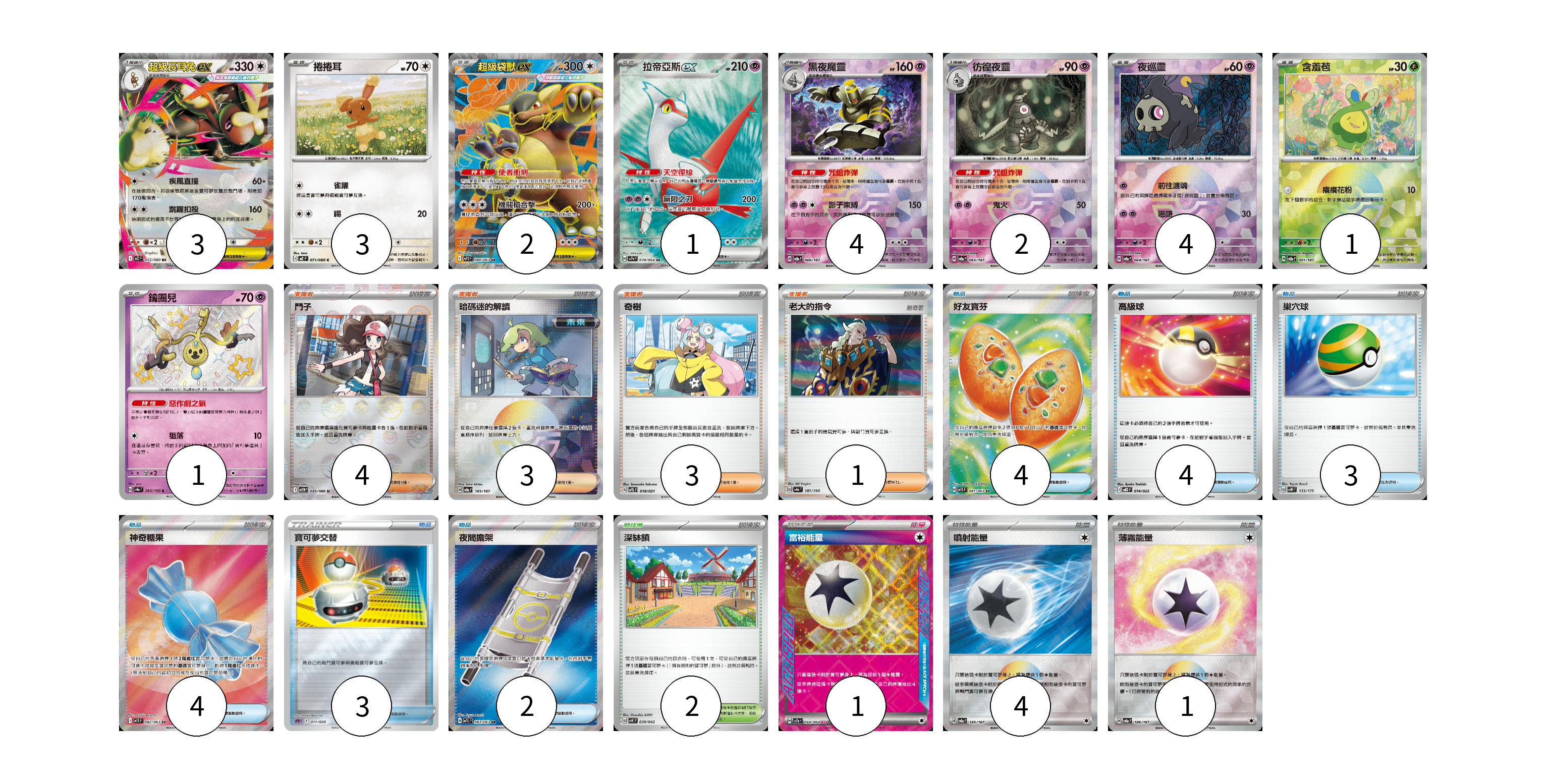 牌組構築方案 以此牌組為基礎新構築牌組 顯示卡面 顯示列表 寶可夢卡(21) 3 3 2 1 4 2 4 1 1 寶可夢道具(3) 3 物品卡(20) 4 4 3 4 3 2 支援者卡(8) 4 3 1 競技場卡(2) 2 能量卡(6) 1 4 1 寶可夢卡(21) 卡牌名稱 張數 卡牌名稱 張數 超級長耳兔ex M2 072/080 03 捲捲耳 M2 071/080 03 超級袋獸ex M1S 080/063 02 拉帝亞斯ex SV7a 078/064 01 黑夜魔靈 SV8a 066/187 04 彷徨夜靈 SV8a 065/187 02 夜巡靈 SV8a 064/187 04 含羞苞 SV8a 001/187 01 鑰圈兒 SV4a 264/190 01 寶可夢道具(3) 卡牌名稱 張數 卡牌名稱 張數 奇樹 SVTL 018/021 03 物品卡(20) 卡牌名稱 張數 卡牌名稱 張數 好友寶芬 M1S 081/063 04 高級球 MBD 014/022 04 巢穴球 SVM 133/175 03 神奇糖果 M1S 082/063 04 寶可夢交替 SPD 011/020 03 夜間擔架 M1L 083/063 02 支援者卡(8) 卡牌名稱 張數 卡牌名稱 張數 鬥子 SV11W 085/086 04 暗碼迷的解讀 SV8a 165/187 03 老大的指令 SV4a 181/190 01 競技場卡(2) 卡牌名稱 張數 卡牌名稱 張數 深缽鎮 SVK 039/042 02 能量卡(6) 卡牌名稱 張數 卡牌名稱 張數 富裕能量 SV7a 064/064 01 噴射能量 SV8a 185/187 04 薄霧能量 SV8a 186/187 01 以此牌組為基礎新構築牌組 牌組編碼 eitqsf-ZXZIBx-LPoMcQ copy 列印牌組單 牌組編碼已複製 分享至SNS