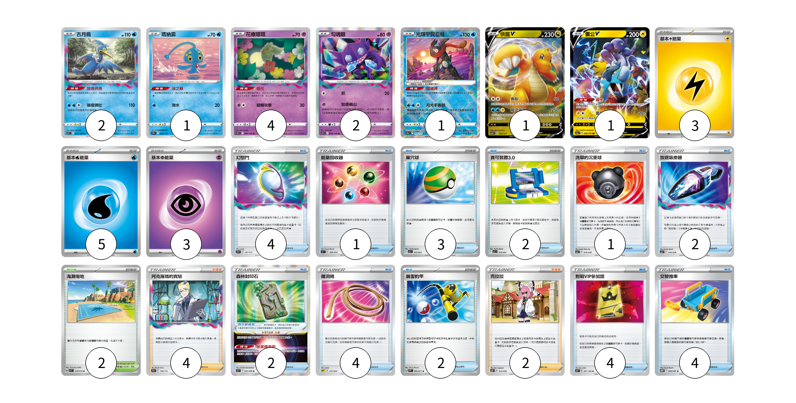 牌組構築方案 以此牌組為基礎新構築牌組 顯示卡面 顯示列表 寶可夢卡(12) 2 1 4 2 1 1 1 寶可夢道具(2) 2 物品卡(27) 4 1 3 2 1 2 4 2 4 4 支援者卡(6) 4 2 競技場卡(2) 2 能量卡(11) 3 5 3 寶可夢卡(12) 卡牌名稱 張數 卡牌名稱 張數 古月鳥 S11 033/100 02 瑪納霏 S12a 029/172 01 花療環環 S11 049/100 04 勾魂眼 S11 044/100 02 光輝甲賀忍蛙 S12a 033/172 01 快龍V SCD 108/159 01 雷公V S12a 038/172 01 寶可夢道具(2) 卡牌名稱 張數 卡牌名稱 張數 森林封印石 S12 092/098 02 物品卡(27) 卡牌名稱 張數 卡牌名稱 張數 幻想門 S12a 141/172 04 能量回收器 SI 368/414 01 巢穴球 SVC 013/021 03 寶可裝置3.0 SVC 015/021 02 洗翠的沉重球 SVB 014/028 01 放逐吸塵器 SVB 016/028 02 離洞繩 SDP 012/022 04 厲害釣竿 SV2P 066/071 02 對戰VIP參加證 S8 091/100 04 交替推車 S10D 060/067 04 支援者卡(6) 卡牌名稱 張數 卡牌名稱 張數 阿克羅瑪的實驗 S12a 148/172 04 克拉拉 SVB 019/028 02 競技場卡(2) 卡牌名稱 張數 卡牌名稱 張數 海灘場地 SV1S 078/078 02 能量卡(11) 卡牌名稱 張數 卡牌名稱 張數 基本【雷】能量 SVC LIG 03 基本【水】能量 SVB WAT 05 基本【超】能量 SVB PSY 03 以此牌組為基礎新構築牌組 牌組編碼 ejnYBV-GKQwmB-XlpNpg copy 列印牌組單 牌組編碼已複製 分享至SNS