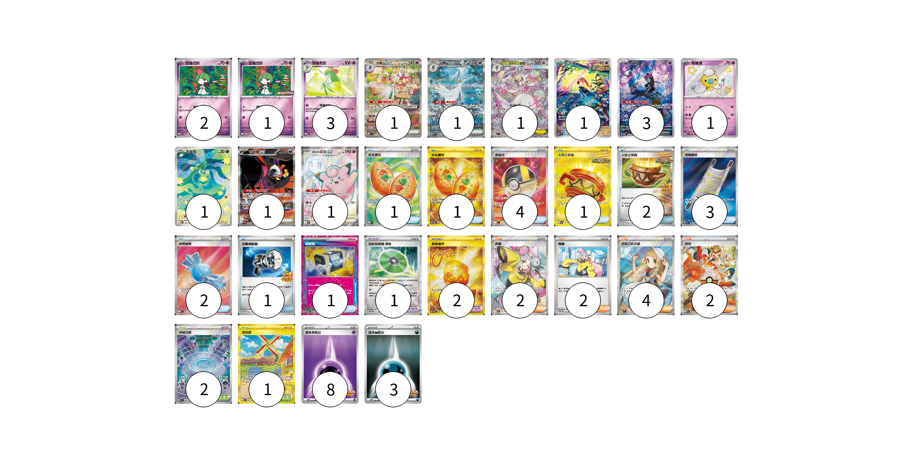 牌組構築方案 以此牌組為基礎新構築牌組 顯示卡面 顯示列表 寶可夢卡(17) 2 1 3 1 1 1 1 3 1 1 1 1 寶可夢道具(3) 1 2 物品卡(16) 1 1 4 1 2 3 2 1 1 支援者卡(10) 2 2 4 2 競技場卡(3) 2 1 能量卡(11) 8 3 寶可夢卡(17) 卡牌名稱 張數 卡牌名稱 張數 拉魯拉絲 M2a 069/193 02 拉魯拉絲 M-P 005/M-P 01 奇魯莉安 M2a 070/193 03 沙奈朵ex SV1S 101/078 01 沙奈朵ex SV4a 348/190 01 超級沙奈朵ex M1S 087/063 01 吼叫尾 SV4K 071/066 01 願增猿 SV6 107/101 03 飄飄球 SV4a 260/190 01 含羞苞 M2a 196/193 01 吉雉雞ex SV6a 089/064 01 莉莉艾的皮皮ex SV9 115/100 01 寶可夢道具(3) 卡牌名稱 張數 卡牌名稱 張數 招式學習器 演進 SV8a 160/187 01 勇氣護符 SV7 134/102 02 物品卡(16) 卡牌名稱 張數 卡牌名稱 張數 好友寶芬 M1S 081/063 01 好友寶芬 SV6 133/101 01 高級球 M2a 216/193 04 大地之容器 SV6a 093/064 01 大地之容器 SV-P 084/SV-P 02 夜間擔架 M1L 083/063 03 神奇糖果 M1S 082/063 02 反擊捕捉器 SV-P 083/SV-P 01 秘密箱 SV6 092/101 01 支援者卡(10) 卡牌名稱 張數 卡牌名稱 張數 奇樹 SV2D 091/071 02 奇樹 SVOD 016/020 02 莉莉艾的決意 M1L 086/063 04 派帕 SV4a 353/190 02 競技場卡(3) 卡牌名稱 張數 卡牌名稱 張數 神秘花園 M1S 086/063 02 深缽鎮 SV3 140/108 01 能量卡(11) 卡牌名稱 張數 卡牌名稱 張數 基本【超】能量 SV-P 261/SV-P 08 基本【惡】能量 SV-P 263/SV-P 03 以此牌組為基礎新構築牌組 牌組編碼 ekmLxG-spAaDK-GAWSLt copy 列印牌組單 牌組編碼已複製 分享至SNS