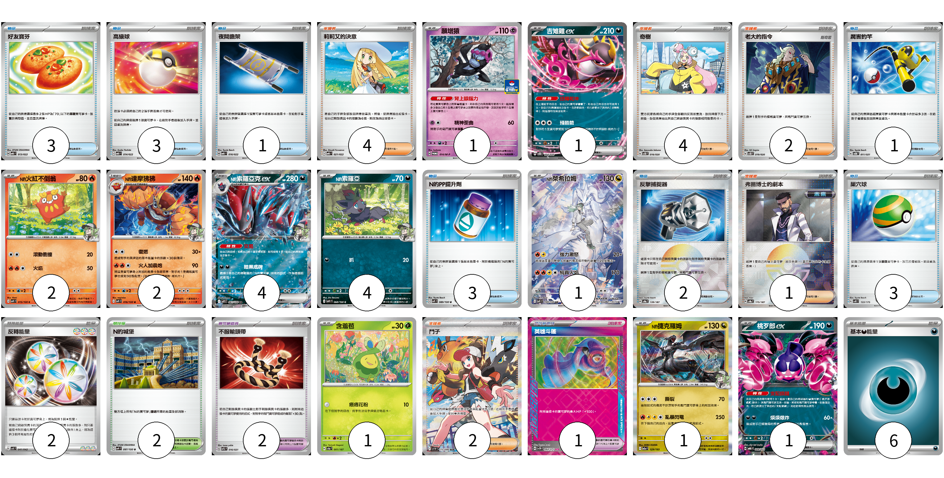牌組構築方案 以此牌組為基礎新構築牌組 顯示卡面 顯示列表 寶可夢卡(18) 1 1 2 2 4 4 1 1 1 1 寶可夢道具(3) 2 1 物品卡(16) 3 3 1 1 3 2 3 支援者卡(13) 4 4 2 1 2 競技場卡(2) 2 能量卡(8) 2 6 寶可夢卡(18) 卡牌名稱 張數 卡牌名稱 張數 願增猿 M-P 014/M-P 01 吉雉雞ex SVOD 004/020 01 N的火紅不倒翁 SV9 015/100 02 N的達摩狒狒 SV9 016/100 02 N的索羅亞克ex SV9 061/100 04 N的索羅亞 SV9 060/100 04 N的萊希拉姆 SV9 109/100 01 含羞苞 SV8a 001/187 01 N的捷克羅姆 M2a 129/193 01 桃歹郎ex MBG 009/022 01 寶可夢道具(3) 卡牌名稱 張數 卡牌名稱 張數 不服輸頭帶 SVTL 016/021 02 英雄斗篷 SV5M 064/071 01 物品卡(16) 卡牌名稱 張數 卡牌名稱 張數 好友寶芬 MBD 013/022 03 高級球 MBD 014/022 03 夜間擔架 MBD 016/022 01 厲害釣竿 SVOM 011/021 01 N的PP提升劑 SV9 089/100 03 反擊捕捉器 SV8a 139/187 02 巢穴球 SVM 133/175 03 支援者卡(13) 卡牌名稱 張數 卡牌名稱 張數 莉莉艾的決意 MBD 021/022 04 奇樹 SVOD 016/020 04 老大的指令 SVOD 019/020 02 弗圖博士的劇本 SV8a 175/187 01 鬥子 SV11W 173/086 02 競技場卡(2) 卡牌名稱 張數 卡牌名稱 張數 N的城堡 SV9 097/100 02 能量卡(8) 卡牌名稱 張數 卡牌名稱 張數 反轉能量 SVK 041/042 02 基本惡能量 sv-p DAR 06 以此牌組為基礎新構築牌組 牌組編碼 emMAFa-fnXSsX-DdYudw copy 列印牌組單 牌組編碼已複製 分享至SNS