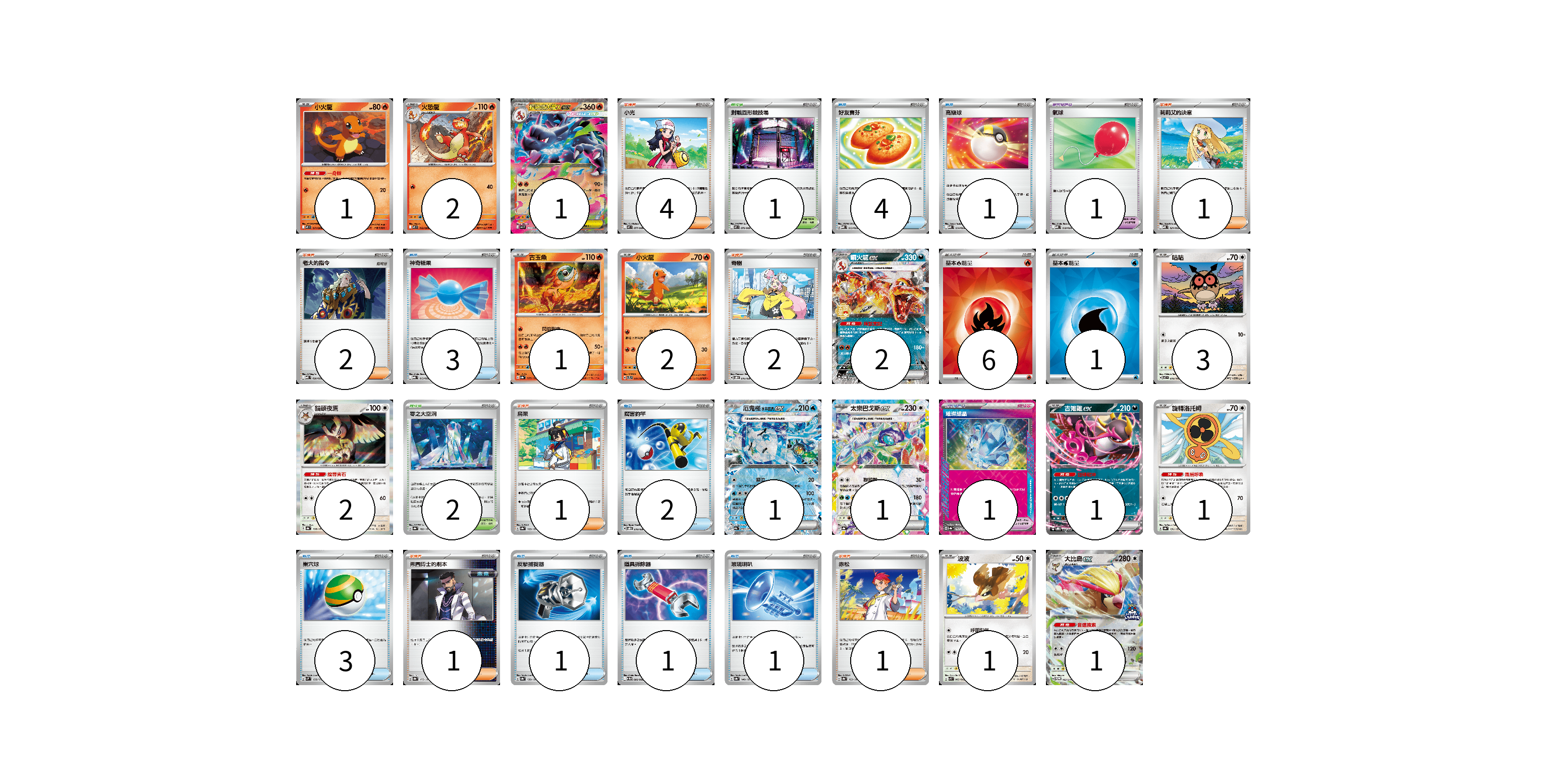 牌組構築方案 以此牌組為基礎新構築牌組 顯示卡面 顯示列表 寶可夢卡(20) 1 2 1 1 2 2 3 2 1 1 1 1 1 1 寶可夢道具(2) 1 1 物品卡(16) 4 1 3 2 3 1 1 1 支援者卡(12) 4 1 2 2 1 1 1 競技場卡(3) 1 2 能量卡(7) 6 1 寶可夢卡(20) 卡牌名稱 張數 卡牌名稱 張數 小火龍 M2 011/080 01 火恐龍 M2 012/080 02 超級噴火龍Xex M2 013/080 01 古玉魚 SV8a 025/187 01 小火龍 SVTL 001/021 02 噴火龍ex SV-P 166/SV-P 02 咕咕 SV7 076/102 03 貓頭夜鷹 SV8a 128/187 02 厄鬼椪 水井面具ex SV8a 050/187 01 太樂巴戈斯ex SV8a 136/187 01 吉雉雞ex SVOD 004/020 01 旋轉洛托姆 SV8a 131/187 01 波波 SVK 003/042 01 大比鳥ex SV-P 183/SV-P 01 寶可夢道具(2) 卡牌名稱 張數 卡牌名稱 張數 氣球 MBD 018/022 01 璀璨結晶 SV8a 152/187 01 物品卡(16) 卡牌名稱 張數 卡牌名稱 張數 好友寶芬 MBD 013/022 04 高級球 MBD 014/022 01 神奇糖果 MBG 013/022 03 厲害釣竿 SVOD 010/020 02 巢穴球 SVM 133/175 03 反擊捕捉器 SV8a 139/187 01 道具拆除器 SV11W 080/086 01 玻璃喇叭 SV8a 140/187 01 支援者卡(12) 卡牌名稱 張數 卡牌名稱 張數 小光 M2 077/080 04 莉莉艾的決意 MBD 021/022 01 老大的指令 MBD 020/022 02 奇樹 SVOD 016/020 02 烏栗 SV8a 169/187 01 弗圖博士的劇本 SV8a 175/187 01 赤松 SV8a 163/187 01 競技場卡(3) 卡牌名稱 張數 卡牌名稱 張數 對戰圓形競技場 M2 079/080 01 零之大空洞 SV8a 182/187 02 能量卡(7) 卡牌名稱 張數 卡牌名稱 張數 基本【火】能量 SVQL FIR 06 基本【水】能量 SVM WAT 01 以此牌組為基礎新構築牌組 牌組編碼 enXQyM-Upemvm-dArTZS copy 列印牌組單 牌組編碼已複製 分享至SNS